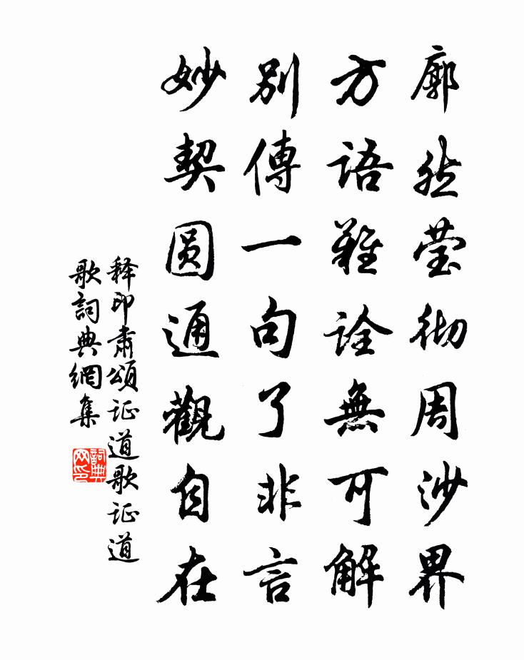 詩詞名句歷史字典書法欣賞書法字典國語詞典說文解字康熙字典古漢語字典標 題 作 者 詩 句 頌證道歌證道歌作者:釋印肅 朝代:宋代頌證道歌證道歌原文廓然瑩徹周沙界,方語難詮無可解。別傳一句了非言,妙契圓通觀自在。詩詞問答問:頌證道歌證道歌的作者是誰?答:釋印肅問:頌證道歌證道歌寫於哪個朝代?答:宋代釋印肅頌證道歌證道歌書法欣賞頌證道歌證道歌書法作品詩詞推薦剡縣次韻張兼夜月聯句陳著〔宋代〕停棹即階除,空明一銳如。飛毫僵庶可,吐句走靈舒。鬧里自靜好,公餘相起居。愛君情款密,裨我事迂疏。念念月波樓葉適〔宋代〕下林百果春自花,屋藏汀陰泉著沙。光風膩雪誰汝惜。繁紅蜜翠空欹斜。愛君樓高出江上,百里江山開四向。峻屏京丞相輓詩王炎〔宋代〕嗣聖登皇極,真儒秉大鈞。三宮方愷樂,萬宇浸熙淳。碧落龍髯去,青山馬鬣新。衣冠同墮淚,桃李失陽春。隆佑太后輓歌辭三首劉子翬〔宋代〕三朝欽母訓,四海被仁風。倉卒垂簾政,艱難取日功。仙遊睽懿範,孝慕慘皇衷。寢隧休華飾,靈輀必返嵩。高宗皇帝輓詞林栗〔宋代〕兼愛無南北,全能冠古今。典墳供夜覽,烽火自宵沉。睿藻成章煥,宸鈞寓意深。萬年垂琬琰,誰識至仁心。次韻魯參政觀潮柳貫〔元代〕怒潮卷雪過樟亭,人立西風酒旆青。日轂行天淪左界,地機激水出東溟。倒排山嶽窮千變,闔辟雲雷竦百靈。望海導引(加上太上皇帝太上皇后尊號冊寶樂章(淳熙二年)周必大〔宋代〕新陽初應,樂事起彤庭。和氣滿吳京。帝家來慶東皇壽,西母共長生。金書玉篆燦龍文。前導沸歡聲。修齡無極名藍上茅茨期王維補闕儲光羲〔唐代〕山中人不見,雲去夕陽過。淺瀨寒魚少,叢蘭秋蝶多。老年疏世事,幽性樂天和。酒熟思才子,溪頭望玉珂。逍遙詠宋太宗〔宋代〕猶龍景象駕翔鸞,道在虛無天地間。一二合將歸大禮,五千言外不開關。儀形眇邈難相類,聖跡希夷語默閒。昔日挽真西山二首曾極〔宋代〕雲出西山雨未成,已聞華表鶴飛鳴。聲名未必少黃霸,禮樂正緣無孔明。天下已傳新宰相,胸中不改舊書生。寒蟾菩薩蠻蘇軾〔宋代〕濕雲不動溪橋冷。嫩寒初透東風影。橋下水聲長。一枝和月香。人憐花似舊。花比人應瘦。莫憑小欄乾。夜深花正興元府園亭雜詠四照亭文同〔宋代〕巒嶺附梁山,汀洲隨漢水。秋容上屏障,左右二百里。此景誰能論,殘霞獨憑几。病中書事上集賢錢侍郎王禹偁〔宋代〕食貧當歲旱,朝退百端憂。典笏逢休假,焚香願有秋。病飢渾厭肉,瘦冷未更裘。夢見山村興,披蓑釣亂流。南歌子陳曄〔宋代〕腰下重金貴,眉間一點黃。定知從此慶非常。況有陰功宜壽、等天長。乞得仙家酒,來稱誕日觴。乃翁阿母醉何妨次吳友梅假山韻楊公遠〔宋代〕石骨嵌岩聳怪形,主人對此快詩情。若教老筆來模倣,盤礴終朝畫不成。高峰妙長老頂相沈一居士請贊釋可湘〔宋代〕去卻一,拈得七。拶破疑團,咄咄咄。跳上天目山,據卻獅子窟。返擲有餘態,江湖聲響出。且喜吾家有此郎,賽題孫棨詩後王福娘〔唐代〕苦把文章邀勸人,吟看好個語言新。雖然不及相如賦,也直黃金一二斤。三疊劉克莊〔宋代〕脂粉形容總未然,高標端可配先賢。不陪嚴子羊裘後,即傍王郎麈尾邊。奉和族祖紫嚴翁謾興十首汪炎昶〔宋代〕地稈山故崇,河黃濟故清。彼豈超然中,但婢吾無能。我家壁中書,不知相牛經。江邊客舍熊禾〔宋代〕輕寒無賴入征裘,野水閒雲總是愁。極目遠山橫靄外,數聲鳴櫓過苹洲。名句推薦薊城通漠北,萬里別吾鄉。李頎《古塞下曲》 誰人背後無人說,哪個人前不說人?佚名《增廣賢文·上集》 又是羊車過也,月明花落黃昏黃升《清平樂·宮怨》 將軍角弓不得控,都護鐵衣冷難著。岑參《白雪歌送武判官歸京》 思來江山外,望盡煙雲生。張九齡《秋晚登樓望南江入始興郡路》 今年對花最匆匆,相逢似有恨,依依愁悴。周邦彥《花犯·小石梅花》 勿營華屋,勿謀良田。朱柏廬《朱子家訓·全文》 天容水色西湖好,雲物俱鮮。歐陽修《採桑子·天容水色西湖好》 輕汗微微透碧紈,明朝端午浴芳蘭。蘇軾《浣溪沙·端午》 不聞不若聞之,聞之不若見之,見之不若知之,知之不若行之。學至於行之而止矣。荀子《荀子·儒效》