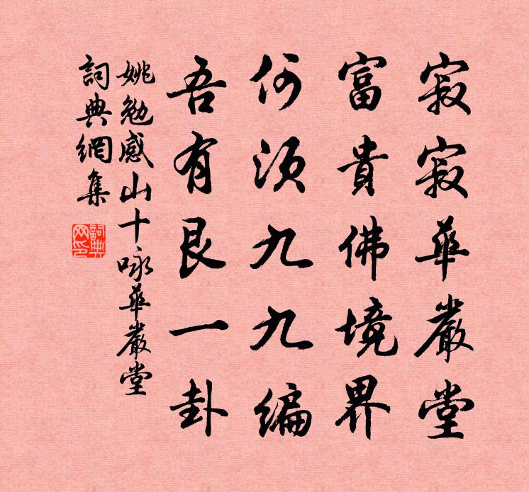 詩詞名句歷史字典書法欣賞書法字典國語詞典說文解字康熙字典古漢語字典標 題 作 者 詩 句 感山十詠華嚴堂作者:姚勉 朝代:宋代感山十詠華嚴堂原文寂寂華嚴堂,富貴佛境界。何須九九編,吾有艮一卦。詩詞問答問:感山十詠華嚴堂的作者是誰?答:姚勉問:感山十詠華嚴堂寫於哪個朝代?答:宋代姚勉感山十詠華嚴堂書法欣賞感山十詠華嚴堂書法作品詩詞推薦白下亭馬之純〔宋代〕白下非今白下亭,府城西北舊曾城。石山四面若環合,江水一條如帶橫。庾亮憑高臨賊騎,安都間道走齊兵。地形別吳荊溪衛涇〔宋代〕八載江湖甫召還,深言應又忤天顏。九重不見饑民色,只看先生兩鬢間。不睡文天祥〔宋代〕頻搔白首強憂煎,細雨青燈思欲顛。南北東西三萬里,古今上下幾千年。只因知事翻成惱,未到放心那得眠。眼不和陸務觀惠五言楊萬里〔宋代〕官縛春無分,髯疏雪更欺。雲間隨詞客,事外得心期。我老詩全退,君才句總宜。一生非浪苦,醬瓿會相知。江東報英烈擬封二字侯喜成三絕錢時〔宋代〕胡塵明越連焦土,海道溫台暫翠華。西溯濤江渠叵測,不知豪傑起山家。七盤嶺阻寇聞李端公先到南楚錢起〔唐代〕日暮窮途淚滿襟,雲天南望羨飛禽。阮腸暗與孤鴻斷,江水遙連別恨深。明月既能通憶夢,青山何用隔同心。秦楚聽客話澶淵事張耒〔宋代〕憶昔胡來動河朔,渡河飲馬吹鬍角。澶淵城下冰載車,邊風蕭蕭千里余。城上黃旗坐真主,夜遣六丁張猛弩。雷驚淮西司空圖〔唐代〕鰲冠三山安海浪,龍盤九鼎鎮皇都。莫夸十萬兵威盛,消個忠良效順無。題秩巴寨朱汝賢〔宋代〕十大曲破寰海知,六么對舞纖腰肢。秩巴古寨士解圍,譜傳建業隆興時。天匏作腔豺臠皮,竹撩裊繞疊指麾。慢曲白馬篇曹勛〔宋代〕白馬何翩翩,況復值神武。逸足看夷猶,四足入風雨。右盼空流沙,左歷無全虜。中夜視房心,趣目翻霞舉。朝飲仁於庵陳造〔宋代〕{禾罷}稏圍僧屋,檀欒隔槿籬。月池聊濯足,雪壁剩留詩。里社皆囷廩,鍾魚亦歲時。平生松隱賦,回首十年遲忠州荔枝樓小憩汪元量〔宋代〕竟日揚鞭不暫閒,畏途疊疊是青山。西風吹落忠州去,錦繡窠中屋萬間。贈丐士陸游〔宋代〕志士寧聞畢世窮,此間從古混蛇龍。尚能忍恥墦間祭,安用追慚飯後鍾?晚歸張耒〔宋代〕學省歸來門巷秋,伴眠書史滿床頭。低雲漠漠梧桐晚,屏上江山亦解愁。石州城武元衡〔唐代〕丈夫心愛橫行,報國知嫌命輕。樓蘭徑百戰,更道戍龍城。錦字竇車騎,胡笳李少卿。生離兩不見,萬古難為情。海市(並敘)蘇軾〔宋代〕予聞登州海市舊矣,父老雲常出於春夏,今歲晚不復見矣。予到官五日而去,以不見為恨,禱于海神廣德王之廟,復和呈莫仲篪高質齋〔宋代〕溪石繡 * ,溪風飄晚涼。坐久得自若,物外知誰忙。渴飲竹泉冷,飢飯松花香。春光忽雲暮,□□□□陽。鄭惠叔閣學守建寧三首袁說友〔宋代〕周這士也貴,如圭璧璠璵。東陝與南土,出入本裕如。高冠不可羈,位次實有餘。輕此一葉舟,孰肯戲魯儒。自公答櫟下先生吳嘉紀〔清代〕窮冬伏枕何人問?櫟下先生寄我詩。遠問只愁身便死,憐才幾見淚沾頤。吟成梁甫徒增慨,老遇鍾期不厭遲。冰雪元會詩宋祁〔宋代〕寶典叢三朔,中闈闢九閽。群臣深拱寧,列仗儼屯門。輦出東房秘,辰居北極尊。熊羆連案負,日月傍旗翻。名句推薦戲馬台南山簇簇,山邊飲酒歌別曲。張籍《送遠曲》 淇水昨送淚沾巾,紅妝宿昔已應新蕭子顯《春別詩四首·其三》 書不盡言,言不盡意。佚名《易傳·繫辭傳上·第十二章》 青苔滿階砌,白鳥故遲留。杜牧《題揚州禪智寺》 舉頭紅日近,回首白雲低。寇準《詠華山》 草色煙光殘照里,無言誰會憑闌意。柳永《蝶戀花·佇倚危樓風細細》 燒痕慘澹帶昏鴉,數盡寒梅未見花。陳孚《詠永州》 明朝寒食了,又是一年春。顧太清《臨江仙·清明前一日種海棠》 瓊樓玉宇。分明不受人間暑。尋常豈是無三五。郭應祥《醉落魄·丙寅中秋》 金帶連環束戰袍,馬頭沖雪度臨洮。馬戴《出塞詞》