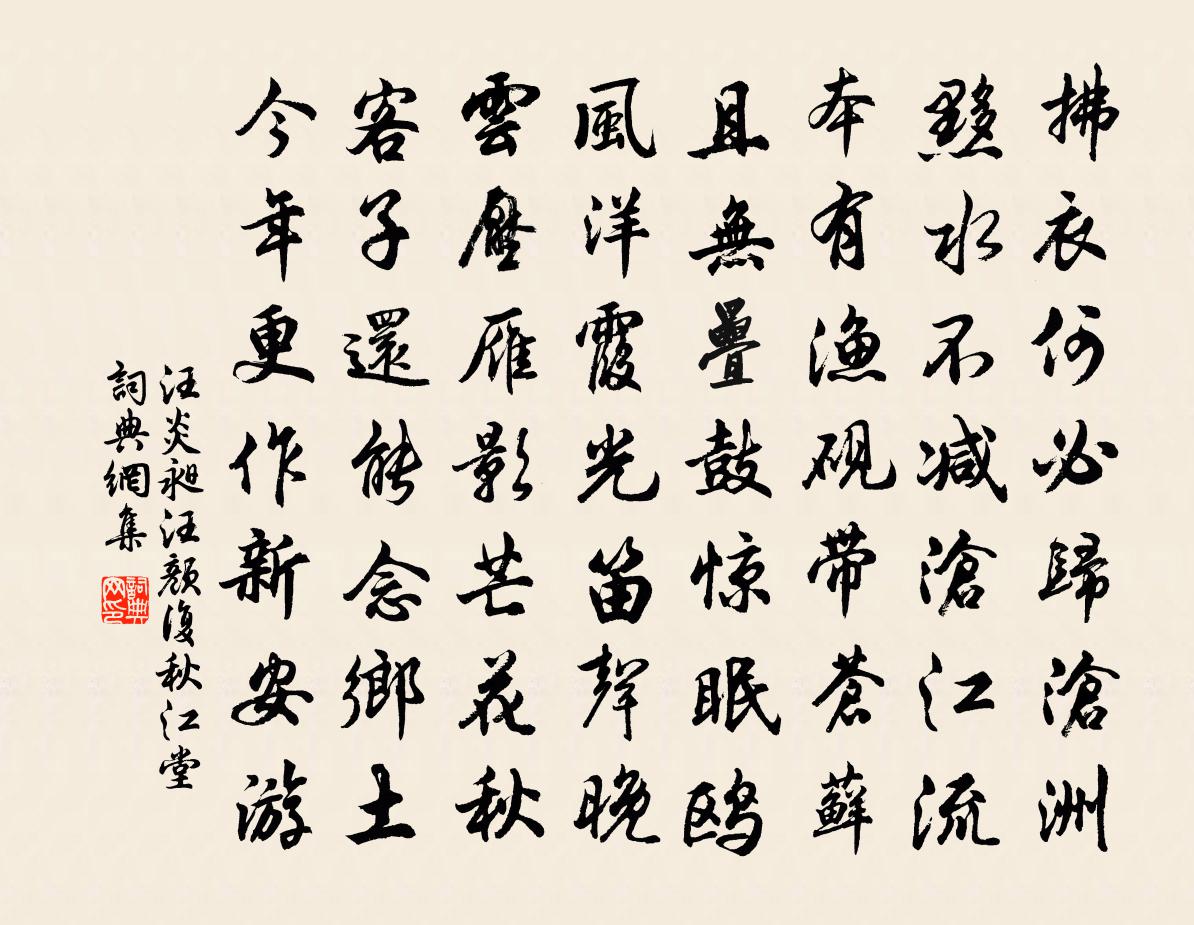 詩詞名句歷史字典書法欣賞書法字典國語詞典說文解字康熙字典古漢語字典標 題 作 者 詩 句 汪顏復秋江堂作者:汪炎昶 朝代:宋代汪顏復秋江堂原文拂衣何必歸滄洲,黟水不減滄江流。本有漁硯帶蒼蘚,且無疊鼓驚眠鷗。風洋霞光笛聲晚,雲壓雁影芒花秋。客子還能念鄉土,今年更作新安游。詩詞問答問:汪顏復秋江堂的作者是誰?答:汪炎昶問:汪顏復秋江堂寫於哪個朝代?答:宋代汪炎昶汪顏復秋江堂書法欣賞汪顏復秋江堂書法作品詩詞推薦送韋書記歸京(座主侍郎同舉)杜荀鶴〔唐代〕韋杜相逢眼自明,事連恩地倍牽情。聞歸帝里愁攀送,知到師門話姓名。朝客半修前輩禮,古人多重晚年榮。從來和呂吏部觀延慶院李唐畫山水李復〔宋代〕道人曾去禮清涼,幻 * 出翠壁光。聞說幻師能幻幻,煙雲草樹攝他方。戒珠寺右軍宅柴望〔宋代〕蒼樹寒煙兩渺茫,後來誰此吊興亡。晉朝風物今流水,蕭寺鐘聲幾夕陽。話燕梁空春雨急,愛鵝人去暮山長。學書萬壽寺主僧圓鑒留酒醉中陳著〔宋代〕人世一漚浮,時光如瞬流。相違十年久,偶見兩心稠。法嗣驚初意,香廚出異羞。那知年到此,不枉少遲留。臨江仙李煜〔唐代〕秦樓不見 * 女,空餘上苑風光。粉英含蕊自低昂,東風惱我,才發一衿香。瓊窗夢□留殘月,當年得恨何長。碧菖蒲裘萬頃〔宋代〕康廬入吾懷,十載馳夢魂。踵門者何人,遺予以芳蓀。歡然得其趣,如對五老言。幽資出嚴谷,常帶冰雪痕。塵容送耿湋拾遺聯句顏真卿〔唐代〕堯舜逢明主,嚴徐得侍臣。分行接三事,高興柏梁新。 ——顏真卿楚國千山道,秦城萬里人。鏡中看齒髮,河上題石室庵前竹上朱真靜〔宋代〕十年身與鬼為鄰,曾見岩花幾度春。莫怪柴門終日閉,怕將塵事惱間人。秋色橫空元好問〔金代〕松液香凝。澹幽姿一洗,若下宜城。甘腴小苦中山賦,千古齒頰春生。燈花喜,缸面清。愛竹港、冰泉落枕聲。恰書閏師白蓮堂魏野〔宋代〕野人禪客合相陪,漸老詩心亦共灰。朱草階前容不去,白蓮常上喜頻來。地形各占幽深境,天產俱為散逸材。猶恨正月二十二日晚過袁父趙蕃〔宋代〕籬落桃花小破紅,野田細雨又微風。莫嗤款段行難進,正要尋詩漠漠中。大父令賦舊扇蘇籀〔宋代〕裁紈當團扇,當暑不離手。炎涼一推遷,委擲昏塵垢。蒙蒙縈蛛網,闇闇迷遠岫。人情逐時移,浪自分好醜。一朝田家三首張耒〔宋代〕社南村酒白如餳,鄰翁宰牛鄰媼烹。插花野婦抱兒至,曳杖老翁扶背行。淋漓醉飽不知夜,裸股掣肘時歡爭。去年禪人並化主寫真求贊釋正覺〔宋代〕皴皮似雞,疏齒如鯢。諸緣坐斷,一句全提。夜月圓明兮珊瑚海闊,晚雲破碎兮玳瑁天低。胡不歸二首高吉〔宋代〕煢煢盪子妻,空房守幽獨。 * 心緒長,吞聲忍夜哭。背燈耿孤影,香冷雲幕低。絕憐屋上烏,替人嗚嗚啼。古意王銍〔宋代〕歌聲怨極珠難續,琴韻愁深水易分。公子何須賦巫峽,夢中真復有朝雲。禪人請贊釋鹹傑〔宋代〕水黑染成,恰似真箇。據坐胡床,胡揮亂做。三十年後,此話大行。籍沒乃翁,膠黏滯貨。次韻李竹塢懷古馬廷鸞〔宋代〕寶錄炎圖未百年,神徂聖伏一悽然。徵先生起淹中禮,與老人期圯上編。柯爛不驚人換世,瓢空獨樂士希賢。昌黎太碩人潘氏輓詞樓鑰〔宋代〕玉映清心著壺彜,閨房賓敬到齊眉。豈惟山水協高趣,更為國家生好兒。萬口共推諸福備,八旬猶負一年期。伯仁金山妙高台蘇軾〔宋代〕我欲金山乘飛車,金山東訪赤松金山子。蓬萊不可到,弱水三萬里。不如金山去,清風半帆耳。中有妙高台,雲峰名句推薦暗數十年湖上路,能幾度,著娉婷。盧祖皋《江城子·畫樓簾暮卷新晴》 理郁者苦貧,辭溺者傷亂劉勰《文心雕龍·神思》 不肯畫堂朱戶,春風自在楊花。王安國《清平樂·春晚》 虎踞龍蟠何處是,只有興亡滿目。辛棄疾《念奴嬌·登建康賞心亭呈史致道留守》 為學不外靜敬二字,教人先去驕惰二字。王永彬《圍爐夜話·第一四八則》 傷心千里江南,怨曲重招,斷魂在否?吳文英《鶯啼序·春晚感懷》 公生明,偏生暗荀子《荀子·不苟》 北風其喈,雨雪霏霏,惠而好我,攜手同。劉向《列女傳·辯通傳·楚處莊侄》 脫鞍暫入酒家壚,送君萬里西擊胡岑參《送李副使赴磧西官軍》 寵錫從仙禁,光華出漢京。張九齡《奉和聖制送尚書燕國公赴朔方》