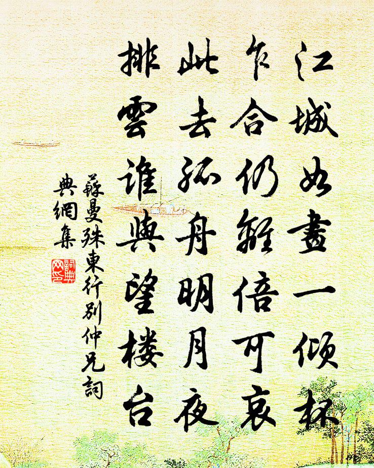 詩詞名句歷史字典書法欣賞書法字典國語詞典說文解字康熙字典古漢語字典標 題 作 者 詩 句 東行別仲兄作者:蘇曼殊 朝代:近現代東行別仲兄原文江城如畫一傾杯,乍合仍離倍可哀。 此去孤舟明月夜,排雲誰與望樓台。詩詞問答問:東行別仲兄的作者是誰?答:蘇曼殊問:東行別仲兄寫於哪個朝代?答:近現代書法欣賞東行別仲兄書法作品詩詞推薦酬趙季茂遣餉松實鰻鮆柔魚岳珂〔宋代〕掀天吹浪九夷東,維錯分珍意倍濃。越井戲沙形酷似,秦囊遺算墨猶封。色欺金嫩三江鮆,實比瓊酥十丈松。珍重喚仙閣樓鑰〔宋代〕多少尋仙更不還,渺茫竟墮有無閒。使其真有毋庸喚,仙自曾城我自山。定風波(一·瓮城)仲殊〔宋代〕南徐好,鼓角亂雲中。金地浮山星雨點,鐵城橫鎖瓮三重。開國舊夸雄。春過後,佳氣盪晴空。淥水畫橋沽酒市,奚山道中蘇頌〔宋代〕山路縈迴極險難,才經深澗又高原。順風衝激還吹面,灩水堅凝幾敗轅。岩下有時逢虎跡,馬前頻聽異華言。使行出戶方翥〔宋代〕出戶春光刮眼明,遠雲遲日慶初晴。偶來傍樹尋梅子,時聽新蟬葉底聲。春夢楊衡〔唐代〕空庭日照花如錦,紅妝美人當晝寢。傍人不知夢中事,唯見玉釵時墜枕。邀涼亭五首彭龜年〔宋代〕勸節不可拗,淨色不受污。平生今日交,屹屹老桂樹。白菊許棠〔唐代〕所尚雪霜姿,非關落帽期。香飄風外別,影到月中疑。發在林凋後,繁當露冷時。人間稀有此,自古乃無詩。南浦篇孟郊〔唐代〕南浦桃花亞水紅,水邊柳絮由春風。鳥鳴喈喈煙濛濛,自從遠送對悲翁。此翁已與少年別,唯憶深山深谷中。安樂窩中酒一樽邵雍〔宋代〕安樂窩中酒一樽,非唯養氣又頤真。頻頻到口微成醉,拍拍滿懷都是春。何異君臣初際會,又同天地乍絪紜。醺酣過信州高克恭〔元代〕二千里地佳山水,無數海棠官道傍。風送落紅攙馬過,春風更比路人忙。靈隱觀風亭雪磯小酌顧逢〔宋代〕林巒深密地,怪石紫苔存。留得巉岩勢,全無斧鑿痕。浮雲沉水底,落葉走山根。最喜傾杯處,高僧遇 * 。寄題成都張宰壓雲樓二絕洪咨夔〔宋代〕清霜戒曉日將出,急雨報晴雲乍開。庭下簿書渾引卻,獨揩雙眼上樓來。俞延禧進古澗松以詩賜之宋孝宗〔宋代〕犖确奔流瀉玉虹,凜然雲乾擬蟠空。紅塵車馬稠如織,夢入蒼煙萬壑風。初霜洪咨夔〔宋代〕庭下曉來霜,菰頓芭蕉折。絡石瘦菖莆,獨抱青青節。少卿直閣鄭公輓歌詞范成大〔宋代〕今代魁梧老,終身寂寞濱。鬢霜三館直,碑淚五州春。壽相空壬甲,行年竟巳辰。墳丘才馬鬣,何處著經綸。憶昨物我兩忘釋智愚〔宋代〕居常多不器,情為盡方知。有眼掛空壁,無心合祖師。衲穿隨手補,客至下階遲。或問虛常叟,殷勤說向伊。春日與王右丞過新昌里訪呂逸人不遇裴迪〔唐代〕恨不逢君出荷蓑,青松白屋更無他。陶令五男曾不有,蔣生三徑枉相過。芙蓉曲沼春流滿,薜荔成帷晚靄多。聞說甲辰九月初訪晦庵先生大安道中余正叔韻陳文蔚〔宋代〕瀟瀟風露菊花秋,人在甌閩第一州。少日已嘗懷壯志,今朝端不負清游。陪君數日從容語,洗我平生散亂愁。從此句侯延慶〔宋代〕長沙雄富冠江關,百萬樓台綠柳間。名句推薦雪暗凋旗畫,風多雜鼓聲。楊炯《從軍行》 江上往來人,但愛鱸魚美范仲淹《江上漁者》 果仁者,人多畏,言不諱,色不媚。李毓秀《弟子規·親仁》 歌沉玉樹,古寺空有疏鍾發。李綱《六么令·次韻和賀方回金陵懷古鄱陽席上作》 金風細細。葉葉梧桐墜。晏殊《清平樂·金風細細》 算陰晴,渾似幾番,渭城故人離會。吳文英《永遇樂·乙巳中秋風雨》 朱顏那有年年好,逞艷游、贏取如今韓疁《高陽台·除夜》 側見雙翠鳥,巢在三珠樹張九齡《感遇十二首·其四》 去來江口守空船,繞船月明江水寒。白居易《琵琶行 / 琵琶引》 蕭條清萬里,瀚海寂無波。李白《塞上曲》