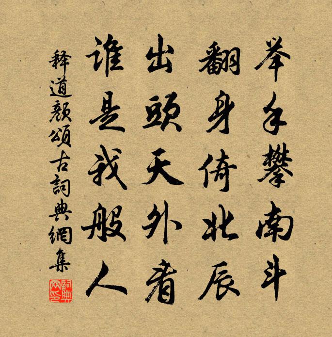 詩詞名句歷史字典書法欣賞書法字典國語詞典說文解字康熙字典古漢語字典標 題 作 者 詩 句 頌古作者:釋道顏 朝代:宋代頌古原文舉手攀南斗,翻身倚北辰。出頭天外看,誰是我般人。詩詞問答問:頌古的作者是誰?答:釋道顏問:頌古寫於哪個朝代?答:宋代釋道顏頌古書法欣賞頌古書法作品詩詞推薦登樓寓望劉兼〔唐代〕憑高多是偶汍瀾,紅葉何堪照病顏。萬疊雲山供遠恨,一軒風物送秋寒。背琴鶴客歸松徑,橫笛牛童臥蓼灘。獨倚政和親郊三首仁宗〔宋代〕於皇順祖,積德累祥。發源深厚,不耀其光。基天明命,劂後克昌。是孝是享,申錫無疆。茅山贈洪(一作贈高洪)拾遺方乾〔唐代〕新地諫臣停諫舌,求歸故里傲雲霞。溪頭講樹纜漁艇,篋里朝衣輸酒家。但愛身閒辭祿俸,那嫌歲計在桑麻。我來酬令狐郎中見寄李商隱〔唐代〕望郎臨古郡,佳句灑丹青。應自丘遲宅,仍過柳惲汀。封來江渺渺,信去雨冥冥。句曲聞仙訣,臨川得佛經。朝吟夕次圃田店祖詠〔唐代〕前路入鄭郊,尚經百餘里。馬煩時欲歇,客歸程未已。落日桑柘陰,遙村煙火起。西還不遑宿,中夜渡涇水。偈頌六首釋深〔宋代〕一九二九,相逢不出手。三九二十七,籬頭吹觱篥。翻憶小釋迦,雙手抱屈膝。知不知,實不實,摩訶般若波羅蜜送襄州任別駕岑參〔唐代〕別乘向襄州,蕭條楚地秋。江聲官舍里,山色郡城頭。莫羨黃公蓋,須乘彥伯舟。高陽諸醉客,唯見古時丘。採桑子馮延巳〔唐代〕馬嘶人語春風岸,芳草綿綿。楊柳橋邊,落日高樓酒旆懸。舊愁新恨知多少,目斷遙天。獨立花前,更聽笙歌滿畫寄題感應夫人廟方回〔宋代〕觀世音化馬郎婦,西王母嘲方朔兒。乾坤大幻萬千變,□我敬之而遠之。題錢舜舉寫生五首戲嬰圖陳深〔宋代〕秘矣宮中戲,人間那得窺。開圖付一笑,能不類兒嬉。月夜懷劉秀才元孚〔唐代〕獨夜相思但自勞,阮生吟罷夢雲濤。此時小定未禪寂,古塔月中松磬高。寄題安福朱景源景雲所居二首周必大〔宋代〕四始昭垂棠棣詩,九江屹立義門碑。請君更學張公藝,忍字常為一字師。喜晴有感呈晁郎張耒〔宋代〕山城窗淫雨霽窗,窗戶含窗余清。老人午睡足,杖策遶荒庭。長夏吾廬秀,清陰交眾榮。茫茫榛莽中,萱草揚其英掃松劉黻〔宋代〕西原百五日,寂寞故松阡。挑飯瘞黃土,酹觴焚紙錢。煙林窺老狖,雨島哭蠻鵑。舊植亭前桂,一年高一年。贈月長老蘇軾〔宋代〕天形倚一笠,地水轉兩輪。五霸之所運,毫端棲一塵。功名半幅紙,兒女浪苦辛。子有折足鐺,中容五合陳。十年送崔朝請通判徐州韓維〔宋代〕與君仍世接游從,造次相敦德義中。善繼家聲名你子,不追時好古人風。流光豈受垂繩系,妙道才容一線通。待得次韻仲秉見寄二首李流謙〔宋代〕別後年仍換,詩來語更工。音書恨不數,魂夢卻相通。草木春風后,關河夕照中。飛鴻不可倩,此意付筠筒。贈持缽道人陸游〔宋代〕青鐵作小冠,白紵縫短褐,右扶九節杖,左執七綴缽,何嘗有定止,到處可生活。惟有烈士心, * 不能奪。相逢經蘇秦墓賈島〔唐代〕沙埋古篆折碑文,六國興亡事系君。今日淒涼無處說,亂山秋盡有寒雲。頌證道歌證道歌釋印肅〔宋代〕百獸聞之皆腦裂,穿山透石魔群折。夜來依舊卓長空,飽清風,漱明月。名句推薦不知何處吹蘆管,一夜征人盡望鄉。李益《夜上受降城聞笛》 紛紛墜葉飄香砌。夜寂靜,寒聲碎。范仲淹《御街行·秋日懷舊》 風力雖尚勁,然徒步則汗出浹背。袁宏道《滿井遊記》 昔嘆當年無李牧,今知江左有夷吾陳亮《送文子轉漕江東二首》 窮不失義,達不離道。孟子《孟子·盡心章句上·第九節》 日歸功未建,時往歲載陰。陸機《猛虎行》 醉後滿身花影、倩人扶。晏幾道《虞美人·疏梅月下歌金縷》 猶余雪霜態,未肯十分紅。王十朋《紅梅》 士君子立言,貴平正,尤貴精詳。王永彬《圍爐夜話·第二五則》 故鄉今夜思千里,霜鬢明朝又一年。高適《除夜作》
