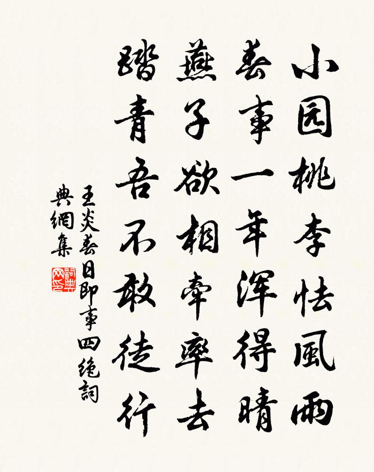詩詞名句歷史字典書法欣賞書法字典國語詞典說文解字康熙字典古漢語字典標 題 作 者 詩 句 春日即事四絕作者:王炎 朝代:宋代春日即事四絕原文小園桃李怯風雨,春事一年渾得晴。燕子欲相牽率去,踏青吾不敢徒行。詩詞問答問:春日即事四絕的作者是誰?答:王炎問:春日即事四絕寫於哪個朝代?答:宋代王炎春日即事四絕書法欣賞春日即事四絕書法作品詩詞推薦答王定國問疾蘇轍〔宋代〕五年竄南荒,頑質不伏病。吸清吐濁穢,氣練骨隨勁。澹然久忘歸,寂寂就遐屏。國恩念流落,牽挽畀鄰境。葉舟村夜杜甫〔唐代〕蕭蕭風色暮,江頭人不行。村舂雨外急,鄰火夜深明。胡羯何多難,漁樵寄此生。中原有兄弟,萬里正含情。和伯氏韻贈王元明元明舊親予叔行也今死於賊王洋〔宋代〕十分佳處限長液,人在空明靜□猜。水北結茅真好去,袖中漫刺為誰來。因嗟翳日塵凝榭,更吊沈槍臥綠苔。多少四快圖劉克莊〔宋代〕一人筅耳手不柱,一人坦背抓癢處。一人理髮虱禽獲,一人噴嚏虎驚去。余鼻久塞耳驟聾。虱無附麗頭已童。惟背子夜四時歌·春風動春心佚名〔南北朝〕春風動春心,流目矚山林。山林多奇采,陽鳥吐清音。樂章五曲李復〔宋代〕海日上天破苦霧,散香釃酒巫進舞,神在琵琶弦上語。載鸞旂,伐鼉鼓,驅豐隆,笑玉女,小雨班班點飛土。駕文鷓鴣天(壽康教)劉辰翁〔宋代〕白髮平津起袖然。燕飛定遠望生還。世間最有團欒樂,又是平平過一年。銀信近,玉鞭先。東來西去爵銜鱣。人生郴江百詠並序黃相山阮閱〔宋代〕東帶連山接五羊,西分郴水下三湘。路人到此休南去,嶺外千峰盡瘴鄉。客久董嗣杲〔宋代〕身孤猶落葉,客久向餉英。少睡夜逾悄,多聞心更清。縣樓訛漏點,雨市雜溪聲。海上仙槎在,思乘幾凝情。折梅方蒙仲〔宋代〕看梅如看畫,由我不由他。千樹江頭少,一枝瓶里多。飲酒擬柳子厚張耒〔宋代〕澤國多水氣,日西春尚寒。窮居無樂事,且復開清樽。一酌召和氣,三觴失愁顏。百憂如崩雲,天地為我寬。采采雜詠四首王安石〔宋代〕證聖南朝寺,三年到百回。不知牆下路,今日幾荷開。齋宮尚有殘雪思作學士時攝事於此嘗有聞◇詩歐陽修〔宋代〕詩篇自覺隨年老,酒力猶能助氣豪。興味不衰惟此爾,其餘萬事一牛毛。駱谷崔覲〔宋代〕高峰偃蹇雲崔巍,層崖巨壑長峽開。龍蛇縱橫虎豹亂,古棧朽裂埋深谷。相和歌辭。胡無人行徐彥伯〔唐代〕十月繁霜下,征人遠鑿空。雲搖錦更節,海照角端弓。暗磧埋砂樹,沖飆卷塞蓬。方隨膜拜入,歌舞玉門中。題僧邀梅和庵王洋〔宋代〕地接山腰舍繞泉,豐堂巍殿勢蟬聯。非禪非律三百輩,有圃有場千畝田。中坐獨尊司獄佛,幾前雜事地行仙。若無和單令自龍山迎月而歸胡寅〔宋代〕招提爐上寶香氳,問信浮屠作祖人。想得妙心同水鏡,故應歸路見冰輪。清輝萬里無窮雪,淨觀千山不隔塵。欲識吳中言情寄魯望皮日休〔唐代〕古來傖父愛吳鄉,一上胥台不可忘。愛酒有情如手足,除詩無計似膏肓。宴時不輟琅書味,齋日難判玉鱠香。為說李舍人少尹惠家醞一小榼立書絕句竇牟〔唐代〕禁瑣天漿嫩,虞行夜月寒。一瓢那可醉,應遣試嘗看。餞吳長文司理用修持賢業教無欠為韻裘萬頃〔宋代〕人生天地間,離別安能無。莫作兒女態,相期烈丈夫。名句推薦上窮碧落下黃泉,兩處茫茫皆不見。白居易《長恨歌》 人見利而不見害,魚見食而不見鉤。李汝珍《鏡花緣·第九十二回》 千層石樹遙行路,一帶山田放水聲。姚鼐《山行·布穀飛飛勸早耕》 盡做舊愁都忘卻,新愁何處著王庭筠《謁金門·雙喜鵲》 淚眼倚樓頻獨語。雙燕飛來,陌上相逢否?馮延巳《鵲踏枝·幾日行云何處去》 柔情似水,佳期如夢,忍顧鵲橋歸路。秦觀《鵲橋仙·纖雲弄巧》 春陽如昨日,碧樹鳴黃鸝。李白《秋思》 雪霜凌厲而見殺,來歲不改其性也黃庭堅《書幽芳亭記》 光景不勝閨閣恨,行行坐坐黛眉攢。閻選《八拍蠻·雲鎖嫩黃煙柳細》 雪似梅花,梅花似雪。似和不似都奇絕。呂本中《踏莎行·雪似梅花》