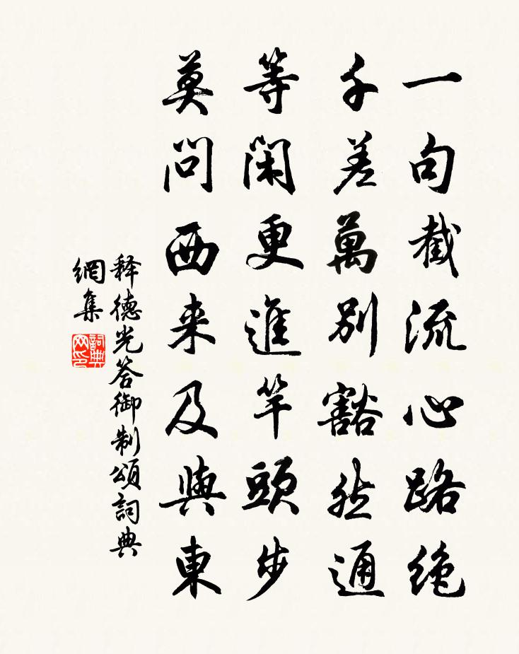 詩詞名句歷史字典書法欣賞書法字典國語詞典說文解字康熙字典古漢語字典標 題 作 者 詩 句 答御製頌作者:釋德光 朝代:宋代答御製頌原文一句截流心路絕,千差萬別豁然通。等閒更進竿頭步,莫問西來及與東。詩詞問答問:答御製頌的作者是誰?答:釋德光問:答御製頌寫於哪個朝代?答:宋代釋德光答御製頌書法欣賞答御製頌書法作品詩詞推薦送章氏兄弟兼寄金山寧禪師陳師道〔宋代〕末塗一過馬群空,老眼雙瞻碣石鴻。固有江東兼渭北,其如明月與清風。一官羈絆吾堪老,萬里嫖姚子未窮。寄語代人乞花李益〔唐代〕繡戶朝眠起,開簾滿地花。春風解人意,欲落妾西家。和育王十二題育王塔李覯〔宋代〕嘗聞有為法,佛說如夢幻。胡然座堵波,香花耀凡眼。檄充晉康考官舟行薄暮霞光與水相映緬懷諸幕曾豐〔宋代〕同幕時相敘,清談到夜分。一朝才被檄,兩處便拘文。未學歸巢雁,猶為出岫雲。南中不聞雁,有雁不堪聞。春日烏延道中許棠〔唐代〕邊窮厄未窮,復此逐歸鴻。去路多相似,行人半不同。山川藏北狄,草木背東風。虛負男兒志,無因立戰功。念奴嬌(二和)劉克莊〔宋代〕並游英俊,從頭數、富貴消磨誰紀。道眼看來,嘆人生如寄,家如旅邸。教婢羹藜,課奴種韭,聊誑殘牙齒。草堂寄紫閣無名頭陀(自新羅來)姚合〔唐代〕峭行得如如,誰分聖與愚。不眠知夢妄,無號免人呼。山海禪皆遍,華夷佛豈殊。何因接師話,清淨在斯須。送嚴明府入關謁黎京兆皎然〔唐代〕春日異秋風,何為怨別同。潮回芳渚沒,花落晝山空。旅候聞嘶馬,殘陽望斷鴻。應思右內史,相見直城中。昭君辭應詔庾信〔南北朝〕斂眉光祿塞。還望夫人城。片片紅顏落。雙雙淚眼生。冰河牽馬渡。雪路抱鞍行。胡風入骨冷。夜月照心明。方調點絳唇(和向薌林木犀)楊無咎〔宋代〕借問嫦娥,當初誰種婆娑樹。空中呈露。不墜凡花數。卻愛薌林,便似蟾宮住。清如許。醉看歌舞。同在高寒處。綠頭鴨 大圓覺海王吉昌〔元代〕混融成。大圓覺海崢嶸。性珠顯、恢弘祖意,慧風通、虛谷傳神。有中無、無中有有,應變處、廓爾縱橫。坦蕩融句蔣雝〔宋代〕入寺門圍玉帶水。滿江紅葉夢得〔宋代〕雪後郊原,煙林靜、梅花初坼。春欲半,猶自探春訊息。一眼平蕪看不盡,夜來小雨催新碧。笑去年、攜酒折花人句李柬之〔宋代〕下客拋官獨自回。聲聲慢(寄葉書隱)張炎〔宋代〕百花洲畔,十里湖邊,沙鷗未許盟寒。舊隱琴書,猶記渭水長安。蒼雲數千萬疊,卻依然、一笑人間。似夢裡,對和鄭季南喜雪陽枋〔宋代〕避地身窮道不窮,溪山好處句尤工。水仟會得人心意,妝點茅茨畫軸中。同繼祖民瞻游賦詩亭二首陳與義〔宋代〕邂逅今朝一段奇,從來華屋不關詩。諸君且作留連意,正是微風到竹時。三學院王投〔宋代〕精藍本是真人宅,疊嶂今古釋子山。綠樹不妨丹鶴下,白雲常伴老僧閒。無風木任秋蟬蔭,積雨庭多石蘚斑。儒客送董揚休比部知真州蘇轍〔宋代〕奏課西南最,分符江海沖。往來觀惠術,蟠錯試余鋒。文字從堆案,樽罍強解容。金山只隔水,時復聽晨鐘。舟泊蘄城下董嗣杲〔宋代〕秋蕪埋戌雨,暮荻卷壕風。禦侮弓刀利,揚威鼓角雄。雲連淮樹暗,月透漢營空。捩柁資遐眺,興衰自古同。名句推薦琵琶金翠羽,弦上黃鶯語。韋莊《菩薩蠻》 素衣莫起風塵嘆,猶及清明可到家。陸游《臨安春雨初霽》 取之非易,守之尤艱;智不足弗得,謀有失竟患,死生事也。來俊臣《羅織經·控權卷第四》 曾把芳心深相許。故夢勞詩苦。史達祖《留春令·詠梅花》 人無喜事精神減,運到窮時落寞多。馮夢龍《警世通言·卷二十五》 知人者智,自知者明。老子《老子·道經·第三十三章》 湖光秋月兩相和,潭面無風鏡未磨。劉禹錫《望洞庭》 江漢曾為客,相逢每醉還。韋應物《淮上喜會梁川故人 / 淮上喜會梁州故人》 殘螢棲玉露,早雁拂金河。許渾《早秋三首·其一》 壯年何事憔悴,華發改朱顏。蘇舜欽《水調歌頭·滄浪亭》