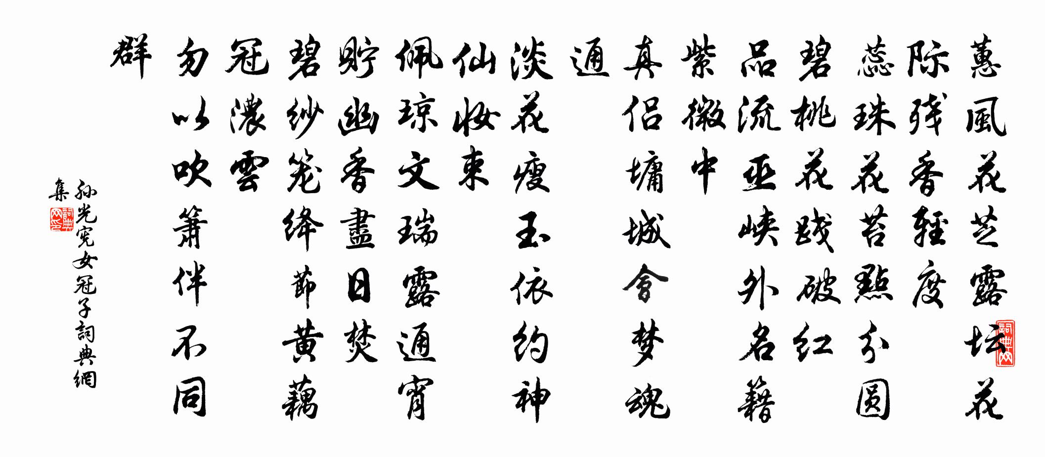 蕙風花芝露,壇花際殘香輕度。蕊珠花,苔點分圓碧,桃花踐破紅。
