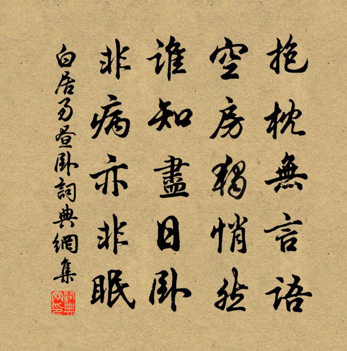 詩詞名句歷史字典書法欣賞書法字典國語詞典說文解字康熙字典古漢語字典標 題 作 者 詩 句 晝臥作者:白居易 朝代:唐代晝臥原文抱枕無言語,空房獨悄然。誰知盡日臥,非病亦非眠。詩詞問答問:晝臥的作者是誰?答:白居易問:晝臥寫於哪個朝代?答:唐代問:晝臥是什麼體裁?答:五絕問:白居易的名句有哪些?答:白居易名句大全白居易晝臥書法欣賞晝臥書法作品注釋全唐詩詩詞推薦七月十一日見落葉陸游〔宋代〕葉雕非一日,盛夏則已然,一葉復一葉,及此搖落天。晨起坐堂上,散若飛鳥翩,昔時可藏鴉,今欲不庇蟬。顧視枕上作陸游〔宋代〕蕭蕭白髮臥扁舟,死盡中朝舊輩流。萬里關河孤枕夢,五更風雨四山秋。鄭虔自笑窮耽酒,李廣何妨老不侯。猶有樂府曹植〔魏晉〕魴{月雋}熊掌。豹胎龜腸。贈張繪秘教九題詩筒林逋〔宋代〕唐賢存雅制,詩筆仰防閒。遞去權應緊,封回債已還。帶班猶恐俗,和節不妨山。酒篋將書簏,誰言季孟間。應天院朝拜回呈景仁司馬光〔宋代〕雞鳴上馬過河橋,何異東都赴早朝。紅日已高猶熟寢,比君殊未得逍遙。四望亭觀荷花姚勉〔宋代〕面面湖光面面風,可人最是白芙蓉。分明飛下雙雙鷺,才到花邊不見蹤。自笑仇遠〔宋代〕謁客登門不敢嗔,強顏應按暫時親。一官本自如冰冷,更有依冰借暖人。橫吹曲辭關山月盧照鄰〔唐代〕塞垣通碣石,虜障抵祁連。相思在萬里,明月正孤懸。影移金岫北,光斷玉門前。寄書謝中婦,時看鴻雁天。菩薩蠻(酒半戲成)韓淲〔宋代〕秋林只共秋風老。秋山卻笑秋吟少。恰恨有秋香。青岩秋夜涼。清秋須是酒。結客秋知否。醉筆寫成秋。一秋無復微疾陸游〔宋代〕微疾經旬近藥囊,往來巷陌未全妨。時時小雨知春近,處處閒身覺日長。林外鼓歌聞賽廟,懷中茶餅議租桑。兩京挽丘大卿二首劉克莊〔宋代〕方喜遼天孤鶴返,忽驚蔡嶺一牛鳴。理官未遣儔三後,拙宦才令至九卿。盡翦萑莆潢弄息,不囊薏苡粵裝輕。厚誣和田家趙希逢〔宋代〕笠蓑懶把一身包,沾體何曾怕雨澆。待得年豐饒一飽,大家買酒醉溪橋。喜雨三首吳芾〔宋代〕畏暑停驂憩驛亭,不知郭外雨如傾。晚行但覺通衢濕,涼入郊墟分外清。暮春寄元九白居易〔唐代〕梨花結成實,燕卵化為雛。時物又若此,道情復何如。但覺日月促,不嗟年歲徂。浮生都是夢,老小亦何殊。唯與獻錢塘縣羅著作判官杜荀鶴〔唐代〕還鄉夫子遇賢侯,撫字情知不自由。莫把一名專懊惱,放教雙眼絕冤仇。猩袍懶著辭公宴,鶴氅閒披訪道流。猶有寄鄭谷郎中(一作住襄州謁鄭谷獻詩)齊己〔唐代〕高名喧省闥,雅頌出吾唐。疊巘供秋望,無雲到夕陽。自封修藥院,別掃著僧床。幾夢中朝事,依依鵷鷺行。四仙韻馬鈺〔元代〕詩詞作孽。妨我清閒仙舉業。猛悟心驚。如向深淵履薄冰。便疏筆硯。卻與氣神相眷戀。懶里尋慵。無作無為是馬題蘇若蘭迴文錦詩圖黃庭堅〔宋代〕千詩織就迴文錦,如此陽台暮雨何。亦有英靈蘇蕙手,只無悔過竇連波。春日陸游〔宋代〕節節足足雀噪檐,朱朱白白花窺簾。坐旁設酒隨時飲,床上堆書信手拈。寓世無求猶役役,杜門不病亦厭厭。春濃水心即事六乎兼謝吳民表宣義葉適〔宋代〕雖有蓮荷浸屋東,暑煩睡過一陂紅。秋來人意稍甦醒,似惜霜前零亂風。名句推薦春至花如錦,夏近葉成帷。李爽《芳樹》 休說鱸魚堪膾,盡西風,季鷹歸未?辛棄疾《水龍吟·登建康賞心亭》 亭上秋風,記去年裊裊,曾到吾廬。辛棄疾《漢宮春·會稽秋風亭觀雨》 我見君來,頓覺吾廬,溪山美哉。辛棄疾《沁園春·和吳尉子似》 金樽清酒斗十千,玉盤珍羞直萬錢。李白《行路難·其一》 獨夜憶秦關,聽鍾未眠客。韋應物《夕次盱眙縣》 苦雨思白日,浮云何由卷。李白《玉真公主別館苦雨贈衛尉張卿二首》 親卿愛卿,是以卿卿;我不卿卿,誰當卿卿?劉義慶《世說新語·惑溺》 若得山花插滿頭,莫問奴歸處。嚴蕊《卜運算元·不是愛風塵》 衝波突出人齊譀,躍浪爭先鳥退飛。盧肇《競渡詩 / 及第後江寧觀競渡寄袁州剌史成應元》