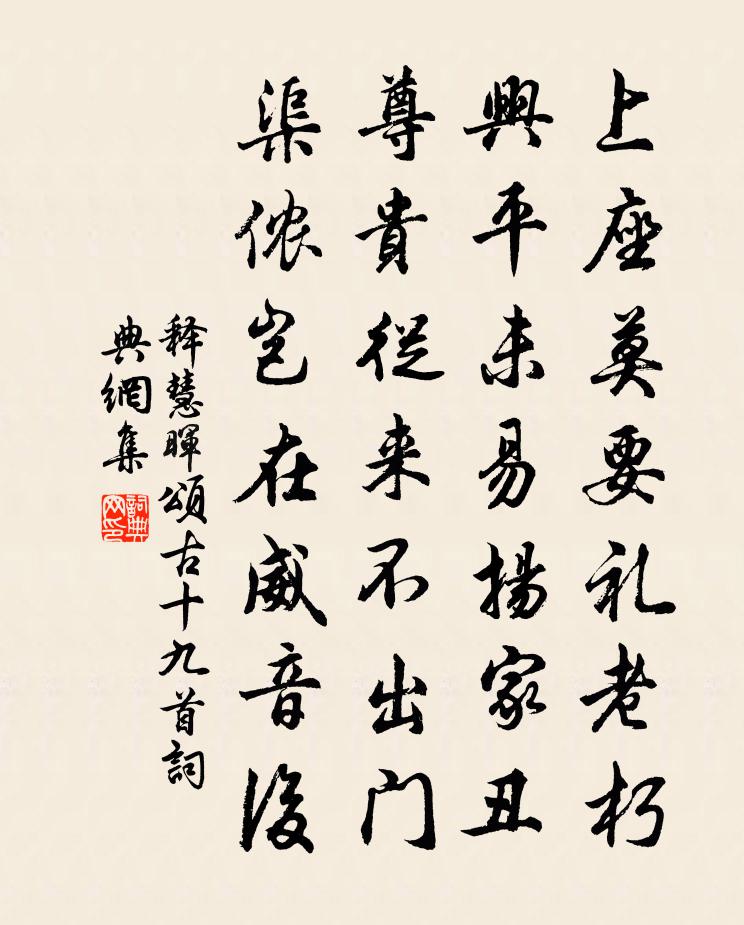 詩詞名句歷史字典書法欣賞書法字典國語詞典說文解字康熙字典古漢語字典標 題 作 者 詩 句 頌古十九首作者:釋慧暉 朝代:宋代頌古十九首原文上座莫要禮老朽,興平未易揚家醜。尊貴從來不出門,渠儂豈在威音後。詩詞問答問:頌古十九首的作者是誰?答:釋慧暉問:頌古十九首寫於哪個朝代?答:宋代釋慧暉頌古十九首書法欣賞頌古十九首書法作品詩詞推薦綠淨軒鄭剛中〔宋代〕小小軒窗冷逼人,竹無俗韻水無塵。正如蘆葦瀟湘浦,不見樊然花柳春。晚步裘萬頃〔宋代〕日落欲閉戶,風清聊杖藜。千山猶帶雨,一徑已無泥。虢虢水聲急,悠悠雲影低。催歸緣底事,著意旁人啼。立春帖子皇帝閣周必大〔宋代〕翠輿黃繖下祥羲,德壽宮中奉玉卮。天上融怡和氣滿,人間那得不熙熙。重九日至雲號王洋〔宋代〕梯山七千丈,接跡上清虛。鍾雜鈞天奏,僧參梵帝居。攝衣鵬展背,灑墨雁添書。今日登高眼,平生總不如。和人乞朱櫻十首廖行之〔宋代〕當年上苑得殊觀,爾許勻圓訝走盤。容易香山白居士,漫同樊素等閒看。贈武夷熊聖功隱士蔡沈〔宋代〕里閈皆華族,雲山獨草廬。非求龍虎鼎,爰傍聖賢居。石聳千尋直,溪涵萬頃虛。文公精爽在,風月夜何如。河南希深學士宋祁〔宋代〕洛霧嵩雲滿眼春,仙郎清路擁雙輪。卻陪賓客趨東閣,已為陽秋得素臣。淵秘圖書探漢舊,地交風雨訪周人。歲時挽江西宋漕三首廖行之〔宋代〕蚤歲才名畫省郎,會紆玉節惠三湘。哀矜折獄人無怨,訪問垂心慮最長。不便幽潛遺陋巷,更新文物萃書堂。期公慶元丁巳十月奉親如臨安宿西菩寺表弟吳克仁程珌〔宋代〕安車未向都門移,且攬西菩一段奇。路入山腰須種樹,泉流石齒莫開池。重來坡老今誰是,出世參參不記時。結束【南呂】一枝花_為打球子作王和卿〔元代〕為打球子作夭桃綻錦囊,嫩柳垂金線。梨花噴白雪,芳草綠鋪茵。春日郊園,出鳳城閒遊玩。選高原勝地面,就華游雲門詹騤〔宋代〕輕裘肥馬春三月,到此經游花正紅。欲覓上方幽隱處,老僧笑指白雲中。訪楊湖州汪莘〔宋代〕一道西江隔水雲,夜瞻牛斗共天文。聖之清必先夫子,仁者勇須今使君。天下山川居一半,湖州風月占三分。錦囊前溪作皎然〔唐代〕春歌已寂寂,古水自涓涓。徒誤時人輩,傷心作逝川。慎思聞家弟無斁捷解見貽用前韻晁補之〔宋代〕吾弟平生辛苦同,匹雛志舉百鈞鍾。自慚操瑟尚不斥,勸使力田終有逢。青眼故人欣捷報,白頭老母喜占從。書林留題天游閣陳襄〔宋代〕誰榜天游向此軒,欲令幽隱味真篇。一心泯絕渾無計,萬事攖寧付自然。持缽隨緣朝乞供,閉門扣寂夜安禪。如師淳化中朝會二十三首佚名〔宋代〕蕩蕩無私世,巍巍至聖君。山河分國實,日月耀人文。厭浥凝甘露,輪困吐慶雲。正聲兼大雅,洋溢應南薰。頻夜燈花顧予有何喜其可喜者又心之所自知不鄭剛中〔宋代〕何煩喜事燈來報,喜事山間足可夸。綠竹乍移都出筍,素馨沖臘小開花。疏牙送飯匙猶健,細字抄書筆有加。況是春日從伯氏領子侄郊行吳錫疇〔宋代〕寒食清明共一時,柔紅開遍野棠梨。繁禽聲樂風光麗,弱柳陰濃日腳遲。身外生涯何似酒,人間局面只如棋。行春明德宮張繼〔唐代〕碧瓦朱楹白晝閒,金衣寶扇曉風寒。摩雲觀閣高如許,長對河流出斷山。毛頭吟邵雍〔宋代〕誰剪毛頭謝陸沉,生靈肌骨不勝侵。人間自有回天力,林下空多憂國心。日過中時憂未文,月幾望處患仍深。軍中名句推薦人似秋鴻來有信,事如春夢了無痕。蘇軾《正月二十日與潘郭二生出郊尋春忽記去年是日同至女王城作詩乃和前韻》 人處疾則貴醫。韓非及後人《韓非子·解老》 請君試問東流水,別意與之誰短長。李白《金陵酒肆留別》 敗葉填溪水已冰,夕陽猶照短長亭。納蘭性德《浣溪沙·敗葉填溪水已冰》 自重者然後人重,人輕者便是自輕。佚名《增廣賢文·下集》 作人無一點真懇的念頭,便成個花子,事事皆虛洪應明《菜根譚·概論》 二月賣新絲,五月糶新谷。聶夷中《詠田家 / 傷田家》 只匆匆眺遠,早覺閒愁掛喬木。史達祖《八歸·秋江帶雨》 東城漸覺風光好。宋祁《玉樓春·春景》 細草軟沙溪路、馬蹄輕。蘇軾《南歌子·寓意》