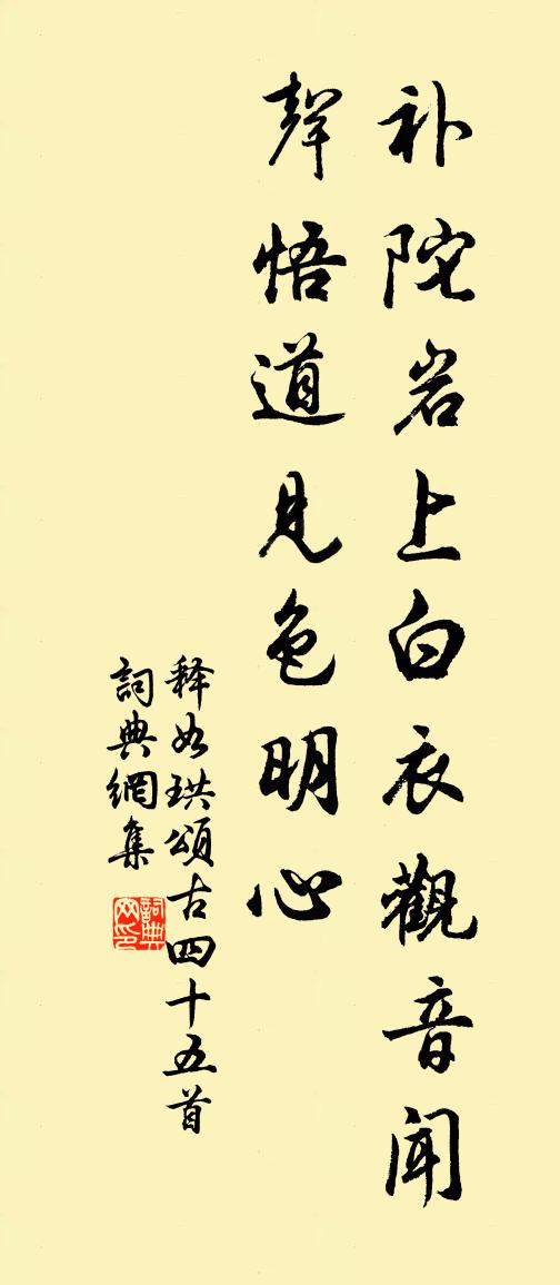 詩詞名句歷史字典書法欣賞書法字典國語詞典說文解字康熙字典古漢語字典標 題 作 者 詩 句 頌古四十五首作者:釋如珙 朝代:宋代頌古四十五首原文補陀岩上,白衣觀音,聞聲悟道,見色明心。詩詞問答問:頌古四十五首的作者是誰?答:釋如珙問:頌古四十五首寫於哪個朝代?答:宋代釋如珙頌古四十五首書法欣賞頌古四十五首書法作品詩詞推薦宿雞林坊楊萬里〔宋代〕草有清無俗,田生不用耘。菰花琱品字,荇葉缺錢文。出水浮難沒,搖風淨更芬。物情豈難狀,作麽未前聞。送歷陽潘司戶瑤移令歸東魯賀鑄〔宋代〕衰俗紛紛務近功,幾人心跡與君同。低回州縣青衫列,踴躍聖賢黃卷中。牛渚江山空夜月,河陽桃李再春風。相望逍遙詠宋太宗〔宋代〕何處堪依仗,經心便皺眉。世情多詭詐,業重信愚痴。取次招他謗,違非不自知。貌恭無德行,禍福在修持。摸魚子 鳳凰台,次湯碧山教授韻許有壬〔元代〕自簫韶九成來後,岐山猶是隆古。嬴顛劉蹶相枕藉,幾度狸號*舞。堪笑處。又蕞爾鐘山,一霎神光吐。鶴汀鳧渚贈知音溫庭筠〔唐代〕翠羽花冠碧樹雞,未明先向短牆啼。窗間謝女青蛾斂,門外蕭郎白馬嘶。星漢漸移庭竹影,露珠猶綴野花迷。景陽水調歌頭李光〔宋代〕兵器暗吳楚,江漢久淒涼。當年俊傑安在,酌酒酹嚴光。南顧豺狼吞噬,北望中原板蕩,矯首訊穹蒼。歸去謝賓友梅山弟家醉中陳著〔宋代〕僵寒危病分泉台,誰料今猶事酒杯。可是食羊供未足,只因齏瓮喚教回。紫荊老樹死中活,棠棣春花笑處開。兒輩遊子吟孟郊〔唐代〕慈母手中線,遊子身上衣。臨行密密縫,意恐遲遲歸。誰言寸草心,報得三春暉。天津感事二十六首邵雍〔宋代〕鳳凰樓觀冷橫秋,橋下長波入海流。千百年來舊朝市,幾番人向此經由。二郎神馬子嚴〔宋代〕日高睡起,又恰見、柳梢飛絮。倩說與、年年相挽,卻又因他相誤。南北東西何時定,看碧沼、青萍無數。念蜀郡漢南晤魏侯彥誠魏侯贈詩期依韻知已而荊門受王之望〔宋代〕白頭有如新,傾蓋或如故。乃知意氣間,投分自有處。魏公使漢南,風采聳一路。凋殘濡膏澤,冤訟廓氛霧。遊刃梅妃劉克莊〔宋代〕簫能妻弄玉,琴可挑文君。吹徹寧哥笛,梅妃未必聞。司馬侍郎輓詩項安世〔宋代〕生身何恨晚,猶識孝曾孫。姓字驚喬木,儀型想九原。百年餘父老,雙淚落軺軒。此意今誰領,憑高只斷魂。建節後偶作楊汝士〔唐代〕拋卻弓刀上砌台,上方台榭與雲開。山僧見我衣裳窄,知道新從戰地來。雲外峰陳岩〔宋代〕聳入雲端一壁青,地高轉步即天京。有人著屐沖雲去,但見雲從腳下生。次太守李侍郎和郡博士包丈芍藥韻二首錢億年〔宋代〕艷草妖花理易殘,無勞太息撫雕欄。終年費盡壅培力,能共樽前幾日看。【中呂】紅繡鞋 晚秋李致遠〔元代〕夢斷陳王羅襪,情傷學士琵琶,又見西風換年華。數杯添淚酒,幾點送秋花,行人天一涯!句魏了翁〔宋代〕乾闕一鉤金。單君范過西皋迂途來訪一詩道別陳著〔宋代〕老境途迎作夢看,出門相送是愁端。分攜不去有心在,長揖無言回首難。霧雨暗山家信遠,春風吹笠客心寒。儒生春社陸游〔宋代〕柴門西畔枕陂塘,社雨新添一尺強。台省諸公方袞袞,故應分喜到耕桑。名句推薦獨坐幽篁里,彈琴復長嘯。王維《竹里館》 愛敬盡於事親,而德教加於百姓,刑於四海孔子及其弟子《孝經·天子》 曾把芳心深相許。故夢勞詩苦。史達祖《留春令·詠梅花》 不論平地與山尖,無限風光盡被占羅隱《蜂》 斷送落花三月雨,摧殘楊柳九秋霜。施耐庵《水滸傳·第十六回》 鄉書何處達?歸雁洛陽邊。王灣《次北固山下》 鳳凰台上鳳凰游,鳳去台空江自流。李白《登金陵鳳凰台》 繡帳已闌離別夢,玉爐空裊寂寥香。馮延巳《浣溪沙·春到青門柳色黃》 春蠶到死絲方盡,蠟炬成灰淚始乾。李商隱《無題·相見時難別亦難》 居上不驕,為下不倍。國有道,其言足以興;國無道,其默足以容。子思《中庸·第二十七章》