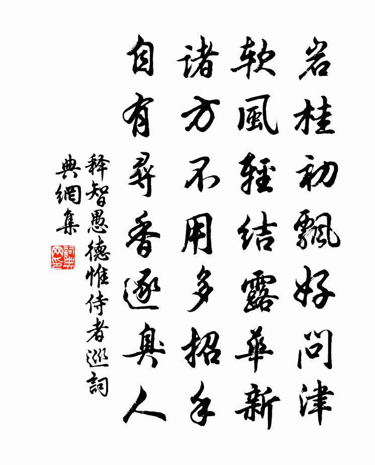 詩詞名句歷史字典書法欣賞書法字典國語詞典說文解字康熙字典古漢語字典標 題 作 者 詩 句 德惟侍者巡作者:釋智愚 朝代:宋代德惟侍者巡原文岩桂初飄好問津,軟風輕結露華新。諸方不用多招手,自有尋香逐臭人。詩詞問答問:德惟侍者巡的作者是誰?答:釋智愚問:德惟侍者巡寫於哪個朝代?答:宋代釋智愚德惟侍者巡書法欣賞德惟侍者巡書法作品詩詞推薦玉堂春晏殊〔宋代〕後園春早。殘雪尚濛菸草。數樹寒梅,欲綻香英。小妹無端、折盡釵頭朵,滿把金尊細細傾。憶得往年同伴,沈吟贈金陵明上人林逋〔宋代〕高社似東林,修行歲月深。講多刪舊抄,齋早喚幽禽。上國名流重,諸方學者尋。長因對清話,山閣轉松陰。又賦文天祥〔宋代〕一病忽兩月,蓬頭夏涉秋。形羸心自壯,手弱筆仍遒。昨夜燈如喜,今宵蝶莫愁。問誰驅五瘧,正與五窮謀。句李壁〔宋代〕一杯謾道愁能遣,幾度醒來錯喚君。頌古三十二首釋明辯〔宋代〕當堂古路白雲漫,碧眼黃頭尚未諳。無孔笛兒氈拍板,輕輕吹破御街寒。王倅生辰鄭剛中〔宋代〕日馭駕輪入東尾,望後黑月將浹旬。惟時十月二十四,積慶高門生異人。霏霏霜華翦寒梢,天地嚴肅無妖氛,秘藏暇日過在伯辱對菊置酒已焉甚醉得四十字趙蕃〔宋代〕雨後江猶漲,霜前菊正繁。波光搖檻楯,花氣入楹軒。病不勝杯勺,情欣接話言。兀然成徑醉,涕唾老仍煩。前詩謂思索詩句可以度日第恐終無益再賦一首虞儔〔宋代〕年來世味一毫輕,宿契詩書尚有情。魔事從教從眼赤,內觀還覺寸心明。思量詩句嗟無補,檢校醫方恐未精。俗學清明值雨宋祁〔宋代〕有渰興芳序,餘寒惜慘悽。遠山沈向盡,雜樹望先迷。天闊都成暝,雲昏本自低。漂灰禁餘火,浮棗祓殘溪。檻篠送勝雲小師皎然〔唐代〕昨日雪山記爾名,吾今坐石已三生。少年道性易流動,莫遣秋風入別情。六月吟龔宗元〔宋代〕曦輪獵野枯杉松,火焚泰華雲如峰。天地爐中赤煙起,江湖煦沫烹魚龍。生獰渴獸唇焦斷,峻翮無聲落晴漢。饑民和遲田舍雜詩九首蘇轍〔宋代〕至人竟安在,陶鑄皆秕糠。世俗那得知,楚楚事冠裳。方醉狂正作,吾語未可莊。天定能勝人,更看熟黃粱。香球元稹〔唐代〕順俗唯團轉,居中莫動搖。愛君心不惻,猶訝火長燒。檢覆葉縣魯山田李晉卿餞於首山寺留別梅堯臣〔宋代〕我本山水鄉,看山常不足。自從到官來,塵事便拘束。嘗聞此山寺,法宇深雲木。無由一來過,夢想向岩谷。按田浣溪沙張元乾〔宋代〕曰萼綠春,且作一首。諺以竊嘗為吹笙雲萼綠華家萼綠春。山瓶何處下青雲。濃香氣味已醺人。竹葉傳杯驚老眼,比見愚卿於廬陵出示楊謹仲詩卷中及其弟魯卿趙蕃〔宋代〕廬陵得交君弟兄,楊子詩中稱魯卿。問雲攜琴嶽麓行,歸期去日雲秋清。今晨復見楊子面,為方卓卿近相見。玉隆送覺華岩歸中岩李流謙〔宋代〕世路翻巨浪,是身如孤舟。黑風半夜來,掀簸卒未休。誰能洶湧間,輕飛逐浮鷗。稽首大導師,覺海名善泅。請下同錢員外題絕糧僧巨川白居易〔唐代〕三十年來坐對山,唯將無事化人間。齋時往往聞鍾笑,一食何如不食閒?偈頌一百一十七首釋紹曇〔宋代〕四十年同參,廿餘年相別。不唱菩薩蠻,休暇說佛法。驀劄相逢十二峰,我患生盲你患聾。是聖是凡都莫問,且分送陳孔晨錄鄞學任滿西歸陳著〔宋代〕思昔南墅翁,用不盡書力。留以裕厥子,著鞭飽諳歷。鄞庠多材地,糾錄迂分職。休休自無犯,耿耿不事激。時雨名句推薦天子臨軒賜侯印,將軍佩出明光宮。王維《少年行四首》 日射紗窗風撼扉,香羅拭手春事違。李商隱《日射》 且憑天子怒,復倚將軍雄。高適《塞下曲》 重重疊疊上瑤台,幾度呼童掃不開。蘇軾《花影》 別後不知君遠近。觸目淒涼多少悶。歐陽修《玉樓春·別後不知君遠近》 天與火,同人;君子以類族辨物。佚名《易傳·象傳上·同人》 亭上秋風,記去年裊裊,曾到吾廬。辛棄疾《漢宮春·會稽秋風亭觀雨》 千載琵琶作胡語,分明怨恨曲中論。杜甫《詠懷古蹟五首·其三》 篤志而體,君子也。荀子《荀子·修身》 知音少,弦斷有誰聽。岳飛《小重山·昨夜寒蛩不住鳴》