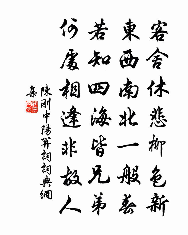 詩詞名句歷史字典書法欣賞書法字典國語詞典說文解字康熙字典古漢語字典標 題 作 者 詩 句 陽關詞作者:陳剛中 朝代:宋代陽關詞原文客舍休悲柳色新,東西南北一般春。若知四海皆兄弟,何處相逢非故人。詩詞問答問:陽關詞的作者是誰?答:陳剛中問:陽關詞寫於哪個朝代?答:宋代陳剛中陽關詞書法欣賞陽關詞書法作品詩詞推薦柳州二月榕葉落盡偶題柳宗元〔唐代〕宦情羈思共淒淒,春半如秋意轉迷。山城過雨百花盡,榕葉滿庭鶯亂啼。陪致政開府太師留守相公致內翰燕集輒歌盛美司馬光〔宋代〕東閣延髦士,西都守別宮。不忘如衛武,難老似僖公。位貌今雖遠,官僚舊忝同。開懷盡卮酒,足以厚時風。憶昔行送李成這徵君程公許〔宋代〕憶昔與郡同射策,同舟同館心膠漆。萬言人奏甘棄置,賴有湖山好看客。歸裝濡滯及黃池,半菽寒菹作除夕。慨慷靜坐吟邵雍〔宋代〕人生固有命,物生固有定。豈謂人最靈。不知物正性。或聞陰有鬼,善能致人死。致死設有由,死外何所求。又況閏月二十日離玉山八月到餘干易舟又二日抵鄱趙蕃〔宋代〕試登雲錦閣,還上揖仙亭。棟宇雖摧落,江山自典型。衝風聊策杖,晚日更揚舲。要寫吳江句,初無六尺屏。樓上戴敏〔宋代〕終朝役役晚來閒,識破浮生一夢間。挈榼去沽深巷酒,倚樓貪看夕陽山。月臨江館人橫笛,風折蘆花雁度關。堪羨益壽美金花侯善淵〔元代〕忘形遺照。無垢清虛真至妙。物外霞輝。天岸波澄混太微。列開丹竅。悟入重玄明總要。出化星儀。風御靈飆易象記夢黃庭堅〔宋代〕眾真絕妙擁靈君,曉然夢之非紛紜。窗中遠山是眉黛,席上榴花皆舞裙。借問琵琶得聞否,靈君色莊妓搖手。兩客秋遊六首邵雍〔宋代〕八月光陰未甚淒,松亭竹榭尤為宜。況當晝夜初停處,正是炎涼得所時。明月入懷如有意,好風迎面似相知。閒人夜和陳道士韻仇遠〔宋代〕三白先春慰客情,瑤林照耀夜窗明。淺斟低痴兒女,那得工夫問雪聲。野僧釋文珦〔宋代〕野僧塵慮盡,住在最深峰。庭樹巢孤鶴,崖湫宅老龍。瀑綃懸百尺,雲幌羃千重。靜里玄機發,登樓夜擊鐘。挽林侍郎二首劉克莊〔宋代〕端平初偶忝朝班,親見仙枝折廣寒。揭曉名高推虎榜,凌雲賦奏動龍顏。烹桑猶記攻京尹,諫草何妨上史官。膜外贈凌山人二首劉宰〔宋代〕百鍊靈丹手製成,等閒騎鶴上青冥。緱山自有來時侶,莫羨遼東化鶴丁。送別李白〔唐代〕尋陽五溪水,沿洄直入巫山里。勝境由來人共傳,君到南中自稱美。送君別有八月秋,颯颯蘆花復益愁。雲帆望遠元夕陪須溪野廟觀燈趙文〔宋代〕豈能狂落魄,只似醉瞢騰。媼拜兒看笑,蠻妝鬼見憎。客中猶有酒,亂後此看燈。攜手沙河路,前身夢裡曾。像維那寫老病阿師像請贊釋正覺〔宋代〕芙蓉之枝,丹山之兒。一絲聯自信,三昧約誰知。珊瑚寒月墮影,琥珀老松流滋。諸緣豁淨兮山空秋壯,萬態變通挽北磵徐集孫〔宋代〕本分參禪學,吟中透一關。清名傳北磵,遺像在南山。石塔人千古,煙梯屋數間。詩魂何處覓,應伴白雲閒。游洞霄宮一首王阮〔宋代〕洞天若限仙凡路,九鎖前山不易尋。尚有康廬山下客,玉皇溫詔與登臨。過噴玉泉趙嘏〔唐代〕平生半為山淹留,馬上欲去還回頭。兩京塵路一雙鬢,不見玉泉千萬秋。春寒梅堯臣〔宋代〕春畫自陰陰,雲容薄更深。蝶寒方斂翅,花冷不開心。亞樹青簾動,依山片雨臨。未嘗辜景物,多病不能尋。名句推薦情往似贈,興來如答。劉勰《文心雕龍·物色》 同居長乾里,兩小無嫌猜。李白《長干行二首》 況是青春日將暮,桃花亂落如紅雨。李賀《將進酒》 莫道讒言如浪深,莫言遷客似沙沉。劉禹錫《浪淘沙九首》 枉己者不能直人,忘親者不能忠君。張廷玉《明史·列傳·卷六十七》 雪雲散盡,放曉晴池院。楊柳於人便青眼。李元膺《洞仙歌·雪雲散盡》 九月寒砧催木葉,十年征戍憶遼陽。沈佺期《古意呈補闕喬知之 / 古意 / 獨不見》 貴上極則反賤,賤下極則反貴。司馬遷《史記·貨殖列傳》 劍外忽傳收薊北,初聞涕淚滿衣裳。杜甫《聞官軍收河南河北》 憶得盈盈拾翠侶,共攜賞、鳳城寒食。李甲《帝台春·芳草碧色》