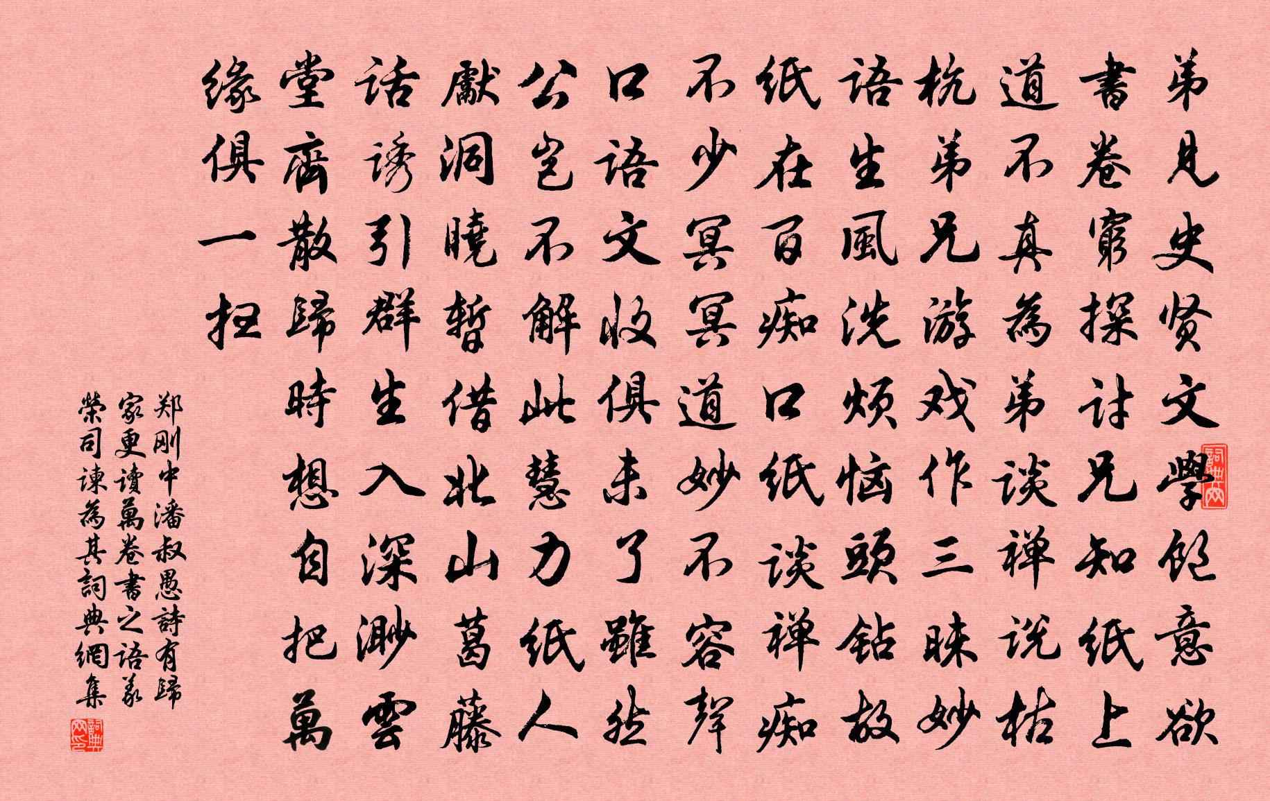 詩詞名句歷史字典書法欣賞書法字典國語詞典說文解字康熙字典古漢語字典標 題 作 者 詩 句 潘叔愚詩有歸家更讀萬卷書之語義榮司諫為其作者:鄭剛中 朝代:宋代原文弟見史賢文學飽,意欲書卷窮探討。兄知紙上道不真,為弟談禪說枯杭。弟兄遊戲作三昧,妙語生風洗煩惱。頭鑽故紙在百痴,口紙談禪痴不少。冥冥道妙不容聲,口語文收俱未了。雖然公豈不解此,慧力紙人先洞曉。暫借北山葛藤話,誘引群生入深渺。雲堂齊散歸時想,自把萬緣俱一掃。詩詞問答問:《潘叔愚詩有歸家更讀萬卷書之語義榮司諫為其》的作者是誰?答:鄭剛中問:該詩寫於哪個朝代?答:宋代書法欣賞潘叔愚詩有歸家更讀萬卷書之語義榮司諫為其書法作品詩文賞析【原題】:潘叔愚詩有歸家更讀萬卷書之語義榮司諫為其未切於道也則作詩以警老之而其序乃有終日談禪之語鄭子聞而笑之且收即不必讀則禪亦何必談乎復作一計埕司諫公用前韻也詩詞推薦燕城讀史羅公升〔宋代〕遼佐遣戍函谷舉,平懷構兵江都亡。秦隋失道自速死,可是東海真不祥。和陶停雲四首蘇軾〔宋代〕颶作海渾,天水溟濛。雲屯九河,雪立三江。我不出門,寤寐北窗。念彼海康,神馳往從。句藍元威〔宋代〕潤松盡作龍鍾結,匝地渾銷雁齒高。感事晁說之〔宋代〕十年三冬時,櫃火簾小室。讀書似少疲,坐睡塵兩膝。飛雪封我窗,號風過我壁。時有可語人,對之亦默默。當時用韻達驢與源谷胡仲弓〔宋代〕長耳追風走似流,黔人空使載驢舟。巾箱欲置無容處,來與騷人款段游。偈頌一百零二首釋紹曇〔宋代〕肥馬碌碌,瘦馬碌碌。醫得眼前瘡,剜卻心頭肉。朝不足,莫不足,六六依然三十六。雲門見睦州,良遂參 * 。石湖山居顧逢〔宋代〕幽居入翠微,樂似在松時。野景俱成畫,山行總是詩。黠禽爭浴水,戲鵲倒懸枝。此意誰能識,徜徉只自知。五王行春圖張昱〔元代〕開元天子達四聰,羽旄管籥行相從。當時從駕驪山者,宰相猶是璟與崇。華萼樓中雲氣里,兄弟同眠復同起。玉環書義倡傳後鍾明〔宋代〕洞庭之南瀟湘浦,佳人娟娟隔秋渚。門前冠蓋但如雲,玉貌當年誰為主。風流學士淮海英,解作多情斷腸句。流傳冬日雷雨段油〔宋代〕劈面同雲布,雨共雪無數。雷又似打鼓,風又似提鋸。雹子遍四郊,電光照四處。晚了定似晴,天地撰不去。達磨贊釋崇岳〔宋代〕鳳凰城闕,不通水泄。少室岩前,話作兩橛。賺它人家男女,開眼喚龜作鱉。偈傾一百六十九首釋智朋〔宋代〕溪山雖異,雲月是同。透脫聲色,任自西東。十里西湖九里松。山中雜興 十六王冕〔元代〕貧居得幽僻,世事不相關。詩思多因雨,閒情獨愛山。落花隨水去,孤鶴望人還。最喜神清健,年來酒量慳。頌古五十五首釋紹曇〔宋代〕黃金肌骨鐵心腸,曉出重城眩巧妝。賺入涅槃門路去,連天荒草看人忙。句晏殊〔宋代〕紫結茱萸實,濃熏菡萏香。和毗陵尉曹昭用見寄李中〔唐代〕決獄多餘暇,冥搜萬象空。捲簾疏雨後,鎖印夕陽中。還往多名士,編題尚古風。宦途知此味,能有幾人同。寄南雅上人齊己〔唐代〕曾得音書慰暮年,相思多故信難傳。清吟何處題紅葉,舊社空懷墮白蓮。山水本同真趣向,侯門剛有薄因緣。他時挽陳本齋尚書牟巘五〔宋代〕有意超塵俗,無心愛夕暉。勸餐惟屢卻,持璧竟全歸。得正復奚憾,偷生良所非。傳家孫子盛,端不墜前徽。句黃孝先〔宋代〕風檐燕引五六子,露井榴開三四花。憶事元稹〔唐代〕夜深閒到戟門邊,卻繞行廊又獨眠。明月滿庭池水淥,桐花垂在翠簾前。名句推薦相望試登高,心隨雁飛滅。孟浩然《秋登蘭山寄張五》 啼號升斗抵千金,凍雀飢鴉共一音。范成大《雪中聞牆外鬻魚菜者求售之聲甚苦有感》 傷心莫問前朝事,重上越王台。倪瓚《人月圓·傷心莫問前朝事》 閒坐悲君亦自悲,百年多是幾多時。元稹《遣悲懷三首·其三》 綠樹村邊合,青山郭外斜。孟浩然《過故人莊》 積善三年,知之者少,為惡一日,聞於天下。房玄齡《晉書·帝紀·第一章》 水繞陂田竹繞籬,榆錢落盡槿花稀。張舜民《村居·水繞陂田竹繞籬》 學者非必為仕,而仕者必如學。荀子《荀子·大略》 洛陽城東西,長作經時別。范雲《別詩》 一寸光陰一寸金,寸金難買寸光陰。佚名《增廣賢文·上集》