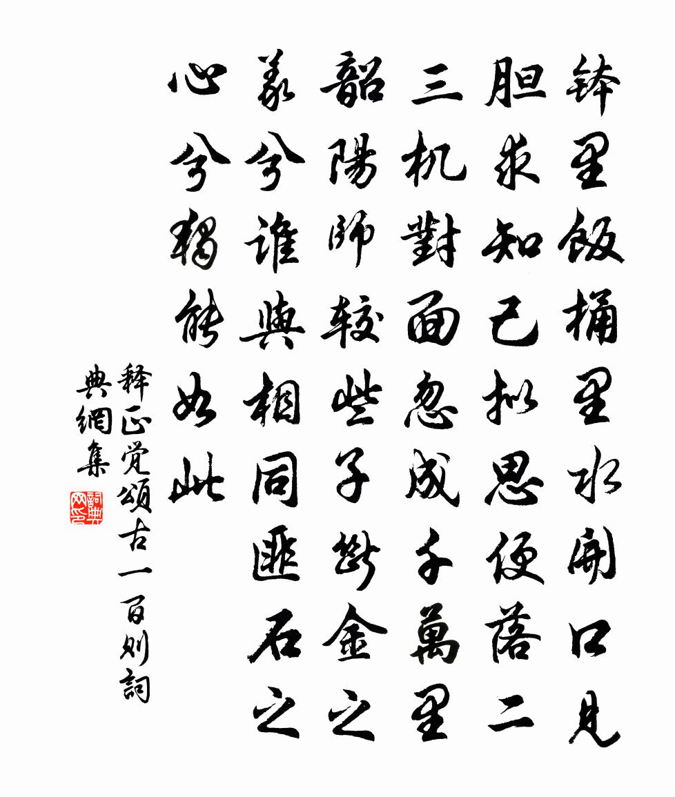 詩詞名句歷史字典書法欣賞書法字典國語詞典說文解字康熙字典古漢語字典標 題 作 者 詩 句 頌古一百則作者:釋正覺 朝代:宋代頌古一百則原文缽里飯,桶里水,開口見膽求知己。擬思便落二三機,對面忽成千萬里。韶陽師,較些子。斷金之義兮誰與相同,匪石之心兮獨能如此。詩詞問答問:頌古一百則的作者是誰?答:釋正覺問:頌古一百則寫於哪個朝代?答:宋代釋正覺頌古一百則書法欣賞頌古一百則書法作品詩詞推薦和尹懋秋夜遊灉湖張說〔唐代〕坐嘯人事閒,佳游野情發。山門送落照,湖口升微月。林尋猿狖居,水戲黿鼉穴。朔風吹飛雁,芳草亦云歇。雲居還值旱懷舊遊寄楊文仲二首王阮〔宋代〕憶扶湘竹杖,共扣趙州關。山好不容住,水流今載還。卻從天上下,似出鏡中間。笑問楊扶子,何時再得閒。次見泌韻陳著〔宋代〕門外風塵付一吁,何妨稼圃學樊須。由由本自人難浼,皎皎奚憂我易污。晚秋客廡宋祁〔宋代〕涼葉日幡幡,西風振旅魂。客來聊解榻,童小未應門。蟬噪專林響,蝸移亂壁痕。缺然禽鹿性,持底報君恩。頌古十首釋行鞏〔宋代〕高燒榾柮暖通身,快活難禁一屋春。不是謝郎來合火,誰知門外有寒人。偈頌三十首釋印肅〔宋代〕普庵真實不問錢,只要離塵脫業纏。一聞千悟方堪委,何須苦苦學神仙。州橋范成大〔宋代〕州橋南北是天街,父老年年等駕回。忍淚失聲詢使者,"幾時真有六軍來?"虞姬墓范成大〔宋代〕劉項家人總可憐,英雄無策庇嬋娟。戚姬葬處君知否?不及虞兮有墓田。點絳唇(己巳重九和蘇堅)蘇軾〔宋代〕我輩情鍾,古來誰似龍山宴。而今楚甸。戲馬余飛觀。顧謂佳人,不覺秋強半。箏聲遠。鬢雲吹亂。愁入參差雁。賜陳摶宋太宗〔宋代〕曾向前朝出白雲,後來訊息杳無聞。如今若肯隨徵召,總把三峰乞與君。詠雲董思恭〔唐代〕帝鄉白雲起,飛蓋上天衢。帶月綺羅映,從風枝葉敷。參差過層閣,倏忽下蒼梧。因風望既遠,安得久踟躕。哲宗上太皇太后冊寶五首佚名〔宋代〕玉車臨御,鳳蓋棼麗。奉承寶冊,彌文盛備。抗聲極律,助我孝熙。天之所佑,萬壽無期。桂枝香 賞桂楊氏山園,夜飲花下有作張翥〔元代〕天香萬斛。盡貯入魏台,辟寒金粟。誰喚仙娥睡起,露妝煙沐。翠雲裙袖黃雲襪,倚秋風、乍驚郎目。恨無明月,送李奉議亳州判官四首陳師道〔宋代〕祁氏號外府,藏室多異書。自公有餘力,一覽意何如。為學雖日益,受益不受誣。正須高著眼,濠梁有游魚。玉堂春晏殊〔宋代〕斗城池館。二月風和煙暖。繡戶珠簾,日影初長。玉轡金鞍、繚繞沙堤路,幾處行人映綠楊。小檻朱闌回倚,千花仙遊縣劉克莊〔宋代〕不見層崗與複岩,眼中夷曠似江南。煙收綠野連青嶂,樹闕朱橋映碧潭。丞相無家曾住寺,聘君有字尚留庵。荒山和孫珪秘丞杜衍〔宋代〕老來楷法不如初,試向間齊習草書。落筆何曾見飛動,雕章早已過吹噓。伯英比聖功難到,懷素稱狂力有餘。若謂秋雨嘆游九言〔宋代〕戊午七月陰氣寒,重雲低濕天漫漫。高檐流瀉下檐溢,旅人愁絕居人冤。市井滂沱豈足計,老農涕泣猶辛酸。兩年醉落魄·丙寅中秋郭應祥〔宋代〕瓊樓玉宇。分明不受人間暑。尋常豈是無三五。惟有今宵,皓彩皆同普。素娥閱盡今和古。何妨小駐聽吾語。當年金剛隨機無盡頌離色離相分第二十釋印肅〔宋代〕頭頭見佛身,元是本來人。棒打不回頭,照靈非故新。名句推薦令必行,禁必止。韓非及後人《韓非子·飾邪》 鵲飛山月曙,蟬噪野風秋。上官儀《入朝洛堤步月》 紙灰飛作白蝴蝶,淚血染成紅杜鵑。高翥《清明日對酒》 欲求生富貴,須下死工夫。佚名《增廣賢文·上集》 月既不解飲,影徒隨我身。李白《月下獨酌四首·其一》 玉樓天半起笙歌,風送宮嬪笑語和。顧況《宮詞五首·其二》 去年夜半橫江夢,倚危檣,參差曾賦劉辰翁《桂枝香· * 人去》 水調數聲持酒聽。午醉醒來愁未醒。張先《天仙子·水調數聲持酒聽》 日往菲薇,月來扶疏。左思《三都賦》 迢迢牽牛星,皎皎河漢女。佚名《迢迢牽牛星》