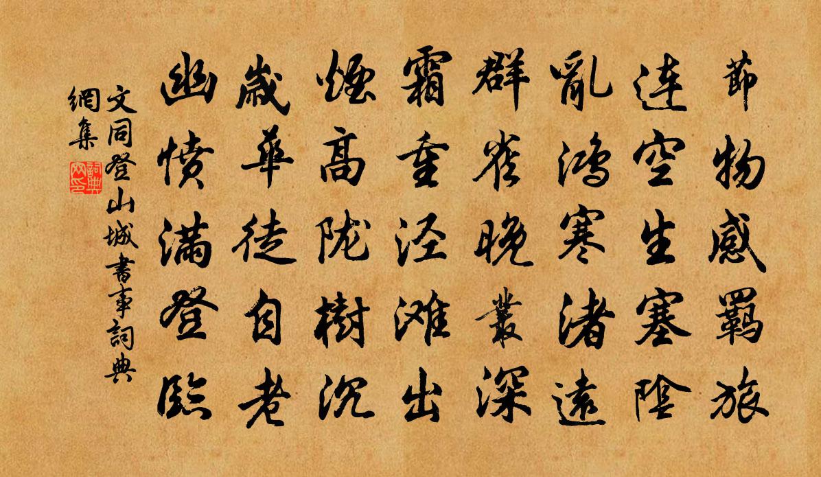 詩詞名句歷史字典書法欣賞書法字典國語詞典說文解字康熙字典古漢語字典標 題 作 者 詩 句 登山城書事作者:文同 朝代:宋代登山城書事原文節物感羈旅,連空生塞陰。亂鴻寒渚遠,群雀晚叢深。霜重涇灘出,煙高隴樹沉。歲華徒自老,幽憤滿登臨。詩詞問答問:登山城書事的作者是誰?答:文同問:登山城書事寫於哪個朝代?答:宋代文同登山城書事書法欣賞登山城書事書法作品詩詞推薦求貓子釋智愚〔宋代〕堂上新生虎面狸,千金許我不應移。家寒故是無偷鼠,要見翻身上樹時。江西壬辰秋大旱飢臨江守王幼學監簿極力救民戴復古〔宋代〕懇切金章奏,精誠玉帝知。稻粱民性命,豐歉國安危。苗秀方成實,雨來還及時。人能合天意,天亦順人為。白月張耒〔宋代〕白月照世界,山河受清光。豈獨耳目清,瑩洗肝膈涼。中夜掃寬虛,仰得天一方。湛碧磨青銅,精金點星茫。我心登邛州譙門門三重其西偏有神仙張四郎畫像張陸游〔宋代〕浮雲在腳底,千里在眼邊。攀躋忽至此,倚柱眩欲顛。車馬細如螘,紛紛衢路間。嗟汝何為者,馳驅窮歲年。我本曲湖種柳張詠〔宋代〕曲湖連曲接平蕪,前事因循好嘆吁。不見有源堪畎鑿,便來此地費工夫。蛙能聚響難停息,蓮本含香舊已無。夾岸安分歌白玉蟾〔宋代〕神仙底事君知否,君若知兮求不苟。先且回頭自揣量,須量瞞心方開口。神仙有術非不傳,也要儂家有夙緣。若也崔清獻公祠堂落成翟龕〔宋代〕象笏猶存舊典型,魏謨亦此振家聲。矧今故第堂堂復,不日新祠恰恰成。嘉定間關全蜀險,端平倉卒護鄉城。此功未試即事雜書率用秋日同文館為首句三首鄧忠臣〔宋代〕秋日同文館,重門靜不開。雲隨鴻影去,風送樂聲來。插架書千軸,論文酒百杯。脫花陳葉滿,還是作愁媒。善慶堂詩楊維楨〔元代〕鐵江泥泥,其流長深。奕奕新堂,有書有琴。有橋在高,有梓於陰。君子慶只,少伊氏之覃。宜爾家屋,和樂且湛和岳國華仇遠〔宋代〕廣文飯少甑生塵,老去衰顏酒借春。吟癖何曾醫不得,古來清瘦是詩人。自詠白居易〔唐代〕形容瘦薄詩情苦,豈是人間有相人?只合一生眠白屋,何因三度擁朱輪?金章未佩雖非貴,銀榼常攜亦不貧。唯是雜感陸游〔宋代〕艱危寧度瘦驢嶺,奔走莫隨肥馬麈。困厄終身元自好,可憐痴子恨無津。奉和純甫秋扇強至〔宋代〕粲粲機中練,作扇圓中規。盛夏天無風,廣宇猶蒸炊。汗流既浹體,蛟齒仍毒肥。團扇當爾日,功利兩得施。一入題清心堂曹修古〔唐代〕天府鞠辦三節日,霜台待漏五更時。薰風一覺清涼睡,莫問浮名高與卑。和雁湖先生病起自警八章程公許〔宋代〕葆光悟老子說,遊仙續景純詩。木銑可使石透,盤水猶嚴手持。哭清遠權宰樓海司法二首李昴英〔宋代〕百里稱廉吏,誰歟起釁端。州符需賦急,軍餉及期難。節義扶澆俗,朝廷贈大官。邑人崇廟像,猶似發衝冠。應禪人出丐求頌釋正覺〔宋代〕應身隨處見塵塵,能順因緣不背真。樹上虎頭呈伎倆,毛端師子顯精神。平生自許得遊刃,投老難傳知斲輪。香氣石樓朱南金〔宋代〕蒙茸披儘自成蹊,兩扇岩扉向日齊。說與白雲休鎖鑰,留將千古指人迷。玉蝴蝶(和劉清安)尹濟翁〔宋代〕幾許暮春清思,未知芍藥,先擬荼蘼。老卻東風,春去不與人期。似情多、何曾荀倩,便夢斷、不為崔徽。且銜杯和曾竑父光孝佳句曹勛〔宋代〕使君幽討遍禪林,名動三台殿閣清。稍賦詩章回好色,坐令草木有佳聲。政須膏澤隨軒至,未礙隼旟沖雨行。爭寫名句推薦君看六幅南朝事,老木寒雲滿故城。韋莊《金陵圖》 一種青山秋草里,路人唯拜漢文陵許渾《途經秦始皇墓》 君子之道,暗然而日章;小人之道,的然而日亡。子思《中庸·第三十三章》 辜負我,悔憐君,告天天不聞。牛嶠《更漏子·春夜闌》 記取江湖泊船處,臥聞新雁落寒汀。陸游《夜泊水村》 舟覆乃見善游,馬奔乃見良御。劉安及其門客《淮南子·說林訓》 鼓吹助清賞,鴻雁起汀洲。蘇轍《水調歌頭·徐州中秋》 夢裡分明見關塞,不知何路向金微。張仲素《秋閨思二首》 不知來歲牡丹時,再相逢何處。葉清臣《賀聖朝·留別》 那堪更被明月,隔牆送過鞦韆影。張先《青門引·春思》