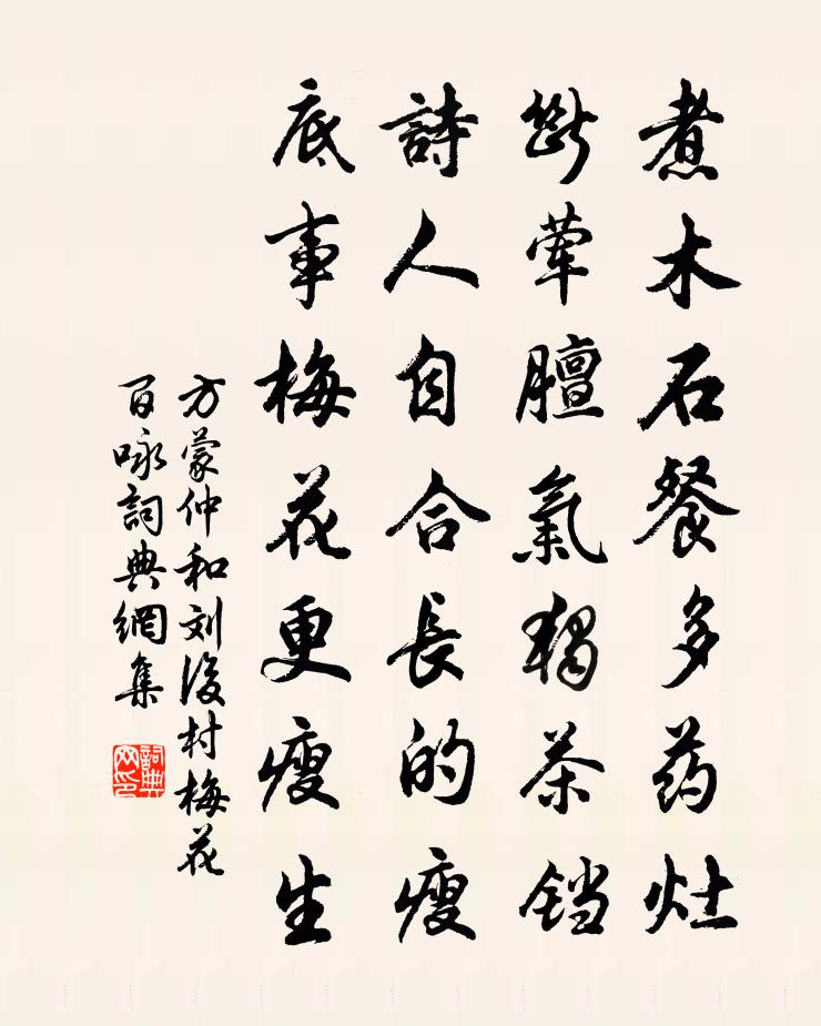 詩詞名句歷史字典書法欣賞書法字典國語詞典說文解字康熙字典古漢語字典標 題 作 者 詩 句 和劉後村梅花百詠作者:方蒙仲 朝代:宋代和劉後村梅花百詠原文煮木石餐多藥灶,斷葷膻氣獨茶鐺。詩人自合長的瘦,底事梅花更瘦生。詩詞問答問:和劉後村梅花百詠的作者是誰?答:方蒙仲問:和劉後村梅花百詠寫於哪個朝代?答:宋代方蒙仲和劉後村梅花百詠書法欣賞和劉後村梅花百詠書法作品詩詞推薦郴江百詠並序潮井阮閱〔宋代〕朔月盈虧已可疑,隨泉上下更難知。錢塘江在吳山外,誰見來時與落時。感皇恩蔡伸〔宋代〕王孫何在,不念玉容消瘦。日長深院靜,簾垂繡。璨枕墮釵,粉痕輕溜。玉鼎龍涎記同嗅。鈿箏重理,心事謾憑纖東陽夜怪詩(敬去文詠雪獻曹州房)佚名〔唐代〕愛此飄颻六出公,輕瓊冷絮舞長空。當時正逐秦丞相,騰躑川原喜北風。隔浦蓮(會老香堂,和美成)吳潛〔宋代〕扇荷偷換羽葆。院宇人聲窈。獨步亭皋下,闌乾並、棲幽鳥。新雨抽嫩草。檐花鬧。一片萍鋪沼。燕雛小。書空底清溪胡溥〔宋代〕楊柳汀洲綠四圍,沙中禽鳥雜相依。煙留群鷺和鷗臥,霞帶孤鴻與鶩飛。花月吟效連珠體十一首 8唐寅〔明代〕有花無月恨茫茫, 有月無花恨轉長; 花美似人臨月鏡, 月明如水照花香。 扶笻月下尋花步, 攜酒花前帶滿庭芳蔡伸〔宋代〕鸚鵡洲邊,芙蓉城下,迥然水秀山明。小舟雙槳,特地訪雲英。驚破蘭衾好夢,開朱戶、一笑相迎。良宵永,南窗薊丘覽古贈盧居士藏用七首。郭隗陳子昂〔唐代〕逢時獨為貴,歷代非無才。隗君亦何幸,遂起黃金台。(末缺)偈頌五十一首釋大觀〔宋代〕開口失,閉口南腔北調。脫白露淨,矢在弦上。游漢州西湖陸游〔宋代〕房公一跌叢眾毀,八年漢州為剌史。遶城鑿湖一百頃,島嶼曲折三四里。小庵靜院穿竹入,危榭飛樓壓城起。空濛謝湖山居士示和陶詩樓鑰〔宋代〕淵明千載人,同節仰孤峭。豈惟辭督郵,蓮社不得召。書不求甚解,眼高得玄要。詩亦本無意,但寫胸中妙。齊梁寄題成都張宰壓雲樓二絕洪咨夔〔宋代〕氣如軻也生於義,道似參乎任以仁。乾蓋坤輿猶塞破,何難壓倒玉嶙峋。挽劉金部陳元晉〔宋代〕忠清家法見聞中,蜀產凋零又到公。搞偽一門誠節誼,明倫數語最精忠,郎替勇退聲名重,使傳賢勞惠利豐。時事夜興汪莘〔宋代〕簟紋如水浸蟾光,睡覺湖邊月半床。道是廣寒疑不是,月中那得藕花香。香奩體五首葉茵〔宋代〕相思獨向小窗明,試翦春衣趁晚晴。還覺此情絲樣小,欲裁不斷奈何情。長命洲楊修〔宋代〕梁武慈悲不鼎烹,蒙恩豢養亦虛名。狐狸口腹應潛飽,就死多於日放翁。游武夷作棹歌呈晦翁十首辛棄疾〔宋代〕見說仙人此避秦,愛隨流水一溪雲。花開花落無尋處,仿佛 * 月夜聞。雪晴曾幾〔宋代〕衾裯一夜冷於冰,雪事心知作得成。自起穴窗看不見,卻來欹枕聽無聲。下床走報童心喜,開戶驚呼老眼明。晴日酬玉汝吳汝弌〔宋代〕日暮雲倒飛,苦雨濕茅屋。奇哉五碎金,青草眠黃犢。天行貴葆真,心骨迥凡俗。一尺 * 花,秋風播芳馥。廬山詩朱元璋〔明代〕廬山竹影幾千秋,雲鎖高峰水自流。萬里長江飄玉帶,一輪明月滾金球。路遙西北三千界,勢壓東南百萬州。美景名句推薦天行有常,不為堯存,不為桀亡。應之以治則吉,應之以亂則凶。荀子《荀子·天論》 天生我材必有用,千金散盡還復來。李白《將進酒》 手如柔荑,膚如凝脂佚名《碩人》 善無主於心者不留,行莫辯於身者不立。墨子《墨子·02章 修身》 若待上林花似錦,出門俱是看花人。楊巨源《城東早春》 責人之心責己,恕己之心恕人。佚名《增廣賢文·上集》 閒倚博山長嘆,淚流沾皓腕。韋莊《歸國遙·春欲晚》 深村時節好,應為去年豐。范成大《寒食郊行書事》 尋常一樣窗前月,才有梅花便不同。杜耒《寒夜》 口惠而實不至,怨菑及其身。戴聖《禮記·表記》
