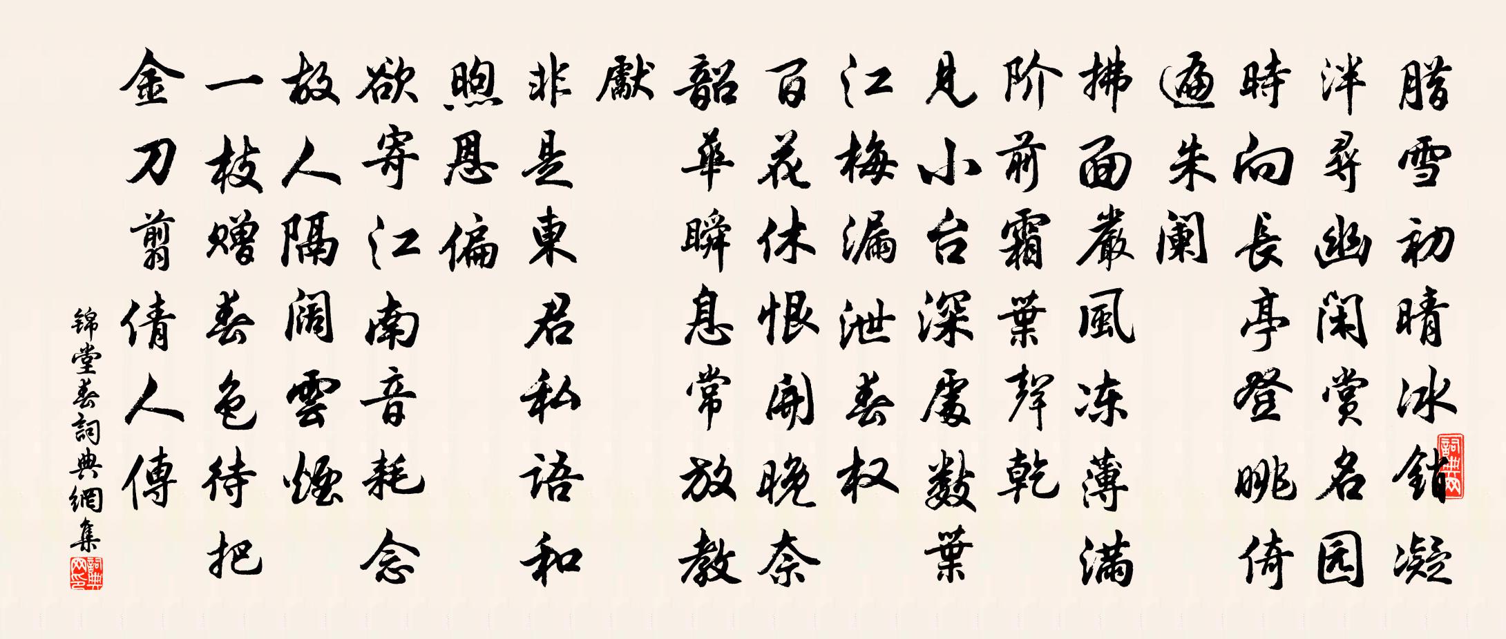 臘雪初晴,冰銷凝泮,尋幽閒賞名園。時向長亭登眺,倚遍朱闌。