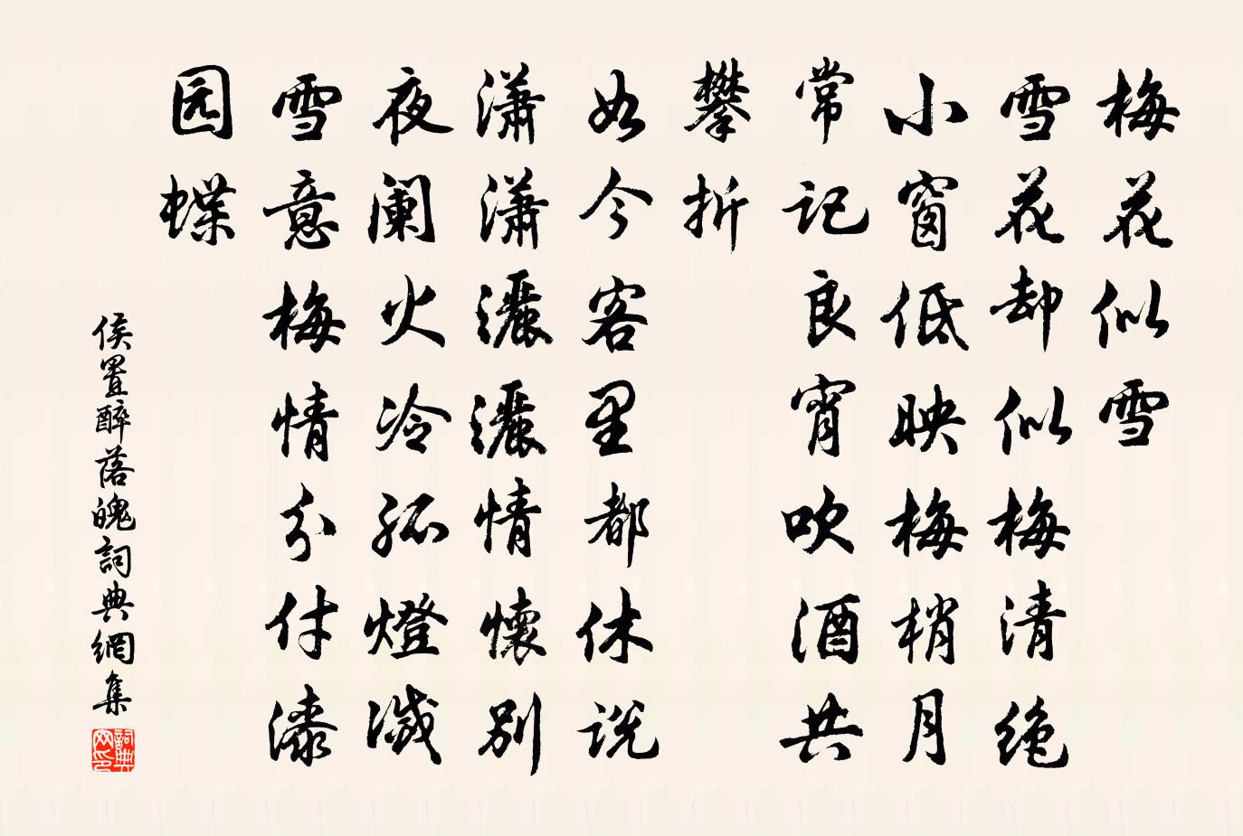 詩詞名句歷史字典書法欣賞書法字典國語詞典說文解字康熙字典古漢語字典標 題 作 者 詩 句 醉落魄/一斛珠作者:侯置 朝代:宋代醉落魄/一斛珠原文梅花似雪。雪花卻似梅清絕。小窗低映梅梢月。常記良宵,吹酒共攀折。如今客里都休說。瀟瀟灑灑情懷別。夜闌火冷孤燈滅。雪意梅情,分付漆園蝶。詩詞問答問:醉落魄/一斛珠的作者是誰?答:侯置問:醉落魄/一斛珠寫於哪個朝代?答:宋代問:醉落魄/一斛珠是什麼體裁?答:詞侯置醉落魄/一斛珠書法欣賞醉落魄/一斛珠書法作品詩詞推薦超然錢時〔宋代〕結茅山頂得超然,莫也超然在外邊。要識老夫行樂處,鳶飛魚躍總吾天。題惠老所藏歲寒圖袁說友〔宋代〕寒梢獨挺昂霄意,蒼蓋猶矜傲雪顏。盤膝倦吟無一事,老僧心與白雲閒。閒居雜詠三十二首手陳淳〔宋代〕手所以司執,所執必正事。回德謹勿持,持必為痿痺。寄趙菊東山長三首熊禾〔宋代〕澹然幽貞姿,乃是夕英菊。托根九秋抄,霜露淒已肅。我疑靈均伴,只有淵明獨。采采黃金花,豈意杜陵曲。偈頌七十八首釋正覺〔宋代〕麟龍不為瑞,珠璧不為貴。衲僧眼豁開,徹見生死蔕。生死蔕,第一義。諸佛心,祖師鼻。少林傳燈,靈山授記。學海樓和水心先生韻薛師石〔宋代〕江口潮生夜語喧,月殘叭有數得存。更憑高處觀空闊,始悟乾坤是易門。遠老惠雪中觀梅詩次韻以謝吳芾〔宋代〕山頭飛雪已漫漫,雲散須臾復見山。踏雪不辭來野外,愛梅須遍走林間。為憐孤艷思經目,擬索疏枝笑解顏。師肯開歲半月湖村梅開無餘偶得五詩以煙濕落梅村陸游〔宋代〕昨日春已來,盎盎滿江村;落梅亦多情,點點浮清樽。語離聊一醉,不恨村酒渾。人生共如此,已矣兩忘言!頌古十一首釋有權〔宋代〕揭大夔鼓譟紅塵,遍地刀鑰解出身。結角羅紋隨處入,銀山鐵壁是通津。水調歌頭李光〔宋代〕獨步長橋上,今夕是中秋。群黎怪我何事,流轉古儋州。風定潮平如練,雲散月明如晝,孤興在扁舟。笑盡一杯酒題濟川亭釋宗覺〔宋代〕高亭窺綠潤,古寺面蒼陰。聞有遺仙事,應容過客尋。路危山背迥,雲重洞天深。一鳥不飛去,時能弄好音。題甘茂祠李復〔宋代〕奮身孤旅相秦王,欲去憂讒倫樂羊。不有私金助心賞,可能明日拔宜陽。馬伏波請征蠻據鞍矍鑠時年六十一陸鴻漸景陵鄭剛中〔宋代〕去年寥落征鞍急,矍鑠殊非馬伏波。今此有緣希陸羽,暮途求佛又何如。水月宋祁〔宋代〕渺渺遡雲波,盈盈柅霜馭。碎璧擁舟來,流金映沙聚。夜寂波已休,何人薦真趣。浣溪沙晏殊〔宋代〕楊柳陰中駐彩旌。芰荷香里勸金觥。小詞流入管弦聲。只有醉飲寬別恨,不須朝暮促歸程。雨條菸葉系人情。郡齋戲句晁說之〔宋代〕一夫肆力能排闥,萬旅無謀謾仰關。成敗是非今有底,忍將鞭朴作威顏。黃蓮花韓維〔宋代〕淺白輕黃雨未分,飛來人世作朝雲。天教細雨常遮護,留得清香數日聞。出歌孫楚〔魏晉〕茱萸出芳樹顛。鯉魚出洛水泉。白鹽出河東。美豉出魯淵。薑桂茶荈出巴蜀。椒橘木蘭出高山。蓼蘇出溝渠。精{寄興善寺崔律師無可〔唐代〕沐浴前朝像,深秋白髮師。從來居此寺,未省有東池。幽石叢圭片,孤鬆動雪枝。頃曾聽道話,別起遠山思。明經試大義多不通有感依韻和范景仁舍人梅堯臣〔宋代〕明經與進士,皆欲取公卿。自是俗儒陋,非於吾道輕。昔由羔雁聘,今乃草萊並。不措一辭去,緣何祿代耕。名句推薦惡之者眾則危。荀子《荀子·正論》 是親不是親,非親卻是親。佚名《增廣賢文·上集》 雲無心以出岫,鳥倦飛而知還。陶淵明《歸去來兮辭·並序》 論山水,則循聲而得貌;言節侯,則披文而見時。劉勰《文心雕龍·辨騷》 茶之筍者,竽爛石沃土,長四、五寸,若薇蕨始抽,凌露采焉。陸羽《茶經·三之造》 煙塵犯雪嶺,鼓角動江城。杜甫《歲暮》 萬條千縷綠相迎。舞煙眠雨過清明。晏幾道《浣溪沙·二月和風到碧城》 中山孺子倚新妝,鄭女燕姬獨擅場。李夢陽《汴京元夕》 貧居鬧市無人問,富在深山有遠親。佚名《增廣賢文·上集》 無父無君,是禽獸也。孟子《孟子·滕文公章句下·第九節》