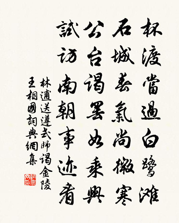 詩詞名句歷史字典書法欣賞書法字典國語詞典說文解字康熙字典古漢語字典標 題 作 者 詩 句 送遵式師謁金陵王相國作者:林逋 朝代:宋代送遵式師謁金陵王相國原文杯渡當過白鷺灘,石城春氣尚微寒。公台謁罷如乘興,試訪南朝事跡看。詩詞問答問:送遵式師謁金陵王相國的作者是誰?答:林逋問:送遵式師謁金陵王相國寫於哪個朝代?答:宋代林逋送遵式師謁金陵王相國書法欣賞送遵式師謁金陵王相國書法作品詩詞推薦拈古十四首釋法薰〔宋代〕來風可辨,駟馬難追。若無後語,討甚大悲。南華卓錫泉復出朱翌〔宋代〕竹龍銜尾轉山房,飲足寒清滴夜長。曾問鞠窮目眢井,為焚安息坐胡床。千山從此俱蒙潤,一線才通未可量。六月句釋善昭〔宋代〕陣雲橫海上,拔劍攪龍門。奉和元日賜群臣柏葉應制趙彥昭〔唐代〕器乏雕梁器,材非構廈材。但將千歲葉,常奉萬年杯。走馬燈賡張樞副韻吳潛〔宋代〕半勺蘭膏暖焰生,恍疑赤壁夜鏖兵。騎乘猛燎賓士疾,人運長鎗轉戰輕。旗影靜移雲母帳,劍鋩微掣水晶營。何人達士孟郊〔唐代〕四時如逝水,百川皆東波。青春去不還,白髮鑷更多。達人識元化,變愁為高歌。傾產取一醉,富者奈貧何。君看書粢上人庵釋惠璉〔宋代〕雨餘野禽聲斷續,清陰碧流繞茅屋。道人乞食晚未歸,獨向殘陽淡雲木。大水行王炎〔宋代〕屯雲墨色日將暮,晦明揮霍雨如注。水聲夜半搖匡床,平旦出門吁可畏。盤渦溔瀁吞邊旁,悍流洶湧行中央。日中城東鄭獬〔宋代〕草濕煙村暴雨晴,踏沙閒信馬蹄行。客心到處不稱意,春色向人如有情。野外一雙新燕去,叢間三數小花明。松溪鷓鴣天(壽友人母)李漳〔宋代〕淑德由來孟母名。方瞳鶴髮瑩精神。天教遐算靈椿比,親見賢郎擢桂榮。逢誕日,慶孫曾。金花綸誥又重新。願君吳越王與陶穀酒令佚名〔唐代〕白玉石,碧波亭上迎仙客。(吳越王)口耳王,聖明天子要錢塘。(陶穀)試院唱酬十一首其八次前韻三首之一蘇轍〔宋代〕老去在家同出家,楞伽四卷即生涯。粗詩怪我心猶壯,細字憐君眼未花。霜落初驚衾簟冷,酒酣猶喜笑言嘩。歸心牡丹舒岳祥〔宋代〕九枝初拆御袍紅,艷質煌煌日正中。曾對集英瞻袞冕,孤臣灑淚立東風。贈徑山銛書記陸游〔宋代〕徑山老將無勍敵,百萬魔軍俱掃跡。座下何人策雋功,籌略縱橫銛記室。銛公聲名滿吳會,惟有放翁最先識。奕奕題十里塘夜景楊萬里〔宋代〕物色當秋半,登臨更夜闌。山光倒眠水,水影上搖山。宿鷺都飛去,漁人獨未還。老夫與明月,分割一清灣。山中有所思王嵒〔宋代〕零零夜雨漬愁根,觸物傷難了斷魂。莫怪杜鵑飛去盡,紫微花里有啼猿。殘月寇準〔宋代〕半夜沉清影,宵殘猶伴吟。已甘垂樹杪,由得掛天心。淡色迷蓬戶,餘光映宿禽。誰家傷早別,凝思共沉沉。過新息留示鄉人任師中蘇軾〔宋代〕昔年嘗羨任夫子,卜居新息臨淮水。怪君便爾忘故鄉,稻熟魚肥信清美。竹陂雁起天為黑,(小竹陂在縣北。)桐邯鄲才人嫁為廝養卒歸趙文〔宋代〕鴛鴦異野鶩,鳳凰非山雞。物生各有偶,非偶不並棲。昔為叢台人,今為圉者妻。亦知久當棄,無乃太不齊。同時金字經·樵隱馬致遠〔元代〕擔挑山頭月,斧磨石上苔。且做樵夫隱去來。柴,買臣安在哉?空岩外,老了棟樑材。名句推薦黃雲隴底白雲飛,未得報恩不能歸。李頎《古意》 呵筆難臨帖,敲床且煮茶。大須《暮雪》 雁過也,正傷心,卻是舊時相識。李清照《聲聲慢·尋尋覓覓》 以國為國,以天下為天下。劉向 編《六親五法》 幼敏悟過人,讀書輒成誦。歐陽修《畫地學書》 聚散匆匆,此恨年年有。魏夫人《點絳唇·波上清風》 重賞之下,必有勇夫。畢沅《續資治通鑑·宋紀·宋紀十七》 歸時休放燭光紅,待踏馬蹄清夜月。李煜《木蘭花·曉妝初了明肌雪》 玉顏憔悴三年,誰復商量管弦。王建《宮中調笑·團扇》 老吾老,以及人之老;幼吾幼,以及人之幼司馬光《資治通鑑·漢紀·漢紀四十二》