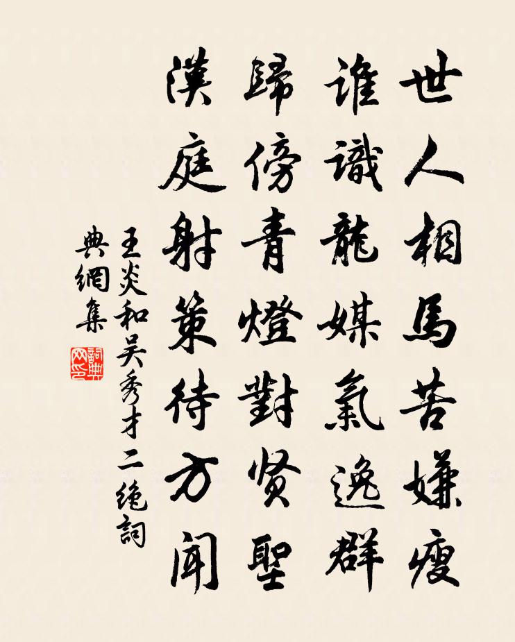 詩詞名句歷史字典書法欣賞書法字典國語詞典說文解字康熙字典古漢語字典標 題 作 者 詩 句 和吳秀才二絕作者:王炎 朝代:宋代和吳秀才二絕原文世人相馬苦嫌瘦,誰識龍媒氣逸群。歸傍青燈對賢聖,漢庭射策待方聞。詩詞問答問:和吳秀才二絕的作者是誰?答:王炎問:和吳秀才二絕寫於哪個朝代?答:宋代王炎和吳秀才二絕書法欣賞和吳秀才二絕書法作品詩詞推薦晉陽三月未有春色司馬光〔宋代〕天心均煦嫗,物態異芬芳。上國花應爛,邊城柳未黃。清明空改火,元已漫浮觴。仍說秋寒早,年年八月霜。再次首唱韻和錢惟演〔宋代〕雲變危峰萬里橫,簟鋪湘水一床平。紅蘭受露消晨渴,綠蕙翻風析夜酲。逸少偶書葵扇貴,羊欣閒臥練裙輕。無妨春曉曲朱敦儒〔宋代〕西樓落月雞聲急。夜浸疏香寒淅瀝。玉人酒渴嚼春冰。曉色入簾橫寶瑟。戲答荊州王充道烹茶四首黃庭堅〔宋代〕茗椀難加酒椀醇,暫時扶起藉糟人。何須忍垢不濯足,苦學梁州陰子春。宗忠簡公畫像贊陳炳〔宋代〕平生孔明,稱慕莫及。像見忠簡,懦夫有立。橫流砥柱,萬里長城。欲奮空弮,以植危傾。猛將斂手,氣指目使。夏夜陸游〔宋代〕結屋在郊墟,翛然謝炎熾。窗扉故闃寂,水竹亦幽邃。飛蟲望燈集,棲燕沖雨至。石枕與葛幮,美哉今夕睡。水調歌頭京鏜〔宋代〕百龜堞龜城北龜,江勢遠龜連空。杠梁濟涉,渾似溪澗飲長虹。覆以翬飛華宇,載以魚浮疊石,守護有神龍。好看貴池道中作張祜〔唐代〕羸驂驅野岸,山遠路盤盤。清露月華曉,碧江星影寒。離群徒長泣,去國自加餐。霄漢寧無舊,相哀自語端。郡圃觀白蓮王同祖〔宋代〕翠蓋亭亭映玉裳,臨風{棹左換彳}彴暗飄香。六郎正被繁華困,不愛濃妝愛淡妝。問劉十九白居易〔唐代〕綠蟻新醅酒,紅泥小火爐。晚來天欲雪,能飲一杯無!游昌化精舍柳明獻〔唐代〕寶台侵漢遠,金地接霞高。何必游天外,忻此契盧敖。虞美人洪适〔宋代〕芭蕉滴滴窗前雨。望斷江南路。亂雲重疊幾多山。不似倦飛鷗鷺、便知還。角聲更聽譙門弄。夜夜思歸夢。鄱江樓句黃景說〔宋代〕肯隨桃李鬭梳妝。興慶池禊宴趙濟〔宋代〕撫封占清境,禊宴協良辰。物態隨春秀,歌聲洽政淳。擷芳尋陌綺,泛棹擊波鱗。天幸陪開府,非才愧席賓。題寧國院十全堂方洵武〔宋代〕盧扁不世出,死生非在人。草木孕妙理,金玉潛至神。用之固有序,品制非君臣。世之挾術者,不啻空中塵。悉以定風波令/定風波周紫芝〔宋代〕梅粉梢頭雨未乾。淡煙疏日帶春寒。暝鴉啼處,人在小樓邊。芳草只隨春恨長,塞鴻空傍碧雲還。斷霞銷盡,新月句高似孫〔宋代〕魚帶淞江月盈缶,雋處依稀開蟹斗。三言重擬五雜組聯句顏真卿〔唐代〕五雜組,四豪客。往復還,阡與陌。不得已,長沙謫。 ——張薦五雜組,五辛盤。往復還,馬上諸丈賡示前章再次韻張縯〔宋代〕桃李層層媚遠天,碧蕪映帶綺成川。英靈舊有凌雲賦,混一長看建武年。老去無知經世用,夢歸欲問激江船。請君句尤袤〔宋代〕寒窗莫怪吟聲苦,舉室長懸似細腰。名句推薦九日龍山飲,黃花笑逐臣。李白《九日龍山飲》 江上小堂巢翡翠,苑邊高冢臥麒麟。杜甫《曲江二首》 泛菊杯深,吹梅角遠,同在京城。劉過《柳梢青·送盧梅坡》 望望不見君,連山起煙霧。李白《金鄉送韋八之西京》 榮螈,蜥蜴。佚名《爾雅·釋魚》 始知鎖向金籠聽,不及林間自在啼。歐陽修《畫眉鳥》 興盡晚回舟,誤入藕花深處。李清照《如夢令·常記溪亭日暮》 雲無心以出岫,鳥倦飛而知還。陶淵明《歸去來兮辭·並序》 我愛山中春,蒼崖鳥一聲。元鵬《山中四詠》 凡天下禍篡怨恨,其所以起者,以不相愛生也,是以仁者非之。墨子《墨子·15章 兼愛(中)》