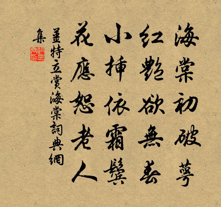 詩詞名句歷史字典書法欣賞書法字典國語詞典說文解字康熙字典古漢語字典標 題 作 者 詩 句 賞海棠作者:姜特立 朝代:宋代賞海棠原文海棠初破萼,紅艷欲無春。小插依霜鬢。花應恕老人。詩詞問答問:賞海棠的作者是誰?答:姜特立問:賞海棠寫於哪個朝代?答:宋代姜特立賞海棠書法欣賞賞海棠書法作品詩詞推薦偈頌十八首釋道璨〔宋代〕登芝山,望五老。雲靜日月正,眼高天地小。達磨大師脊骨等閒踏折,釋迦老子心肝五臟一時見了。因思擾擾塵寰酒泉子王寂〔元代〕禊飲連宵。簾卷曉風香鴨噴,兒孫羅拜捧金荷。沸笙歌。赤霜袍軟髻嵯峨。名在仙班應不老,人間歲月盡飛梭。柰留杭近三年得去賦不可不出城方回〔宋代〕不可不出城,頑軀百無病。不可不出城。老眼亦何淨。第一脫俗塵,最便於野性。第二井不鹹,所至水可飲。第三冬夜寄溫飛卿魚玄機〔唐代〕苦思搜詩燈下吟,不眠長夜怕寒衾。滿庭木葉愁風起,透幌紗窗惜月沈。疏散未閒終遂願,盛衰空見本來心。幽棲潘歙州寄紙三百番石硯一枚梅堯臣〔宋代〕永叔新詩笑原父,不將澄心紙寄予。澄心紙出新安郡,臘月敲冰滑有餘。潘侯不獨能致紙,羅紋細硯鐫龍尾。墨花下直宋祁〔宋代〕殿樓傳鼓報歸鞍,槐道逶迤出九關。雨罷浮雲留北闕,朝來爽氣遍西山。倏逢行幰排輈度,稍見晴鴉接翅還。痴計宮詞 / 宮中詞朱慶餘〔唐代〕寂寂花時閉院門,美人相併立瓊軒。含 * 說宮中事,鸚鵡前頭不敢言。寧考神御奉安原廟王遂〔宋代〕經旬風雨陡新晴,一夜蟾光直到明。清曉衣冠原廟去,分明眷佑似平生。余仲鏞從辟廣西示洪景盧所作松風閣記題詩反周必大〔宋代〕小松風颼颼,長松風冽冽。遙知蒙溪上,餘韻兩清絕。宦遊正可樂,歸夢未應切。待生丁固腹,徐化莊周蝶。題太和宰卓士直寄新刻山谷快閣詩真跡二首楊萬里〔宋代〕快閣江鷗遠避人,西昌山月暗吹塵。百年卓茂傳詩印,印出風光色色新。賢者之孝二百四十首契林同〔宋代〕天性生雖具,人倫教可無。往哉親父子,汝契作司徒。艾人六言二首劉克莊〔宋代〕欹枕三彭暫去,燒船五鬼俱還。我欲膝行倒屣,君無髮上沖冠。沁園春游九言〔宋代〕五十帶五年,滿帶簪華發,帶儼然遂良帶。又何曾戚戚,蓽門圭竇,何曾汲汲,玉帶金章。困後高眠,飢來飽□,婆羅門引 望月元好問〔金代〕素蟾散彩,九秋風露發清妍。常娥盡有情緣。留著三五盈盈,永夜照憑肩。看晚妝臨鏡,若個嬋娟。尋常月圓。恨德茂以兩小篇報聘再成一章王洋〔宋代〕不著冠纓不洗塵,不將忙事擾閒身。舍前自舊存三徑,林下如今見一人。八節灘聲泉喚客,數枝墨戲竹傳神。前生丁酉初春和張欽夫榕溪閣五言曾達臣輓詞楊萬里〔宋代〕榕影下照水,翠蚊舒復樛。溪光迸升檐,朱夏凍以幽。高閣昔雨荒,奇觀久風休。南軒天遣來,山谷神與謀。字新菊謝枋得〔宋代〕淵明豈但隱逸人,淵明素懷諸葛志。清香不獨占秋天,菊潭一滴三千歲。軍中雜歌陸游〔宋代〕北面行台號令新,繡旗豹尾渡河津。檄書才下降書至,不用兒郎打女真。村居二首陳傅良〔宋代〕業已將身落耦耕,時於觀物悟浮生。擇棲未定鳥離立,避礙已通魚並行。野老窺巢占太歲,牧兒敲角報殘更。絕勝東湖感事二首李石〔宋代〕桃李洲中別一春,雪山肯為障紅塵。鬼神半夜應憐我,魑魅今朝不喜人。煙雨晦明窗外眼,風霜來去樹邊身。細思名句推薦已覺逝川傷別念,復看津樹隱離舟。王勃《秋江送別二首》 樹繞村莊,水滿陂塘。秦觀《行香子·樹繞村莊》 參差煙樹灞陵橋,風物盡前朝柳永《少年游·參差煙樹灞陵橋》 殘星幾點雁橫塞,長笛一聲人倚樓。趙嘏《長安晚秋 / 秋望 / 秋夕》 百二禁兵辭象闕,三千宮女下龍舟。許渾《汴河亭》 長袖善舞,多錢善賈。韓非及後人《韓非子·五蠹》 觀天下書未遍,不得妄下雌黃。顏之推《顏氏家訓·勉學篇》 律回歲晚冰霜少,春到人間草木知。張栻《立春偶成》 盡做舊愁都忘卻,新愁何處著王庭筠《謁金門·雙喜鵲》 晴浦晚風寒,青山玉骨瘦。董以寧《卜運算元·雪江晴月(回文,倒讀《巫山一段雲》