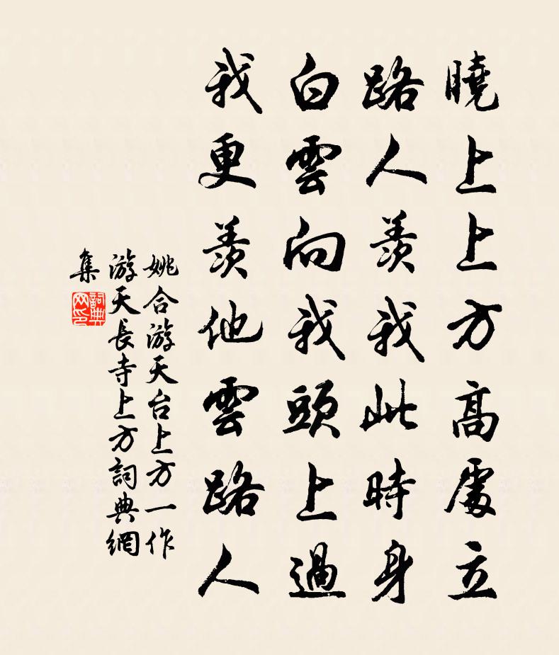 詩詞名句歷史字典書法欣賞書法字典國語詞典說文解字康熙字典古漢語字典標 題 作 者 詩 句 游天台上方(一作游天長寺上方)作者:姚合 朝代:唐代原文曉上上方高處立,路人羨我此時身。白雲向我頭上過,我更羨他雲路人。詩詞問答問:《游天台上方(一作游天長寺上方)》的作者是誰?答:姚合問:該詩寫於哪個朝代?答:唐代問:該詩是什麼體裁?答:七絕書法欣賞游天台上方(一作游天長寺上方)書法作品注釋全唐詩:卷500-16詩詞推薦以坡公君如大江日千里我如此水千山底為韻作趙蕃〔宋代〕落此鼪鼯野,宜從麋鹿群。何知交友內,而乃得夫君。樂府雜曲。鼓吹曲辭。芳樹徐彥伯〔唐代〕玉花珍簟上,金縷畫屏開。曉月憐箏柱,春風憶鏡台。箏柱春風吹曉月,芳樹落花朝暝歇。稿砧刀頭未有時,攀條冰山陳宓〔宋代〕出自重陰地,來陳酷暑天。崢嶸真可仰,刻轢更成妍。氣與驕陽敵,峰將太華肩。有人心計巧,直欲厄其巔。雪九首傅察〔宋代〕墨雲埋日車,厚雪鎮坤軸。行路勿匆匆,包藏恐深谷。六州歌頭(客贈牡丹)劉克莊〔宋代〕維摩病起,兀坐等枯株。清晨里,誰來問,是文殊。遣名姝。奪盡群花色,浴才出,酲初解,千萬態,嬌無力,困【商角調】黃鶯兒庾吉甫〔元代〕懷古,懷古,廢興兩字,干戈幾度?問當時富貴誰家?陳宮後主。【踏莎行】殘照底西風老樹,據秦淮終是帝王都短歌寄鼓山長老齊己〔唐代〕雪峰雪峰高且雄,峨峨堆積青冥中。六月赤日燒不熔,飛禽瞥見人難通。常聞中有白象王,五百象子皆威光。行圍別舍弟杜荀鶴〔唐代〕欲往往不得,出門天氣秋。惟知偷拭淚,不忍更回頭。此日只愁老,況身方遠遊。孤寒將五字,何以動諸侯?寒草梅堯臣〔宋代〕寒草才變枯,陳根已含綠。始知天地仁,誰道風霜酷。和陸伯微韻袁甫〔宋代〕皇都喜見天宇晴,好風拂掠條不鳴。幽人領袖二三子,適意涌金門外行。雲岫重重仍翼翼,舉頭不愧林間翮。賞心古宮詞十首劉克莊〔宋代〕繐帳渾如舊,何曾奏伎來。君王不終惠,留妾在空台。黃香橙李匡〔宋代〕黃雲冉冉曉蒼蒼,閒倚平湖只自香。較似寒梅雖未至,依然風韻挾風霜。喜雨詩張昭遠〔宋代〕禱旱何妨抵死求,分明在處有神湫。只消一念精誠格,立使風雷布九州。詩一首於本大〔宋代〕自從明府升仙后,出入塵寰直至今。不是藏名混時候,賣柴沽酒貴無心。和胡仲方攝縣喜雨三首釋寶曇〔宋代〕雨入黃梅故弄晴,群龍鬚我一投誠。此無盡藏君為主,大貝明珠我得傾。喜定太學生湖州士子詹琰夫〔宋代〕湖州士子,姓外不詳,寧宗嘉定間有戲和楊長孺詩。整風了《鶴林玉露》乙編卷一。蝶戀花·暮春別李公擇蘇軾〔宋代〕簌簌無風花自墮。寂寞園林,柳老櫻桃過。落日有情還照坐,山青一點橫雲破。路盡河回人轉舵。系纜漁村,月暗踏青游佚名〔宋代〕竹外溪邊,一枝破寒衛臘。瑩素肌、玉雕冰刻。賦閒標,足餘韻,豈同常格。最風流,生來處處盡好,別得造化工書逆旅壁陸游〔宋代〕百憂襲暮年,懷抱日騷屑。雖雲歸故鄉,何異萬里客。窮冬迫寒餓,凜有在陳厄。駕言適近村,慘慘天欲雪。人沽贈前京華王制屬洪咨夔〔宋代〕赤時風欲盡,黃花霜未乾。病添予許老,窮迫子能寒。劍蝕蛟還吼,袍塵鶻尚盤。山東河北事,欲語淚汍瀾。名句推薦常人安於故習,學者溺於所聞。商鞅《商君書·更法》 問君何事輕離別,一年能幾團圓月。納蘭性德《菩薩蠻·問君何事輕離別》 相思已是不曾閒,又那得、工夫咒你。蜀妓《鵲橋仙·說盟說誓》 梅定妒,菊應羞。畫闌開處冠中秋。李清照《鷓鴣天·桂花》 洛陽城裡見秋風,欲作家書意萬重。張籍《秋思》 玉露金風報素秋,穿針樓上獨含愁。德容《七夕二首·其一》 棠梨花映白楊樹,儘是死生別離處。白居易《寒食野望吟》 鄉村四月閒人少,才了蠶桑又插田。翁卷《鄉村四月》 莫道桑榆晚,為霞尚滿天。劉禹錫《酬樂天詠老見示》 坐蔭從容煩暑退,清心恍惚微香觸。陸容《滿江紅·詠竹》