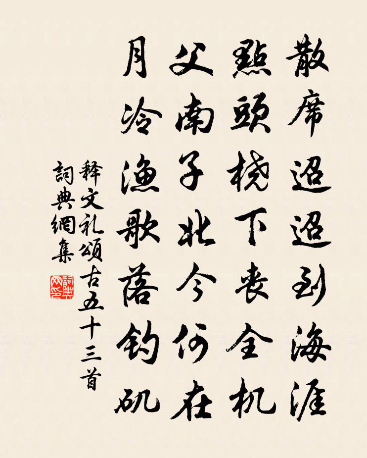 詩詞名句歷史字典書法欣賞書法字典國語詞典說文解字康熙字典古漢語字典標 題 作 者 詩 句 頌古五十三首作者:釋文禮 朝代:宋代頌古五十三首原文散席迢迢到海涯,點頭橈下喪全機。父南子北今何在,月冷漁歌落釣磯。詩詞問答問:頌古五十三首的作者是誰?答:釋文禮問:頌古五十三首寫於哪個朝代?答:宋代釋文禮頌古五十三首書法欣賞頌古五十三首書法作品詩詞推薦酹江月/念奴嬌佚名〔宋代〕歡聲雷動,問邦民,知道君候生日。欲把天文占好事,夜半遙瞻南極。耿耿三台,寒光相射,瑞采連珠壁。自今以句高似孫〔宋代〕夏蟹新中食,初菘脆入虀。張騫冢祠文同〔宋代〕中梁山麓漢水濱,路側有墓高嶙峋。叢祠蓊蔚蔽野霧,榜曰博望侯之神。當年寶幣走絕域,此日雞豚邀小民。君不夜遊宮楊 * 〔宋代〕淚眼偎人強斂。鮫綃上、尚餘斑點。別後何愁不相見。只愁伊,被旁人,施暗箭。致得心腸轉。教令得、神魂撩亂句李如箎〔宋代〕繅車籬落桑陰盡,土鼓鄉亭稻葉青。誰氏子文同〔宋代〕縹緲誰氏子,學道要長仙。人世豈不樂,何苦求上天。反首顧我語,子豈得謂賢。智如撲燈蛾,甘就膏火煎。道情偈三首貫休〔唐代〕崆峒老人專一一,黃梅真叟卻無無。獨坐松根石頭上,四溟無限月輪孤。非色非空非不空,空中真色不玲瓏。可憐成都信藏主求送行釋寶曇〔宋代〕又得南方一信歸,君臣父子卻饒伊。五年乳竇峰前路,曾把虛空碎一槌。偈頌四十二首釋祖先〔宋代〕天上月圓,人間月半。子細看來,從頭錯算。姮娥昨夜失金鍼,撼動玉樓尋不見。依韻和公儀龍圖招諸公觀舞及畫三首梅堯臣〔宋代〕落花淨掃青陰長,野蝶閒飛綠草閒。侍從歸來看鶴舞,便將樽酒欲招閒。送希真入洛李處權〔宋代〕一踏紅塵又五年,倦遊翻作送行篇。春花秋月誰無分,伊水崧雪自有緣。我比嵇康猶更懶,子追元亮故應賢。因歸三峽酈道元〔南北朝〕自三峽七百里中,兩岸連山,略無闕處。重岩疊嶂,隱天蔽日。自非亭午夜分,不見曦月。 至於夏水襄陵,沿贈妓人王福娘孫棨〔唐代〕彩翠仙衣紅玉膚,輕盈年在破瓜初。霞杯醉勸劉郎賭,雲髻慵邀阿母梳。不怕寒侵緣帶寶,每憂風舉倩持裾。謾圖東樓夜望陳藻〔宋代〕愁來無酒話無人,明月樓中萬里身。說與長江流水去,汝今穿海入吾閩。封泰山樂章。豫和佚名〔唐代〕樂已終,煙燎上。懷靈惠,結皇想。歸風疾,迴風爽。百福來,眾神往。春曉陸龜蒙〔唐代〕春庭曉景別,清露花邐迤。黃蜂一過慵,夜夜棲香蕊。春日秦觀〔宋代〕一夕輕雷落萬絲,霽光浮瓦碧參差。有情芍藥含春淚,無力薔薇臥曉枝。沙頭點視城池陳杰〔宋代〕酸風射眼舊沙頭,我亦從來兩鬢秋。萬里客心驚塞雁,五更歸夢化江鷗。山川信美坐成晚,風景不殊看總愁。征築將赴荊南,寄別李劍州杜甫〔唐代〕使君高義驅今古,寥落三年坐劍州。但見文翁能化俗,焉知李廣未封侯。路經灩澦雙蓬鬢,天入滄浪一釣舟。戎馬寄黃雲心胡仲參〔宋代〕竹屋少行跡,閉門春晝長。天時半晴濕,人意共炎涼。苔蘚侵階綠,荼醾壓架香。冥搜尋杖屨,不為看花忙。名句推薦防民之口,甚於防川。左丘明《國語·周語·邵公諫厲王弭謗》 調角斷清秋,征人倚戍樓。張喬《書邊事》 國無三年之食者,國非其國也墨子《墨子·05章 七患》 田園寥落干戈後,骨肉流離道路中。白居易《望月有感》 瞻彼洛城郭,微子為哀傷。曹操《薤露行》 南北山頭多墓田,清明祭掃各紛然。高翥《清明日對酒》 欲箋心事,獨語斜闌。唐婉《釵頭鳳·世情薄》 扁舟昨泊,危亭孤嘯,目斷閒雲千里。吳潛《鵲橋仙·扁舟昨泊》 不用憑欄苦回首,故鄉七十五長亭。杜牧《題齊安城樓》 酒逢知己飲,詩向會人吟。佚名《增廣賢文·上集》