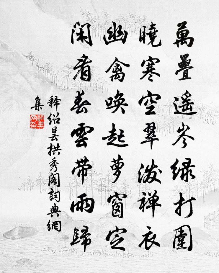 詩詞名句歷史字典書法欣賞書法字典國語詞典說文解字康熙字典古漢語字典標 題 作 者 詩 句 拱秀閣作者:釋紹曇 朝代:宋代拱秀閣原文萬疊遙岑綠打圍,曉寒空翠潑禪衣。幽禽喚起蘿窗定,閒看春雲帶雨歸。詩詞問答問:拱秀閣的作者是誰?答:釋紹曇問:拱秀閣寫於哪個朝代?答:宋代釋紹曇拱秀閣書法欣賞拱秀閣書法作品詩詞推薦句程敦厚〔宋代〕一色鮮猩血。入湧泉道中程師孟〔宋代〕寒林已見早梅芳,盡日臨流野與長。門外牛羊人自得,籬邊雞犬盜誰防。三江夜色滄浪白,千里秋香{禾巴}稏黃逍遙詠宋太宗〔宋代〕夢寐其中物,常人何得知。陰寒三數變,陽暖兩相宜。宿世終皆有,無緣勿強為。真鉛歸至道,龍虎笑華池。好事近程垓〔宋代〕煙盡戍樓空,又是一簾佳月。何事山城留滯,負好花時節。燒燈翦彩沒心情,應有翠娥說。欲借好風吹恨,奈亂雲病思陸游〔宋代〕窗扉寂寂秋將晚,燈火昏昏夜向闌。不是暮年能耐病,道人心地本來寬。趨向邵雍〔宋代〕舍我靈龜,親我朵頤。背義從利,我無遠思。賁於丘園,束帛戔戔。既能圖大,小在其間。從和山聰上人覓竹艾性夫〔宋代〕龍光長老有大竹,肯為東坡斫兩竿。可是孟郊家具少,請師分我碧琅玕。應王中丞思遠詠月詩沈約〔南北朝〕月華臨靜夜。夜靜滅氛埃。方暉竟戶入。圓影隙中來。高樓切思婦。西園游上才。網軒映珠綴。應門別錄苔。洞房題逸樂子卷楊維楨〔元代〕煙水風塵外,先生一草堂。乾時無戰策,卻老有丹方。蒲方抄書短,松花釀酒日。有時歌欸乃,小艇在滄浪。孫威敏及物帖贊岳珂〔宋代〕有文事,有武備,公之筆札蔚然可占也。兵兇器,戰危事,公之此事非直一謙也。以公之才,持必勝之策,而於雇對雪釋智圓〔宋代〕冷結平湖絕棹過,紛紛盈目趣如何。侯門歌舞看難足,編戶饑寒心厭多。旋滿閒庭夸玉砌,重欹幽樹斗瓊柯。夜來舍北望水鄉風物戲作絕句陸游〔宋代〕西風沙際矯輕鷗,落日橋邊系釣舟。乞與畫工團扇本,青林紅樹一川秋。哀輓詩盧多遜〔宋代〕軍門半掩槐花宅,每過猶聞器臨聲。漸窮老僕慵看馬,著慘佳人懶按箏。詩侶酒徒消散盡,一場春夢越王城。秋獲後即事陸游〔宋代〕秋獲春耕力尚余,雨中襏襫種寒蔬。築居正可茨生草,出市何妨借蹇驢。老境朝晡數匙飯,腐儒生死一編書。敲門挽某氏胡寅〔宋代〕慈祥令淑稟於天,宗族閨門共仰賢。中饋克修惟六二,義方能教亦三遷。藝萱無復忘憂日,種柏行看合抱年。舊欲約山中友仇遠〔宋代〕望極秋空無片雲,前山歷歷見遙岑。新鴻漸到邊城靜,舊雨不來汀草深。仙李有時曾入夢,伯桃死後少知心。如君連日順風晁補之〔宋代〕昔日肩吾上國行,魚龍黑浪自堪驚。我今憔悴西風穩,卻是江神不世情。檄雪葛起耕〔宋代〕銀闕書飛急羽忙,料應滕六奏虛皇。要將閬苑蓬壺水,幻作瓊林玉樹芳。風約雲邊停鶴馭,冰清月際舞霓裳。鳳簫泊秋江貫休〔唐代〕岸如洞庭山似剡,船漾清溪涼勝簟。月白風高不得眠,枯葦叢邊釣師魘。飛雪未已可謂佳端約判簿判務二丈同登尊經閣杜范〔宋代〕萬頃瓊瑤爛不收,從今便合慶來牟。與君莫負登臨約,不是偷閒作浪遊。名句推薦世人結交須黃金,黃金不多交不深。張謂《題長安壁主人》 斷香殘酒情懷惡。西風催襯梧桐落。李清照《憶秦娥·詠桐》 憑誰問,廉頗老矣,尚能飯否?辛棄疾《永遇樂·京口北固亭懷古》 觀其交遊,則其賢不肖可察也管仲《管子·權修》 人間四月芳菲盡,山寺桃花始盛開。白居易《大林寺桃花》 今日雲景好,水綠秋山明。李白《九日》 梅花南北路,風雨濕征衣。文天祥《南安軍》 春風又綠江南岸,明月何時照我還?王安石《泊船瓜洲》 良醫之門多病人。荀子《荀子·法行》 香爐瀑布遙相望,回崖沓嶂凌蒼蒼。李白《廬山謠寄盧侍御虛舟》