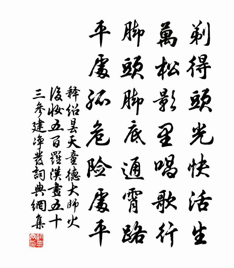 詩詞名句歷史字典書法欣賞書法字典國語詞典說文解字康熙字典古漢語字典標 題 作 者 詩 句 天童德大師火後妝五百羅漢畫五十三參建淨髮作者:釋紹曇 朝代:宋代原文剃得頭光快活生,萬松影里唱歌行。腳頭腳底通霄路,平處孤危險處平。詩詞問答問:《天童德大師火後妝五百羅漢畫五十三參建淨髮》的作者是誰?答:釋紹曇問:該詩寫於哪個朝代?答:宋代書法欣賞天童德大師火後妝五百羅漢畫五十三參建淨髮書法作品詩文賞析【原題】:天童德大師火後妝五百羅漢畫五十三參建淨髮庫砌松行求紀其實二偈贈之詩詞推薦夏日游暉上人房陳子昂〔唐代〕山水開精舍。琴歌列梵筵。人疑白樓賞。地似竹林禪。對戶池光亂。交軒岩翠連。色空今已寂。乘月弄澄泉。和閻士和望池月答人皎然〔唐代〕片月忽臨池,雙蛾憶畫時。光浮空似粉,影散不成眉。孤枕應驚夢,寒林正入帷。情知兩處望,莫怨獨相思。和張文裕安寒十首司馬光〔宋代〕何處初寒好,初寒疊石灘。山斜改昏曉,路曲失東西。拾栗走村稚,鑒垣巢乳雞。我來閒擁褐,曝背草檐低。次韻鄭僉判方岳〔宋代〕十畝山園賦遂初,左花右竹了無餘。擇陰老我自麋鹿,甘帶何人不蝍蛆。佛社獨容陶令醉,帝城難作子公書。行山送彥立兄游太學以恩袍草色動為韻王之道〔宋代〕梅花破朝寒,似欲壯行色。駸駸小驪駒,回首便數驛。一鶚在雲路,鷙鳥空累百。從令馬賓王,不是新豐客。代浦城權縣趙節推鹿鳴宴詩陳著〔宋代〕潛藩歲貢素多才,捷報歡聲沸似雷。南浦士流新姓字,西山夫子舊胚胎。登榮仙籍香浮桂,得意春魁信在梅。此去喜晴劉長卿〔唐代〕曉日西風轉,秋天萬里明。湖天一種色,林鳥百般聲。霽景浮雲滿,遊絲映水輕。今朝江上客,凡慰幾人情。第一導引洪适〔宋代〕重華天子,長至奉神虞。九奏會軒朱。星暉雲潤東方曉,拜貺竹宮初。歸來千乘護皇輿。瑞景集金鋪。雞竿高唱恩夷狄之孝十首百濟王扶餘義慈林同〔宋代〕夷方雖爾異,天性本然同。自昔聞曾子,如今在海東。游石通洞衛石卿〔宋代〕空嵌兩洞石相通,翠篠娟娟碧霧籠。手扶青藜訪奇古,岩洞妙墨識涪翁。海昌望月陳陶〔唐代〕何處無今夕,豈期在海頭。賈客不愛月,嬋娟閒滄洲。浩然傷歲華,獨望湖邊樓。煙島青歷歷,藍田白悠悠。誰無月下聞笛楊萬里〔宋代〕天色熔成水,蟾光鏈出銀。碧香三酌半,玉笛一聲新。小婉還清壯,多歡忽苦辛。何人傳此曲,此曲怨何人。奉和聖制中和節賜百官宴集因示所懷權德輿〔唐代〕萬方慶嘉節,宴喜皇澤均。曉開蓂葉初,景麗星鳥春。藻思貞百度,著明並三辰。物情舒在陽,時令弘至仁。衢酒送晦庵南歸尤袤〔宋代〕二年摩手撫瘡痍,恩與廬山五老齊。合侍玉皇香案側,卻持華節大江西。鼎新白鹿諸生學,築就長虹萬丈堤。待哺句陳傅良〔宋代〕半妝宮面迎風笑,間色仙衣帶露收。進之復有湘潭之役二詩見惜別意趙蕃〔宋代〕君詩悟入已多年,信手拈來總自然。靜似幽人居在谷,勇如壯士起臨邊。波瀾收卷雖餘地,光艷發舒終屬天。笑我送外兄方卿公美赴廣東憲十絕黃公度〔宋代〕遐陬赤子困侵牟,跳弄潢池今幾秋。從此聲威憺強梗,自然戈戟變鋤耰。仙人篇曹植〔魏晉〕仙人攬六箸,對博太山隅。湘娥拊琴瑟,秦女吹笙竽。玉樽盈桂酒,河伯獻神魚。四海一何局,九州安所如。韓終明月棹孤舟 海淀納蘭性德〔清代〕一片亭亭空凝佇。趁西風霓裳偏舞。白鳥驚飛,菰蒲葉亂,斷續浣紗人語。丹碧駁殘秋夜雨。風吹去采菱越女。轆淳熙戊戌將命廣東侍親攜孥十一月至安仁留蔡戡〔宋代〕憶昨南遊日,今餘二十年。扶輿潘母健,舉案孟光賢。遠宦徒勞耳,重來倍愴然。若非吾小阮,隻影更誰憐。名句推薦長因送人處,憶得別家時張籍《薊北旅思/送遠人》 長安白日照春空,綠楊結煙垂裊風。李白《陽春歌》 黃昏庭院柳啼鴉,記得那人,和月折梨花。陳亮《虞美人·東風盪颺輕雲縷》 傷心闊別三千里,屈指思量四五年。韓偓《寒食日重遊李氏園亭有懷》 又是重陽近也,幾處處,砧杵聲催。秦觀《滿庭芳·碧水驚秋》 清秋幕府井梧寒,獨宿江城蠟炬殘。杜甫《宿府》 棹動芙蓉落,船移白鷺飛。蕭綱《採蓮曲》 天涯也有江南信。梅破知春近。黃庭堅《虞美人·宜州見梅作》 野客預知農事好,三冬瑞雪未全消。戴復古《除夜》 染柳煙濃,吹梅笛怨,春意知幾許。李清照《永遇樂·落日熔金》