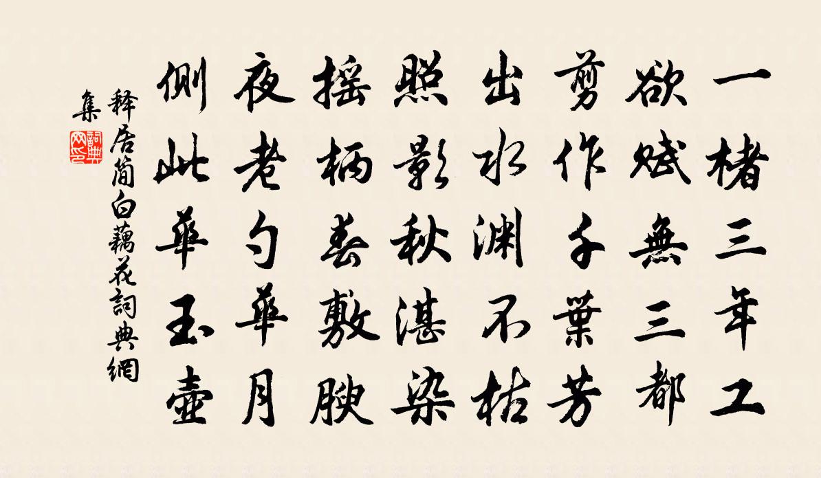詩詞名句歷史字典書法欣賞書法字典國語詞典說文解字康熙字典古漢語字典標 題 作 者 詩 句 白藕花作者:釋居簡 朝代:宋代白藕花原文一楮三年工,欲賦無三都。剪作千葉芳,出水淵不枯。照影秋湛染,搖柄春敷腴。夜老勺華月,側此華玉壺。詩詞問答問:白藕花的作者是誰?答:釋居簡問:白藕花寫於哪個朝代?答:宋代釋居簡白藕花書法欣賞白藕花書法作品詩詞推薦石仙觀陳宗禮〔宋代〕千丈飛崖倚半空,火雲時節此清風。身閒一日俱仙思,何用藏形古木中。春歸五首 其四朱淑真〔宋代〕一點芳心冷若灰,寂無夢想惹塵埃。東君總領鶯花去,浪蝶狂蜂不自來。嘉定改元久旱得雨詩呈張令君楊簡〔宋代〕兩日長憂積滿中,感深令禱格天工。欣欣處處人人喜,渺渺茫茫畝畝同。不至傷如無極雅,行當改賦黍離風。邑民菩薩蠻林淳〔宋代〕鵝溪淨稱煙籠月。澄心白稱光浮雪。淨白兩俱宜。天然濃淡枝。花光神意遠。吮墨含毫淺。依約有香來。春風隨手人日出遊湖上十首楊萬里〔宋代〕上竺雪來時,四山都作凍。團團玉屏風,圍繞渾無縫。賜馬廷鸞四首宋理宗〔宋代〕聖烈謨肇我加邦,鉅編詔後總宏綱。立心廣大侔天地,行事明通邁帝王。訓與六經相表裹,法垂萬世愈巍煌。講帷道上口占毛滂〔宋代〕屹屹高山自兩邊,紛紛雞鴨苦當前。敗垣過竹還當道,脫葉憑風欲半天。定恐黃茅藏伏兔,更呼青漢落飛鸇。一寒賦園中所有十首蘇轍〔宋代〕蘆生井欄上,蕭騷大如竹。移來種堂下,何爾短侷促。莖青甲未解,枯葉已可束。蘆根愛溪水,余潤長鮮綠。強移滿江紅(辛酉生朝)姜特立〔宋代〕小小華堂,朱闌外、亂山如簇。更雲中仙掌,一峰高矗。南極老人呈瑞處,丙丁躔次光相燭。又誰知、堂上有閒人留黃思忠李流謙〔宋代〕可人面如君不易面致,惠然面而來此天面意。往往文字雜嘯歌,兒輩倚牆吾敢訶。向來邂逅無此款,曲水風流嗟未次韻劉文饒題絕塵亭郭印〔宋代〕江白風情古寺虛,客來蕭散與何殊。水涵疏樹千尋淨,塵到幽亭一點無。天際昏煙迷小艇,林端落日射浮圖。欲添答鄭虞任檢法見贈陸游〔宋代〕臥龍山前秋雨晴,鄭子過我如夙昔。照人眉宇寒巉巉,懸知筆有千鈞力。鏡湖歲暮霜葉空,乃聞載酒同諸公。歸來夏夜陸游〔宋代〕六尺筇枝膝上橫,中庭岸幘聽鼉更。露零金掌漢宮曉,月度銀河秦塞明。菡萏晚花香未減,梧桐病葉墮無聲。關河吉祥寺賞牡丹蘇軾〔宋代〕人老簪花不自羞,花應羞上老人頭。醉歸扶路人應笑,十里珠簾半上鉤。讀王伯大都承奏疏王邁〔宋代〕去非前日在端平,我以為兄不敢名,若使去非觀此疏,須饒幼學作難兄。采葛佚名〔先秦〕彼采葛兮,一日不見,如三月兮!彼采蕭兮,一日不見,如三秋兮!彼采艾兮!一日不見,如三歲兮!贈月洞先生葉碧峰〔宋代〕跳出塵關百念輕,大元羽士宋儒生。易參羲聖通玄妙,詩比唐人並駕行。咒水灑時天地淨,符文書處鬼神驚。洞中寄題江渙長官南園茅齋蘇轍〔宋代〕白髮章勤困小邦,塵勞坐使壯心降。河陽罷後成南圃,彭澤歸來臥北窗。畦畔草生親荷鍤,床頭酒熟自傾缸。因君河南府試十二月樂詞·二月李賀〔唐代〕二月飲酒採桑津,宜男草生蘭笑人,蒲如交劍風如薰。勞勞胡燕怨酣春,薇帳逗煙生綠塵。金翹峨髻愁暮雲,沓颯朝中措葛郯〔宋代〕雙鞬錦領出西山。戎幕護旌旗。橫槊春風百詠,臨淮夜月千卮。風流樽俎,瓊花破艷,紅藥攢枝。賞盡竹西歌吹,名句推薦高峰入雲,清流見底陶弘景《答謝中書書》 城雪初消薺菜生,角門深巷少人行。楊載《到京師》 不修身而求個名於世者,猶貌甚惡而責妍影於鏡也。顏之推《顏氏家訓·名實篇》 賤妾煢煢守空房,憂來思君不敢忘,不覺淚下沾衣裳。曹丕《燕歌行》 重重疊疊上瑤台,幾度呼童掃不開。蘇軾《花影》 落花夜雨辭寒食。塵香明日城南陌。吳文英《菩薩蠻·落花夜雨辭寒食》 莫失莫忘,仙壽恆昌。曹雪芹《紅樓夢·第八回》 夕陽閒淡秋光老,離思滿蘅皋柳永《少年游·參差煙樹灞陵橋》 盡做舊愁都忘卻,新愁何處著王庭筠《謁金門·雙喜鵲》 菊暗荷枯一夜霜。新苞綠葉照林光。蘇軾《浣溪沙·詠橘》