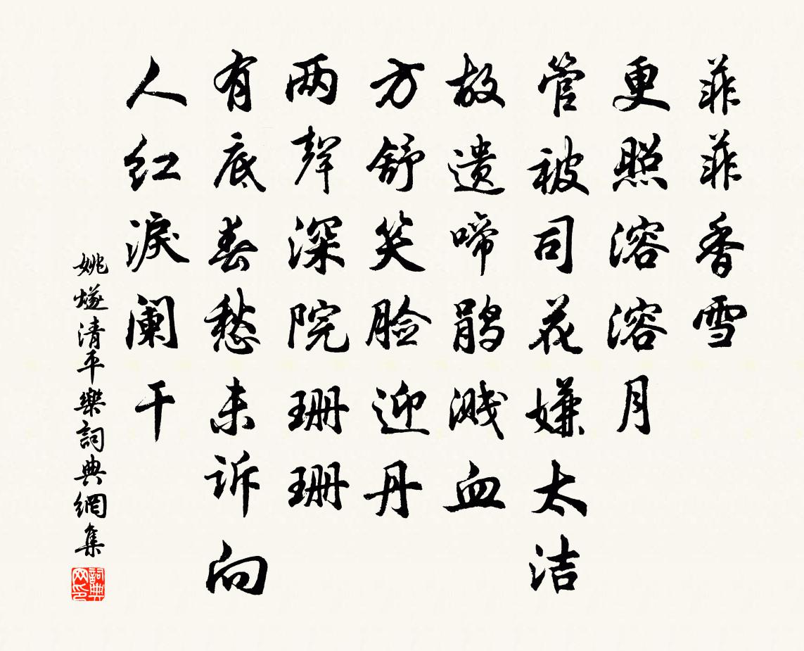 詩詞名句歷史字典書法欣賞書法字典國語詞典說文解字康熙字典古漢語字典標 題 作 者 詩 句 清平樂作者:姚燧 朝代:元代清平樂原文菲菲香雪。更照溶溶月。管被司花嫌太潔。故遺啼鵑濺血。方舒笑臉迎丹。兩聲深院珊珊。有底春愁未訴,向人紅淚闌乾。詩詞問答問:清平樂的作者是誰?答:姚燧問:清平樂寫於哪個朝代?答:元代問:清平樂是什麼體裁?答:詞姚燧清平樂書法欣賞清平樂書法作品詩詞推薦與潭州智度寺慧覺詩呂岩〔唐代〕達者推心兼濟物,聖賢傳法不離真。請師開說西來意,七祖如今未有人。迎詔書陸游〔宋代〕憶瞻鑾仗省門前,扇影鞭聲下九天。寂寞嘉州迎詔處,忽聞鼓吹卻悽然。正樂府十篇貪官怨皮日休〔唐代〕國家省闥吏,賞之皆與位。素來不知書,豈能精吏理。大者或宰邑,小者皆尉史。愚者若混沌,毒者如雄虺。傷哉雨杜甫〔唐代〕行雲遞崇高,飛雨靄而至。潺潺石間溜,汩汩松上駛。亢陽乘秋熱,百穀皆已棄。皇天德澤降,焦卷有生意。前雨和晚菊三首廖行之〔宋代〕何事秋光老更清,故應有菊占秋榮。後來漢陛知薪積,晚出商山嘆翼成。三徑惟將松比操,東籬那為酒含英。紛紛共工怒觸不周山佚名〔〕昔者,共工與顓頊爭為帝,怒而觸不周之山,天柱折,地維絕。天傾西北,故日月星辰移焉;地不滿東南,故水潦次子蒼寄余清老韻吳則禮〔宋代〕從來三仕及三已,總落道人坐定里。滑稽社中黃髮將,詎與阿朔論輩行。平生芋魁曾未錯,粱肉寧殊腐腸藥。百年養法十二條賈似道〔宋代〕餵食還須只一件,莫信傍人教你換。雞荳菱肉盡非宜,不及朝朝黃米飯。上太師公相生辰詩十首佚名〔宋代〕談笑能令國勢強,一時忠閏凜秋霜。挽回騩馭遠長樂,直把鴻動紀太常。間寐東朝宮殿曉,來庭北使塞垣長。輔成簡同志溫庭筠〔唐代〕開濟由來變盛衰,五車才得號鎡基。留侯功業何容易,一卷兵書作帝師。樹柳宋祁〔宋代〕為愛當年濯濯姿,動春搖霧不勝垂。條供越絕千絲綱,葉斗章台半額眉。肯共桑榆悲日晚,寧同枳橘過江移。待君甲子語溪閔雨四首黃榦〔宋代〕檣頭五兩搖空飛,船頭百丈牽何遲。數篙塘水清可涉,故鄉千里歸何時。頌一百則釋重顯〔宋代〕公案圓來問趙州,長安城裡任閒遊。草鞋頭戴無人會,歸到家山便即休。楊貴妃金朋說〔宋代〕傾國嬌容啟色荒,能移帝主墮三綱。荔枝嚬笑雖甘美,馬踐嵬坡促命亡。再題南澗樓王安石〔宋代〕北山雲漠漠,南澗水悠悠。去此非吾願,臨分更上樓。慈雲四景甘露泉蘇軾〔宋代〕階下有龍潭,一泓寒且碧。不須撫兩掌,流出仙人液。詠天寧院呂夷簡〔宋代〕飄然吟魄到鰲山,好句空疏水石間。眼界清虛心不息,浮生能有幾人間。送許棠先輩之官涇縣鄭谷〔唐代〕白頭新作尉,縣在故山中。高第能卑宦,前賢尚此風。蕪湖春蕩漾,梅雨晝溟濛。佐理人安後,篇章莫廢功。從仕韓愈〔唐代〕居閒食不足,從仕力難任。兩事皆害性,一生恆苦心。黃昏歸私室,惆悵起嘆音。棄置人間世,古來非獨今。石上藤(得上字)岑參〔唐代〕石上生孤藤,弱蔓依石長。不逢高枝引,未得凌空上。何處堪託身,為君長萬丈。第一百九十九卷名句推薦暗暗淡淡紫,融融冶冶黃。李商隱《菊花》 霸業成空,遺恨無窮。查德卿《蟾宮曲·懷古》 聽於無聲,視於無形。戴聖《禮記·曲禮上》 悠悠洛陽道,此會在何年。陳子昂《春夜別友人二首·其一》 燕雀安知鴻鵠之志。司馬遷《史記·陳涉世家》 低花樹映小妝樓,春入眉心兩點愁。白居易《春詞》 奈何今之人,雙目送飛鴻。李白《鞠歌行》 莫唱當年長恨歌,人間亦自有銀河。袁枚《馬嵬》 君為女蘿草,妾作菟絲花。李白《古意》 窗白一聲雞,枕函聞馬嘶。顧貞觀《菩薩蠻·山城夜半催金柝》