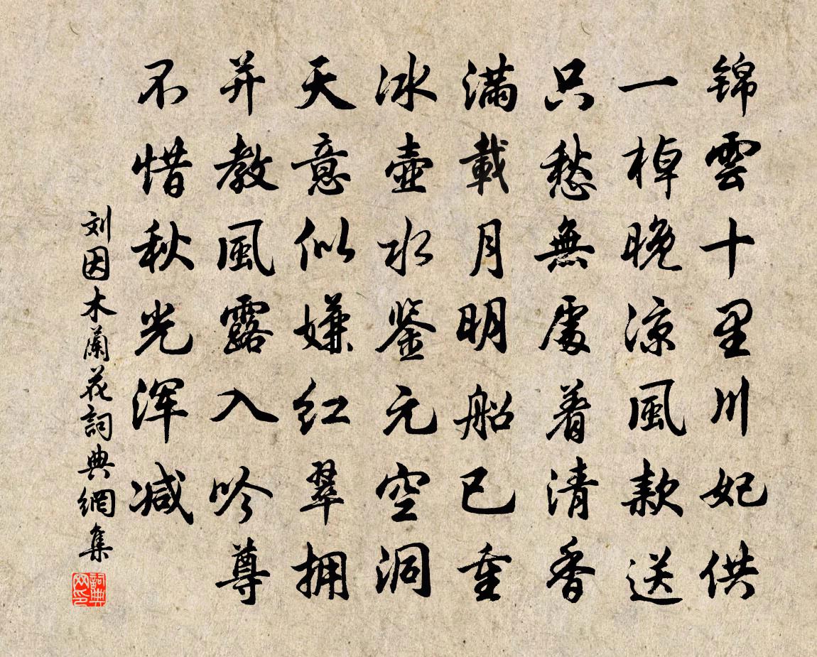 詩詞名句歷史字典書法欣賞書法字典國語詞典說文解字康熙字典古漢語字典標 題 作 者 詩 句 木蘭花作者:劉因 朝代:元代木蘭花原文錦雲十里川妃供。一棹晚涼風款送。只愁無處著清香,滿載月明船已重。冰壺水鑒元空洞。天意似嫌紅翠擁。並教風露入吟尊,不惜秋光渾減詩詞問答問:木蘭花的作者是誰?答:劉因問:木蘭花寫於哪個朝代?答:元代問:木蘭花是什麼體裁?答:詞劉因木蘭花書法欣賞木蘭花書法作品詩詞推薦授時曆以丁未為一歲仇遠〔宋代〕仇山村叟始生辰,六袠平頭又見春。檢歷今年交一歲,乘槎有日到三神。文章翰墨聊從好,富貴功名莫認真。且醉邵公濟求泰定山房十詩松門蘇籀〔宋代〕晝扃熟鹿守,晨啟素鴉馴。延陵掛孤劍,吳月照峩岷。燕城讀史羅公升〔宋代〕隋唐晉漢本胡種,自入中國皆衣冠。不知耶律稱皇帝,何似文皇號可汗。華亭百詠沙岡許尚〔宋代〕千里平沙地,聯通江海湄。謾傳因激浪,疑是蚌成基。十五日雪三首梅堯臣〔宋代〕新雷奮蛇甲,密雪斗鵝毛。正欲裁輕縠,重令著弊袍。沙泉流復凍,煙萼坼還韜。只待鄰醅熟,微聲聽酒槽。送友人游梅湖李白〔唐代〕送君游梅湖,應見梅花發。有使寄我來,無令紅芳歇。暫行新林浦,定醉金陵月。莫惜一雁書,音塵坐胡越。宋頌九首聖文石介〔宋代〕聖文安安,聖武桓桓。朝貢萬里,正朔百蠻。無吳之險,無蜀之艱。無潭之嚚,無荊之頑。溪上作陸游〔宋代〕傴僂溪頭白髮翁,暮年心事一枝筇。山銜落日青橫野,鴉起平沙黑蔽空。天下可憂非一事,書生無地效孤忠。東山東牆夜合樹去秋為風雨所摧,今年花時,悵然有感白居易〔唐代〕碧荑紅縷今何在,風雨飄將去不回。惆悵去年牆下地,今春唯有薺花開。即事陸游〔宋代〕楸垂落索槐吐花,溪女採蓮童抱瓜。一年光景又將半,愈老愈知生有涯。嘲蛩葛紹體〔宋代〕浮沙籬落亂鳴蛩,永夜相尋客夢中。儘是秋風借餘力,聲聲卻似怨秋風。憶巢雲居黎廷瑞〔宋代〕棄家錦宮城,結屋廬山前。退鷁空悠悠,冥鴻自翩翩。吟章一傾蓋,見賞朱絲弦。及此再承晤,交情重 * 。冥賞少年游·參差煙樹灞陵橋柳永〔宋代〕參差煙樹灞陵橋,風物盡前朝。衰楊古柳,幾經攀折,憔悴楚宮腰。 夕陽閒淡秋光老,離思滿蘅皋。一曲陽關,招司馬實游夏圃邵雍〔宋代〕兩霽景自好,秋深天未寒。可能乘興否,夏圃上盤桓。明德皇太后輓歌詞五首楊億〔宋代〕太姒徽音盛,長秋命數崇。黃圖分丙殿,玄象應軒宮。紀注無窮美,聲詩內助功。雲陽復土後,陵柏自悲風。賦得路傍一株柳送邢校書赴延州使府李益〔唐代〕路傍一株柳,此路向延州。延州在何處,此路起悠悠。華嚴塔楊蟠〔宋代〕石下有靈骨,千年生玉芝。山神每藏護,不使世人知。飲酒 其六陶淵明〔魏晉〕行止千萬端,誰知非與是。是非苟相形,雷同共譽毀。三季多此事,達士似不爾。咄咄俗中愚,且當從黃綺。鳳棲梧(施司諫冬生日)林伯鎮〔宋代〕破臘星回春可數。天佑中興,岳降神生再。造膝一言曾寤主,翱翔歷遍清華路。蓋代功名知自許。倦把州麾,小向題李通判斷橋圖喻良能〔宋代〕橋上筍輿岌岌,橋下浪波沄沄。但覺往來無惱,不知觀者傷神。名句推薦沅有芷兮澧有蘭,思公子兮未敢言。屈原《九歌·湘夫人》 今我來思,雨雪載途。佚名《出車》 沉舟側畔千帆過,病樹前頭萬木春。劉禹錫《酬樂天揚州初逢席上見贈》 富貴本無根,盡從勤里得。馮夢龍《醒世恆言·卷三十五》 十五彩衣年,承歡慈母前。孟浩然《送張參明經舉兼向涇州覲省》 上不失天時,下不失地利,中得人和,而百事不廢。荀子《荀子·王霸》 雁起青天,數行書似舊藏處。吳文英《齊天樂·與馮深居登禹陵》 倒言反事以嘗所疑。韓非及後人《韓非子·內儲說上七術》 九日龍山飲,黃花笑逐臣。李白《九日龍山飲》 此情可待成追憶?只是當時已惘然。李商隱《錦瑟》