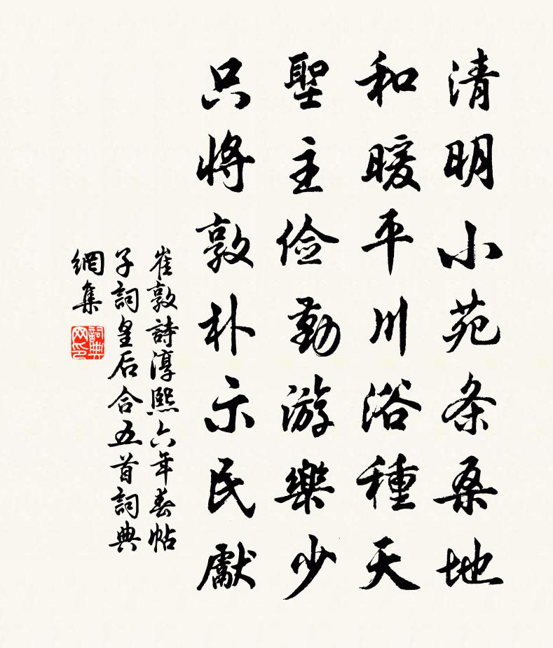 詩詞名句歷史字典書法欣賞書法字典國語詞典說文解字康熙字典古漢語字典標 題 作 者 詩 句 淳熙六年春帖子詞皇后合五首作者:崔敦詩 朝代:宋代原文清明小苑條桑地,和暖平川浴種天。聖主儉勤遊樂少,只將敦樸示民先。詩詞問答問:《淳熙六年春帖子詞皇后合五首》的作者是誰?答:崔敦詩問:該詩寫於哪個朝代?答:宋代書法欣賞淳熙六年春帖子詞皇后合五首書法作品詩詞推薦挽陳節使許月卿〔宋代〕凜凜如公一寸丹,荒城夜月徹清寒。向時尚已死諸葛,今日難貧老阿瞞。素志平生兆馬革,黎民一郡博彈冠。雙雞呂吉父使君生日陳師道〔宋代〕司漏凌晨報曉簽,曈曈赫日上重檐。良辰也應純乾策,吉夢先符太卜占。棣萼同時升紫禁,棠陰由此駐彤襜。一杯溪庵十首劉克莊〔宋代〕曾結絲絇侍玉旒,暮年身世寄滄洲。醜容詎得陪三閣,強項安能事五樓。何用渡蘆登彼岸,偶然斬草樂斯邱。牧童養家苦馬鈺〔元代〕養家苦,喜相違。常常思想死生危。怕從前,火院圍。修行好,處無為。神珠光彩透簾幃。現靈童,相貌威。天淨沙·秋白樸〔元代〕孤村落日殘霞,輕煙老樹寒鴉。一點飛鴻影下,青山綠水,白草紅葉黃花。雨中四首趙蕃〔宋代〕瀏瀏檐雨暮,蕭蕭窗竹秋。蚊雷宵罷響,螢火暗停流。政爾具絺綌,又當營褐裘。桑麻豈無地,卒歲負悠悠。出塞曲陸游〔宋代〕北風吹急雪,夜半埋氈廬。將軍八千騎,萬里逐單于。漢家如天臣萬邦,歡呼動地單于降。鈴聲南來金閃鑠,赦書十疊劉克莊〔宋代〕起來無賴晚風狂,便恐飄零損歲芳。飛燕不持身欲去,綠珠雖墜魄猶香。雨霰作雪不成大風散雲月色皎然陸游〔宋代〕數間茅屋寄蓬蒿,天遣來歸息我勞。月可一庭陳素練,風酣萬木起驚濤。病侵齒髮才雖盡,酒挾江山氣尚豪。安得奉和御製(一本有幸岳寺三字)吳融〔唐代〕岳寺清秋霽,宸游永日閒。霓旌森物外,鳳吹落人間。玉漱穿城水,屏開對闕山。皆知聖情悅,麗藻灑芳蘭。鷓鴣天(送客至湯泉)李洪〔宋代〕十月南閩未有霜。蕉林蔗圃郁相望。壓枝橄欖渾如畫,透甲香橙半弄黃。斟綠醑,泛滄浪。白沙翠竹近溫湯。分明題情深樹寄象公李白〔唐代〕腸斷枝上猿,淚添山下樽。白雲見我去,亦為我飛翻。送潘秀才之舒州皎然〔唐代〕楚水清風生,揚舲泛月行。荻洲寒露彩,雷岸曙潮聲。東道思才子,西人望客卿。從來金谷集,相繼有詩名。次韻安州冕行寄傳師秦觀〔宋代〕投暮安州北,蒼煙亂眼昏。茅茨人外路,砧杵月邊村。野水飛雲薄,空林噪雀繁。幾人堪此樂,逢客莫輕論。戲筆楊萬里〔宋代〕野菊荒苔各鑄錢,金黃銅綠兩爭妍;天公支予窮詩客,只買清愁不買田。無題二首秦觀〔宋代〕世事如浮雲,飄忽不相待。欻然化蒼狗,俄頃成章蓋。達觀聽兩行,昧者乃多態。舍旃勿重陳,百年等銷壞。悼妓詩京兆韋氏〔唐代〕惆悵金泥簇蝶裙,春來猶見伴行雲。不教布施剛留得,渾似初逢李少君。賞轉官球花酒邊分韻得剪字陳著〔宋代〕天機地軸隨時轉,萬物生生就裁剪。庭前一種可人花,獨殿春深交夏淺。團團自是渾沌胎,皎皎不事兒女婉。照見元旦陳師道〔宋代〕老境難為節,寒梢未得春。一官兼利害,百慮孰疏親。積雪無歸路,扶行有醉人。望鄉仍受歲,回首向松筠。西軒寓居陳與義〔宋代〕牢落西軒客,巡檐費獨吟。桃花明薄暮,燕子鬧微陰。辛苦元吾事,淹留更此心。小窗隨意寫,蛇蚓起相尋。名句推薦愛子心無盡,歸家喜及辰。蔣士銓《歲暮到家》 松間沙路淨無泥,瀟瀟暮雨子規啼。蘇軾《浣溪沙·游蘄水清泉寺》 清夜何湛湛,孤燭映蘭幕。江淹《銅爵妓》 害人之心不可有,防人之心不可無!佚名《增廣賢文·下集》 天與三台座,人當萬里城。張九齡《奉和聖制送尚書燕國公赴朔方》 孤飛一片雪,百里見秋毫。李白《觀放白鷹二首》 巧言令色,鮮矣仁。孔子弟子《論語·學而篇》 女為君子儒,無為小人儒。孔子弟子《論語·雍也篇》 筆落驚風雨,書成泣鬼神。馮夢龍《醒世恆言·卷二十一》 守真志滿,逐物意移。周興嗣《千字文·全文》