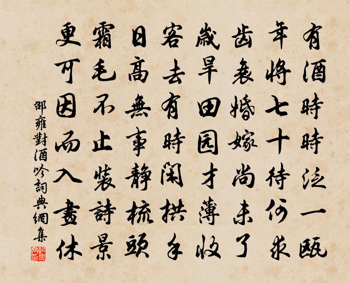 詩詞名句歷史字典書法欣賞書法字典國語詞典說文解字康熙字典古漢語字典標 題 作 者 詩 句 對酒吟作者:邵雍 朝代:宋代對酒吟原文有酒時時泛一甌,年將七十待何求。齒衰婚嫁尚未了,歲旱田園才薄收。客去有時閒拱手,日高無事靜梳頭。霜毛不止裝詩景,更可因而入畫休。詩詞問答問:對酒吟的作者是誰?答:邵雍問:對酒吟寫於哪個朝代?答:宋代邵雍對酒吟書法欣賞對酒吟書法作品詩詞推薦久雨裘萬頃〔宋代〕園林清樾淨無塵,池沼黃流去有聲。不用飛花來點綴,但須霽日為澄清。寄陳季常秦觀〔宋代〕一鉤五十犗,始具任公釣。揭竿趣灌瀆,與爾不同調。先生本西蜀,俠氣見英妙。哀憐世間兒,細黠似黃鷂。侍童九日廣陵同陳十五先輩登高懷林十二先輩歐陽詹〔唐代〕客路重陽日,登高寄上樓。風煙今令節,台閣古雄州。泛菊聊斟酒,持萸懶插頭。情人共惆悵,良久不同游。雜述林泳〔宋代〕文章不宜命達,帝王亦忌時名。謾說賦求司馬,曾聞詩殺道衡。君莫夸少年一首贈餘光遠戴表元〔宋代〕君莫夸少年,與我憊者疏。我亦嘗少年,少年君不如。談諧今已忘,猶有少年余。東南山水國,早得飛長裾。春園遠遊鄭谷〔唐代〕江湖猶足事,食宿戍鼙喧。久客秋風起,孤舟夜浪翻。鄉音離楚水,廟貌入湘源。岸闊鳧鷖小,林垂橘柚繁。津官挽張都諫文肅公郭磊卿〔宋代〕更從別駕立朝端,白簡風生憲府寒。宣室每前深夜席,木天時染秘書翰。琴思中散人何在,鶴返遼陽影已單。聖主劉村渡二首楊萬里〔宋代〕曠野風從腳底生,遠峰頂與額般平。何人知道誠齋叟?獨著駝裘破雨行。山居寄同志杜荀鶴〔唐代〕茅齋深僻絕輪蹄,門徑緣莎細接溪。垂釣石台依竹壘,待賓茶灶就岩泥。風生谷口猿相叫,月照松頭鶴並棲。不是碧玉歌李暇〔唐代〕碧玉上官妓,出入千花林。珠被玳瑁床,感郎情意深。侯元功問講學之意黃庭堅〔宋代〕金聲而玉振,從本用聖學。石師所未講,赤子有先覺。絲直則為弦,可射可以樂。竹筍不成蘆,白珪元抱璞。匏瓜詠竹檳榔盤詩沈約〔南北朝〕梢風有勁質。柔用道非一。平織方以文。穹成圓且密。薦羞雖百中國。所貴浮天實。幸承歡醑余。寧辭嘉宴畢。頌草堂老師付頂相贊後圓相釋慧空〔宋代〕六國朝閶闔,三山插杳冥。禪流相借問,冬後一陽生。懶庵方岳〔宋代〕坐兀忘書長,睡熟苦夜短。一衲六十年,肘見不渠管。華鯨撼林樾,飯香雲子碗。欠伸起臥堂,云何師不懶。和黃秀才鑒空閣蘇軾〔宋代〕明月本自明,無心孰為境。掛空如水鑒,寫此山河影。我觀大瀛海,巨浸與天永,九州居其間,無異蛇盤鏡。空水村居即事六言十首劉克莊〔宋代〕老蚌剖胎枯矣,雄雜斷尾棄之。刎頸交誰球汝,犁舌獄無出時。寄題披雲樓陳師道〔宋代〕使君高會答清秋,增飾披雲作勝游。九日再逢堪一笑,終朝百過更深憂。落霞孤鶩知才盡,疏雨微雲怯語遒。賓主綠陰亭鄧林〔宋代〕千山橫碧一溪清,白鳥飛邊落照明。吏散庭階無一事,綠陰亭上又詩成。題雪峰因大夢頂相李昴英〔宋代〕終朝咬菜根,那得許精神。自笑形為贅,從渠畫不真。閒雲留片影, * 化千身。大夢何時覺,痴人問木人。薌林五十詠聽水亭楊萬里〔宋代〕冷冷無弦箏,洶洶自鳴鼓。最是醉夢中,喚作松風雨。名句推薦寒笛對京口,故人在襄陽。劉昚虛《暮秋揚子江寄孟浩然》 女媧鍊石補天處,石破天驚逗秋雨。李賀《李憑箜篌引》 鮑魚蘭芷,不同篋而藏劉向《說苑·指武》 朝辭白帝彩雲間,千里江陵一日還。李白《早發白帝城 / 白帝下江陵》 荷笠帶斜陽,青山獨歸遠。劉長卿《送靈澈上人》 末路驚風雨,窮邊飽雪霜文天祥《除夜》 信人莫若信己,防人毋存幸念。來俊臣《羅織經·閱人卷第一》 黃葉仍風雨,青樓自管弦。李商隱《風雨》 無稽之言,不見之行,不聞之謀,君子慎之。荀子《荀子·正名》 燈前目力雖非昔,猶課蠅頭二萬言。陸游《讀書》