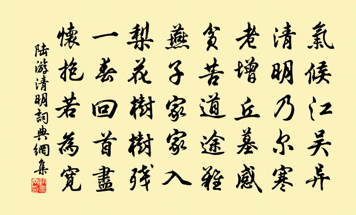 詩詞名句歷史字典書法欣賞書法字典國語詞典說文解字康熙字典古漢語字典標 題 作 者 詩 句 清明作者:陸游 朝代:宋代清明原文氣候江吳異,清明乃爾寒!老增丘墓感,貧苦道途難。燕子家家入,梨花樹樹殘。一春回首盡,懷抱若為寬?詩詞問答問:清明的作者是誰?答:陸游問:清明寫於哪個朝代?答:宋代問:陸游的名句有哪些?答:陸游名句大全陸游清明書法欣賞清明書法作品詩詞推薦桃源憶故人丘處機〔元代〕故人別後閒吟罷。寂寞雲溪瀟灑。百尺孤松影下。獨弄周天卦。清風皓月雖無價。妙手奇工難畫。欲向世間夸詫。同諸公奉侍祭岳瀆使大理盧幼平自會稽回經平望…不至皎然〔唐代〕望祀崇周典,皇華出漢庭。紫泥頒會計,玄酒薦芳馨。聖慮多虔肅,齋心合至靈。占祥刊史竹,筮日數堯蓂。禮秩丙子歲三月十有二日游嵩山宿峻極中院時天氣李廌〔宋代〕日背西嶺沒,月向東嶺生。殷霞未隱彩,皓露已舒明。斗柄坐可挹,政恐河漢傾。南樓夜杜牧〔唐代〕玉管金樽夜不休,如悲畫短惜年流。歌聲裊裊徹清夜,月色娟娟當翠樓。枕上暗驚垂釣夢,燈前偏起別家愁。思量木蘭花令·次歐公西湖韻蘇軾〔宋代〕霜余已失長淮闊。空聽潺潺清潁咽。佳人猶唱醉翁詞,四十三年如電抹。草頭秋露流珠滑。三五盈盈還二八。與余採桑子向子諲〔宋代〕人如濯濯春楊柳,徹骨風流。脫體溫柔。牽繫多情盡未休。最憐恰恰新眠起,雲雨初收。斜倚瓊樓。葉葉眉心一樣次韻黃簿陳造〔宋代〕揮毫麗句得旁觀,字字懸黎間木難。可但詩聲高海內,有人金換過三韓。和師厚栽竹黃庭堅〔宋代〕大隱在城市,此君真友生。根須辰日斸,筍要上番成。龍化葛陂去,鳳吹阿閣鳴。草荒三徑斷,歲晚見交情。煉丹砂王玠〔元代〕學佛*玩真空。要識玄中。虛靈不昧是根宗。無色聲香味觸法,赤骨身窮。應變利機鋒。三界圓通。木人石女笑春和梅龍圖公儀謝鷳歐陽修〔宋代〕有詩鶴勿喜,無詩鷳勿悲。人禽固異性,所趣各有宜。朝戲青竹林,暮棲高樹枝。咿呦山鹿鳴,格磔野鳥啼。聲音庭樹宋庠〔宋代〕岩曲孤根為底來,婆娑生意畫雲開。霜繁露重樛枝落,借問於今材不材。題東老庵史功舉〔宋代〕弁山凝翠碧橫天,霅水開鑒流清泉。隱君東老志高潔,一庵結在青山邊。平生倒屣愛佳客,買書不惜傾囊錢。秋負張先生蘇軾〔宋代〕孰視空堂竟不言,故應知我未天全。肯來傅舍人皆說,能致先生子亦賢。脫屣不妨眠糞屋,流澌爭看浴冰川。士廉朔風詩曹植〔魏晉〕弦歌盪思。誰與銷憂。臨川慕思。何為泛舟。豈無和樂。游非我鄰。誰忘泛舟。愧無榜人。吳元中少宰復官守長沙以詩賀之曾幾〔宋代〕眼看亂後幾凋年,神護靈光獨巋然。鏡里未添新白髮,囊中初得舊青氈。寄書地正當回雁,晤語身方走跕鳶。社稷山中留客張旭〔唐代〕山光物態弄春暉,莫為輕陰便擬歸。縱使晴明無雨色,入雲深處亦沾衣。謝林景思和韻樓鑰〔宋代〕黃昏門外六花飛,困倚胡床醉不知。凍合玉樓猶強項,擁衾方詠雪巢詩。李樹宋祁〔宋代〕曾見繁英出縹牆,更將朱實奉華堂。蹊桃得地偏相映,莫損清陰欲代僵。中秋月直禁苑鄭畋〔唐代〕禁署方懷忝,綸闈已再加。暫來西掖路,還整上清槎。恍惚歸丹地,深嚴宿絳霞。幽襟聊自適,閒弄紫薇花。用厚後弟強甫韻劉克莊〔宋代〕了無傑句似平庵,謾有高年企渭南。鐵漢堂堂才望八,銅人嘿嘿久緘三。曾傳鴻寶枕中訣,厭聽狙丘稷下談。畫史名句推薦露濕晴花春殿香,月明歌吹在昭陽。李益《宮怨》 興亡千古繁華夢,詩眼倦天涯。張可久《人月圓·山中書事》 冰雪襟懷,琉璃世界,夜氣清如許。黃升《酹江月·夜涼》 有美一人,清揚婉兮。佚名《野有蔓草》 故人書報,莫因循、忘卻蓴鱸。辛棄疾《漢宮春·會稽秋風亭觀雨》 為學不外靜敬二字,教人先去驕惰二字。王永彬《圍爐夜話·第一四八則》 眼裡無點灰塵,方可讀書千卷;胸中沒些渣滓,才能處世一番。陳繼儒《小窗幽記·集靈篇》 章台柳,章台柳,昔日青青今在否?韓翃《章台柳·寄柳氏》 一生大笑能幾回,斗酒相逢須醉倒。岑參《涼州館中與諸判官夜集》 禍之所由生也,生自纖纖也。荀子《荀子·大略》