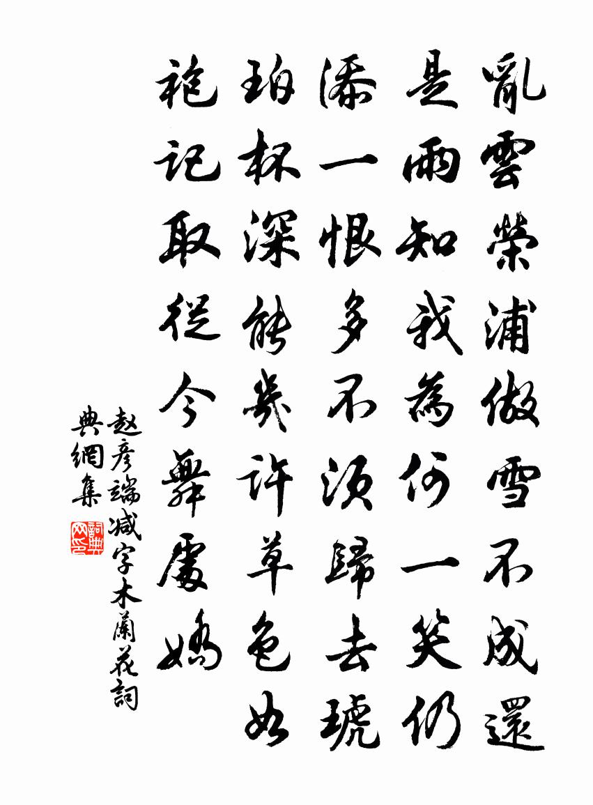 詩詞名句歷史字典書法欣賞書法字典國語詞典說文解字康熙字典古漢語字典標 題 作 者 詩 句 減字木蘭花作者:趙彥端 朝代:宋代減字木蘭花原文亂雲榮浦。做雪不成還是雨。知我為何。一笑仍添一恨多。不須歸去。琥珀杯深能幾許。草色如袍。記取從今舞處嬌。詩詞問答問:減字木蘭花的作者是誰?答:趙彥端問:減字木蘭花寫於哪個朝代?答:宋代趙彥端減字木蘭花書法欣賞減字木蘭花書法作品詩詞推薦和王衢見寄兼呈董行父魏野〔宋代〕棄繻東入武牢關,帝里經年豈是閒。鶂退暫知淹鳳藻,鵬殘即看上鰲山。討論想慰門人意,談笑應開翰長顏。唯我答毛叔子陳造〔宋代〕章甫不價越,澼洸或強吳。事以適進重,投暗恐類愚。毛子抱高學,眇睨大小儒。過閱幾公卿,攜文及吾廬。我窮送郊社朱兄除郎東歸王安石〔宋代〕手持官牒出神皋,迎客遙知賀酒醪。照映里門非白屋,欺凌春草有青袍。宦遊雖晚何妨久,餓顯從來不必高。孝友題樊侯廟二首黃庭堅〔宋代〕門掩虛堂陰窈窈,風搖枯竹冷蕭蕭。邱虛余意誰相問,豐沛英魂我欲招。野老無知惟卜歲,神巫何事苦 * 。人歸遊仙四首曹勛〔宋代〕嚴駕發滄浪,行樂從所之。方諸款青童,隱景朝郁儀。流金戒前導,玉節紛萎蕤。運策乘飛電,揚旌耀彩霓。斑龍沁園春(吳門懷古)陳人傑〔宋代〕草滿姑蘇,問訊夫差,今安在哉。望虎丘蒼莽,愁隨月上,蠡湖浩渺,興逐潮來。自古男兒,可人心事,惆悵要離踏沙行晏幾道〔宋代〕綠徑穿花,紅樓壓水,尋芳誤到蓬萊地。玉顏人是蕊珠仙,相逢展盡雙蛾翠。夢草閒眠,流觴淺醉,一春總見瀛洲寄謝三井山禱雨二首陳襄〔宋代〕曾禱神龍井,雲林杳莽間。苹蘩朝薦廟,風雨夜離山。百里田疇熟,一年囹圄間。因循失報謝,石險路難攀。題國清寺清音亭林憲〔宋代〕水從東塔來,卻打西澗過。八萬四千偈,為我細說破。送史溫虞部佐郡四明宋祁〔宋代〕外署清郎出佐州,嘲辭不畏上山頭。天中倦目迷雲闕,江上歸帆避石郵。佳設自隨賓早晏,還書寧畏渚沈浮。疁田春日雜詠九首李彌遜〔宋代〕憶昨金門侍,晨參玉佩聲。解纓青瑣闥,束載錦官城。日與長安遠,春隨上苑生。執鞭非所好,獨抱巒軒情。二十四夜夢到何許植物多瑞香覺而賦此艾性夫〔宋代〕春風吹我遊仙夢,夢到廬山頂上來。不記花多與花少,怳然如步紫雲回。子夜歌·三更月賀鑄〔宋代〕三更月。中庭恰照梨花雪。梨花雪。不勝淒斷,杜鵑啼血。王孫何許音塵絕。柔桑陌上吞聲別。吞聲別。隴頭流水行香子明本〔元代〕玉殿瓊樓。金鎖銀鉤。總不如、岩谷清幽。 * 紙帳,瓦缽磁甌。卻不知春,不知夏,不知秋。萬事俱休。名利都春暮詠懷寄集賢韋起居袞鄭谷〔唐代〕寂寂風簾信自垂,楊花筍籜正離披。長安一夜殘春雨,右省三年老拾遺。坐看群賢爭得路,退量孤分且吟詩。五湖華陽慰授代喜成二首程公許〔宋代〕唱第八年八,折腰三考書。上官容我拙,樸學與時疏。冷落隨陽雁,蹣跚上竹魚。平生經世志,窮達豈關渠。送樓佺提舉赴省陳著〔宋代〕綠髮方山冠,白玉氣色溫。高談霏木屑,不問能知文。去秋奪標歸,今步南宮雲。儒科青氈耳,指取氣欲吞。春風讀梅氏詩有感示徐生歐陽修〔宋代〕子美忽已死,聖俞舍吾南。嗟吾譬馳車,而失左右驂。勍敵嘗壓壘,羸兵當戒嚴。凡人貴勉強,惰逸易安恬。吾既讀中興碑 / 讀中興頌碑張耒〔宋代〕玉環妖血無人掃,漁陽馬厭長安草。潼關戰骨高于山,萬里君王蜀中老。金戈鐵馬從西從,郭公凜凜英雄才。舉旗上翰林李舍人朱慶餘〔唐代〕記得早年曾拜識,便憐孤進賞文章。免令汩沒慚時輩,與作聲名徹舉場。一自鳳池承密旨,今因世路接餘光。雲泥名句推薦城上春雲覆苑牆,江亭晚色靜年芳。杜甫《曲江對雨》 不見穿針婦,空懷故國樓。孟浩然《他鄉七夕》 綠兮絲兮,女所治兮。我思古人,俾無訧兮!佚名《綠衣》 能脫身牢籠外,便是大英雄。王永彬《圍爐夜話·第二八則》 明月幾時有?把酒問青天。蘇軾《水調歌頭·丙辰中秋》 桐花半畝,靜鎖一庭愁雨。周邦彥《瑣窗寒·寒食》 晚風庭院落梅初。淡雲來往月疏疏。李清照《浣溪沙·髻子傷春慵更梳》 田舍清明日,家家出火遲。王建《寒食》 海燕未來人鬥草,江梅已過柳生綿。李清照《浣溪沙·淡盪春光寒食天》 一身報國有萬死,雙鬢向人無再青。陸游《夜泊水村》