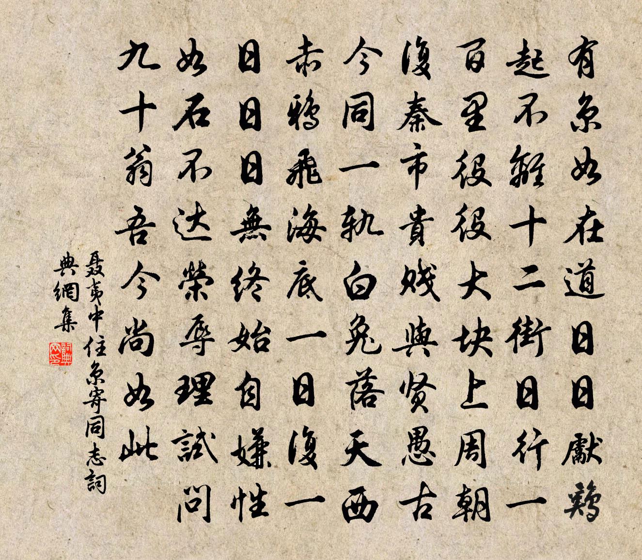 詩詞名句歷史字典書法欣賞書法字典國語詞典說文解字康熙字典古漢語字典標 題 作 者 詩 句 住京寄同志作者:聶夷中 朝代:唐代住京寄同志原文有京如在道,日日先雞起。不離十二街,日行一百里。役役大塊上,周朝復秦市。貴賤與賢愚,古今同一軌。白兔落天西,赤鴉飛海底。一日復一日,日日無終始。自嫌性如石,不達榮辱理。試問九十翁,吾今尚如此。詩詞問答問:住京寄同志的作者是誰?答:聶夷中問:住京寄同志寫於哪個朝代?答:唐代問:住京寄同志是什麼體裁?答:五古聶夷中住京寄同志書法欣賞住京寄同志書法作品注釋全唐詩:卷636-15詩詞推薦喜雨蘇轍〔宋代〕夏田已報七分熟,秋稼方憂十日乾。好雨徐來不倉卒,天公似欲救艱難。魃張鷹犬無遺力,社近雞豚趁早寒。老病予作歸鴈亭於滑州後十有五年梅公儀來守是邦歐陽修〔宋代〕風吹城頭秋草黃,仰見鳴鴈初南翔。秋草風吹春復綠,南鴈北飛聲肅肅。城下台邊桃李蹊,憶初披荒手植之。雪消送子龍赴吉州掾陸游〔宋代〕我老汝遠行,知汝非得已。駕言當送汝,揮涕不能止。人誰樂離別,坐貧至於此。汝行犯胥濤,次第過彭蠡。波橫和太常韋主簿五郎溫湯寓目之作王維〔唐代〕漢主離宮接露台,秦川一半夕陽開。青山儘是朱旗繞,碧澗翻從玉殿來。新豐樹里行人度,小苑城邊獵騎回。聞道送友人下第歸感懷李頻〔唐代〕帝里春無意,歸山對物華。即應來日去,九陌踏槐花。送三兄赴奏邸陸游〔宋代〕兄年十七弟始生,弟今白髮森千莖;所期相就畢此生,一尊濁酒得共傾。往年雖窮猶半菽,兩年糠核苦不足。書生山居十首方岳〔宋代〕我愛山居好,林梢一片晴,野煙禽誶語,春水柳閒情。蘚石隨行枕,藤花醒酒羹。吾詩不堪煮,亦足了吾生。至榕溪閣覽黃曾豐〔宋代〕元年留桂嶺,六月至榕溪。水木清相{左氵右砉},風煙暝欲淒。精廬千古蹟,樂石兩公題。造物生賢意,寧圖到送辛判官歐陽修〔宋代〕被薦方趨召,還鄉仍彩衣。看山向家近,上路逐鴻飛。結綬同為客,登高獨送歸。都門足行者,莫訝柳條稀。蝶戀花張掄〔宋代〕不假□□□□□。□□□□,□□□□□。□□□□□□□。□□□□□□□。□□□□□□□。□□□□,□□蜀州鄭史君寄鳥觜茶,因以贈答八韻薛能〔唐代〕鳥觜擷渾牙,精靈勝鏌鋣。烹嘗方帶酒,滋味更無茶。拒碾乾聲細,撐封利穎斜。銜蘆齊勁實,啄木聚菁華。鹽損漁家傲梵琦〔元代〕聽說娑婆無量苦。人皆染色貪尊俎。玉鏤笙簫金貼鼓。長鼓舞。梨園弟子邯鄲女。冬衣紫貂春白薴。涼亭暖閣消寒子野雪後寄和卻寄廷玉仇遠〔宋代〕平明跨馬晚方歸,偃仰行窩早見幾。餘子祗宜床下臥,詩人頓覺眼中稀。堂堂白璧埋黃壤,冉冉緇塵染素衣。得酒贈呂通秘丞王禹偁〔宋代〕聞君公事苦喧卑,紅粟堆邊獨歛眉。已入朝行翻掌庾,未如畿尉且吟詩。堰頭笑傲同張祜,市里優遊比路隨。唯有樂府鳥衣怨元好問〔金代〕繡佛長齋,半生枉伴 * 過。酒壚橫臥。一蹴虛空破。頗笑張顛,自謂無人和。還知么。醉鄉天大。少個神仙我。定風波 三鄉光武廟,懷故人劉公景玄元好問〔金代〕熊耳東原漢故宮。登臨猶記往年同。底事愛君詩句好。解道。河山浮動酒杯中。存沒悠悠三十載。誰會。白頭孤客和魯如晦七夕王之道〔宋代〕乞巧誰家綺席開,夜闌簫鼓趁虛催。啟明不為牽牛計,又放朝陽送曙來。徐仙白玉蟾〔宋代〕採樵有遇才三日,歸路還家已十年。自古得仙非苦節,此坑安得號黃蓮。庭梅詠張九齡〔唐代〕芳意何能早,孤榮亦自危。更憐花蒂弱,不受歲寒移。朝雪那相妒,陰風已屢吹。馨香雖尚爾,飄蕩復誰知。病起方翥〔宋代〕淡盪光風尋戶牖,迷濛宿霧淨園林。春深燕子來無數,雨後桃花落不禁。名句推薦便覺眼前生意滿,東風吹水綠參差。張栻《立春偶成》 秋來相顧尚飄蓬,未就丹砂愧葛洪。杜甫《贈李白》 酷憐嬌易散,燕子學偎紅。納蘭性德《臨江仙·絲雨如塵雲著水》 但怪得、當年夢緣能短。吳文英《三姝媚·過都城舊居有感》 被冷香消新夢覺,不許愁人不起李清照《念奴嬌·春情》 應傾謝女珠璣篋,盡寫檀郎錦繡篇。羅隱《七夕》 天下有道,卻走馬以糞。天下無道,戎馬生於郊。老子《老子·德經·第四十六章》 傷心枕上三更雨,點滴霖霪。李清照《添字醜奴兒·窗前誰種芭蕉樹》 兩株桃杏映籬斜,妝點商州副使家。王禹偁《春居雜興·兩株桃杏映籬斜》 為當時曾寫榴裙,傷心紅綃褪萼。吳文英《澡蘭香·林鐘羽淮安重午》