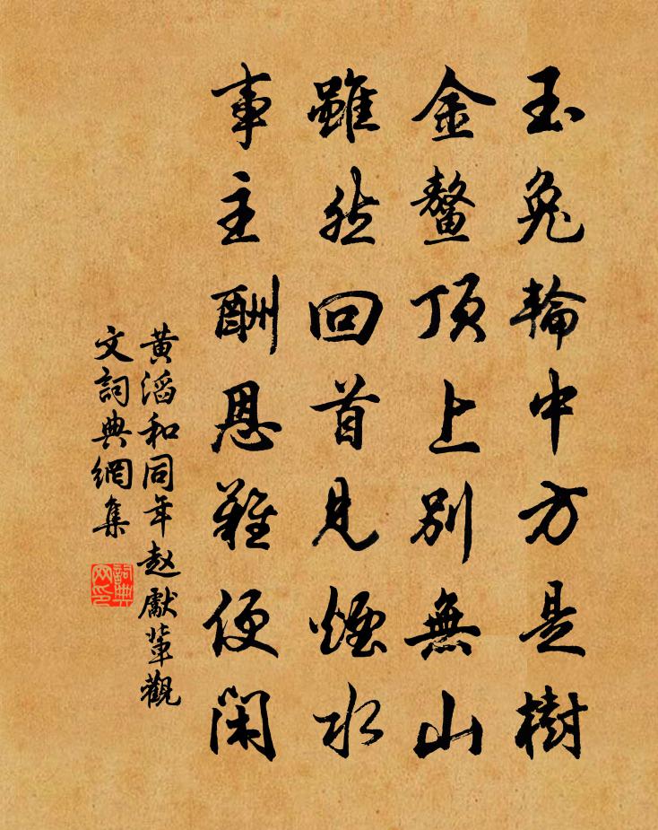 詩詞名句歷史字典書法欣賞書法字典國語詞典說文解字康熙字典古漢語字典標 題 作 者 詩 句 和同年趙先輩觀文作者:黃滔 朝代:唐代和同年趙先輩觀文原文玉兔輪中方是樹,金鰲頂上別無山。雖然回首見煙水,事主酬恩難便閒。詩詞問答問:和同年趙先輩觀文的作者是誰?答:黃滔問:和同年趙先輩觀文寫於哪個朝代?答:唐代問:和同年趙先輩觀文是什麼體裁?答:七絕黃滔和同年趙先輩觀文書法欣賞和同年趙先輩觀文書法作品注釋全唐詩:卷706-33詩詞推薦禪人並化主寫真求贊釋正覺〔宋代〕識浪瀝乾,肚皮束寬。口翻瀾而海闊,發垂雪而山寒。妙傳家法髑髏眼,巧幻神通赤肉團。相隨來也,搥鑿無瘢。昨晚又捧五章盡含六義意轉新而韻皆緊才益贍李至〔宋代〕吾宗偉量固難如,萬頃澄波更有餘。吟遍人寰四時景,讀窮仙館百王書。青山綠水牽情切,要路權門著意疏。只恐嚴子文用范至能韻見贈再和崔敦禮〔宋代〕燈花昨夜喜,詩成果符吉。長跪讀新詩,繡筵鳴寶瑟。天公怪多取,未老雪滿櫛。出門會臞仙,戴笠卓午日。我無江上劉子翬〔宋代〕江上潮來浪薄天,隔江寒樹晚生煙。北風三日無人渡,寂寞沙頭一族船。道愛堂孫夢觀〔宋代〕多幸廛居辱鎮臨,政平底用減科箴。昔聞偃室弦歌化,今見邦君撫字心。簾度荷香供永晝,水寒山影瀉清音。從來發臨川陸游〔宋代〕見客道傍店,添衣江上村。陂長風浩浩,山遠霧昏昏。虛日人聲合,凶年菜色繁。扶衰歸北闕,何以報君恩?與侯子云溪上晚步楊萬里〔宋代〕人入溪園自掩門,溪流新落兩三痕。杖藜紫菊霜風徑,送眼丹楓夕照村。行住忽然忘近遠,陰晴未肯定寒暄。多時盆池白蓮鄭剛中〔宋代〕芬陀利出盆池上,妙時薰我三生障。月明風細愈嚴淨,政恐下有威光藏。送八窗叔歸李曾伯〔宋代〕歸來百來付休休,又向空山斷送秋。整疊衣篝雙赤腳,攜持拄杖一蒼頭。儒書梵語相參看,酒柱詩盟自獻酬。客有白鹿寺劉克莊〔宋代〕歲晚霜林落葉稠,攜家來作鹿門游。偈言恍似前生說,詩稾猶煩侍者收。身上征衫拋未得,山中靈藥采無由。十年多麗(西湖)趙時奚〔宋代〕斂吳雲,翠奩推上紅晴。渺澄流、鱗光寒碎,遠峰螺紺低凝。杏香引、畫船影濕,柳陰趁、驕馬蹄輕。橋限寬平,飲酒四首秦觀〔宋代〕有客遠方來,酌我一杯茗。我醉方不啜,強啜忽復醒。既鑿渾沌氏,遂遠華胥境。操戈逐儒生,舉觴還酩酊。送杜景齊歸平陽二首方回〔宋代〕每憶東甌郡,柑花入夢香。市人無索服,田婦亦紅妝。鱟蟹豐漁戶,犀珠聚{左糹右集}商。年登猶足樂,何必殢題陳圖南鼾睡圖潘牥〔宋代〕甲馬營中紫氣高,屬豬人已著黃袍。此回天下地無事,可是山中睡得牢。夢宗氏子來兄舍寄生九月初七果生侄子陽伯高〔宋代〕昔年曾夢宗家郎,受生所自言其詳。髼忪有發重覆頂,夢裡恍然如發旁。大人占之兆惟吉,惟熊惟羆男之祥。今朝水龍吟 西湖懷古陳德武〔宋代〕東南第一名州,西湖自古多佳麗。臨堤台榭,畫船樓閣,遊人歌吹。十里荷花,三秋桂子,四山晴翠。使百年南渡句黃庚〔宋代〕颯颯片帆輕。心宇趙庚夫〔宋代〕心宇今無一點塵,面毛徑寸垢生鱗。齋時野雀臨薌幾,定裹山蜂立葛巾。欲喚羲黃談太古,自疑嵇阮即前身。兒童陳漕生辰代楊文作仲並〔宋代〕六管陽初復,前宵月尚圓。長庚俄夢李,崧岳故興宣。國使新恩數,忠臣夙眷偏。節龍開遠目,衣繡聳華年。日月杜鵑花成彥雄〔唐代〕杜鵑花與鳥,怨艷兩何賒。疑是口中血,滴成枝上花。一聲寒食夜,數朵野僧家。謝豹出不出,日遲遲又斜。名句推薦撥雲尋古道,倚石聽流泉。李白《尋雍尊師隱居》 廄馬散連山,軍容威絕域。李白《君子有所思行》 誠者自成也,而道自道也。子思《中庸·第二十五章》 一涓春水點黃昏,便沒頓、相思處。史達祖《留春令·詠梅花》 家住層城臨漢苑,心隨明月到胡天。皇甫冉《春思》 拱把之桐梓,人苟欲生之,皆知所以養之者。孟子《孟子·告子章句上·第十三節》 依舊桃花面,頻低柳葉眉。韋莊《女冠子·昨夜夜半》 靜女其孌,貽我彤管。佚名《靜女》 曉風不散愁千點,宿雨還添淚一痕。曹雪芹《詠白海棠》 一庭春色惱人來,滿地落花紅幾片。魏承班《玉樓春·寂寂畫堂樑上燕》