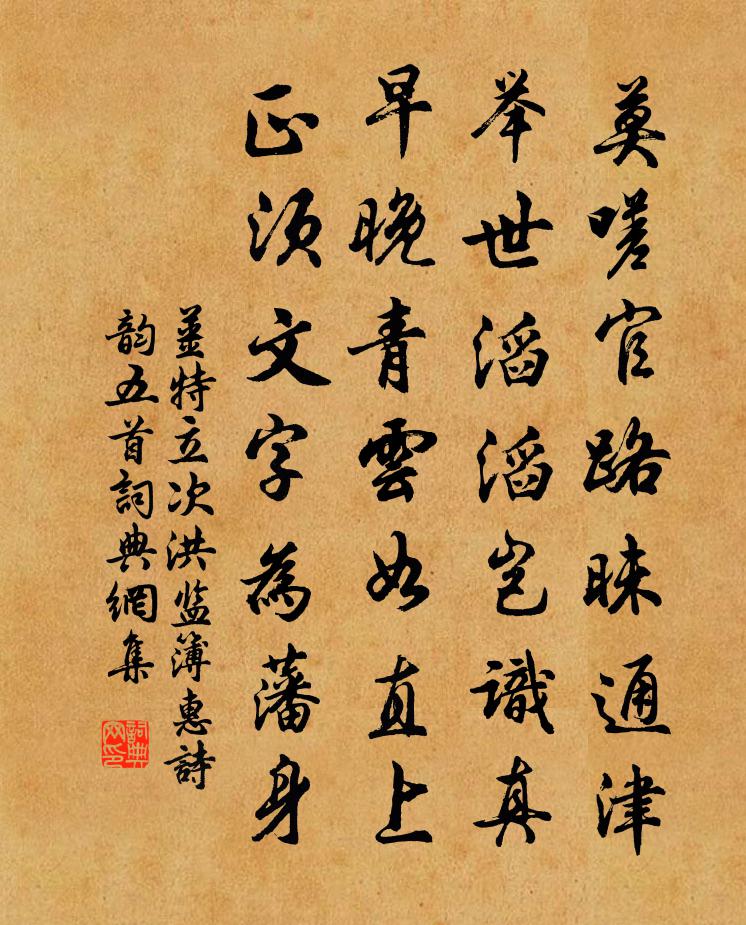 詩詞名句歷史字典書法欣賞書法字典國語詞典說文解字康熙字典古漢語字典標 題 作 者 詩 句 次洪監簿惠詩韻五首作者:姜特立 朝代:宋代次洪監簿惠詩韻五首原文莫嗟官路昧通津,舉世滔滔豈識真。早晚青雲如直上,正須文字為藩身。詩詞問答問:次洪監簿惠詩韻五首的作者是誰?答:姜特立問:次洪監簿惠詩韻五首寫於哪個朝代?答:宋代姜特立次洪監簿惠詩韻五首書法欣賞次洪監簿惠詩韻五首書法作品詩詞推薦次韻白水雪梅二詩劉子翬〔宋代〕閩雪少曾棲瓦白,怪來浩浩擁寒濱。嚴威故作敝裘厄,淡彩潛催幽幌晨。眼觀醉中迷有色,心華淨處照無垠。搖松奉和晦日幸昆明池應制宋之問〔唐代〕春豫靈池會,滄波帳殿開。舟凌石鯨度,槎拂鬥牛回。節晦蓂全落,春遲柳暗催。象溟看浴景,燒劫辨沉灰。鎬飲上十四吟十首劉克莊〔宋代〕黠兒蒙蔽聚群陰,豈料雲收杲日臨。壞證遺憂與宗社,捷書分喜到山林。擎天畢竟還高手,偃月從初謬用心。客自次韻答貴白戴表元〔宋代〕斗粟千錢不易酬,海風吹斷寄詩郵。誰家盛設蟹黃餅,有客翻披狐白裘。春樹自隨冬樹老,官河長挾野河流。隔生呂子山楊廷仲廷試歸晁公溯〔宋代〕布席三峨見,升堂二妙來,端須置尊酒,一為洗塵埃。翔雪吳江渡,薰風漢殿開。往還雖萬里,親得到蓬萊。飲後獻時相吳士矩〔唐代〕一夕心期一種歡,那知疏散負杯盤。尊前數片朝雲在,不許馮公子細看。西地錦佚名〔宋代〕不與群花相續。獨占春光速。幽香遠遠散西東,惟竹籬茅屋。羌管誰調一曲。送月夜、猶芬馥。憑君折取向玉堂,田舍即事十首劉克莊〔宋代〕淺甽何須浚,荒畦要糞除。何嘗舍耒出,亦或帶經鋤。古有神農學,今傳氾勝書。野儒曾涉獵,未可議空疏。憶幼子(字驥子,時隔絕在鄜州)杜甫〔唐代〕驥子春猶隔,鶯歌暖正繁。別離驚節換,聰慧與誰論。澗水空山道,柴門老樹村。憶渠愁只睡,炙背俯晴軒。湘江有感上王內翰釋行肇〔宋代〕達士弦性直,佞人膠辭柔。靳尚一言巧,靈均千古愁。孤蟾魄長在,寒雲恨難收。空使湘江水,至今無濁流。元日書懷王炎〔宋代〕年光除日又元日,心事今吾非故吾。兩板不須書鬱壘,一杯亦強飲屠蘿。添丁解事尋王母,內子傷時念老姑。欲報卜運算元杜安世〔宋代〕深院花鋪地。淡淡陰天氣。水榭風亭朱明景,又別是、愁情味。有情奈無計。漫惹成憔悴。欲把羅巾暗傳寄。細認句歐陽鈇〔宋代〕讀書豈為官。送入蕃使周繇〔唐代〕獵獵旗幡過大荒,敕書猶帶御煙香。滹沱河凍軍回探,邏逤孤城雁著行。遠寨風狂移帳幕,平沙日晚臥牛羊。早終冬至攝事南郊齋宮感懷作宋庠〔宋代〕履至謹冬祀,攝職叨上公。洗心奉明誡,祗宿城南宮。芳歲正遒莫,熙陽殊未融。西郊淡頹景,北牖來朔風。鶩野讀秦紀七絕劉克莊〔宋代〕怒發君山俄見赤,威驅海石亦遭鞭。儒生曰山東無盜,方士雲海中有仙。人情曾鞏〔宋代〕人情當面蔽山丘,誰可論心向白頭。天祿閣非真學士,玉麟符是假諸侯。詩書落落成孤論,耕釣依依憶舊遊。早晚宮詞張公庠〔宋代〕上林隨駕賞芳辰,曲賜黃封腊味醇。供帳不須勞幕士,垂揚為蓋草為茵。夜飲朱國寶家袁說友〔宋代〕又見仙潭二月春,一番官柳市橋新。重來莫訝星星發,樽酒相看只故人。再和韻上石塘吳王奕〔宋代〕人心六籍未嘗焚,千古師存道亦存。見說汶陽官路口,幾年鞍馬上君門。名句推薦寂寞柴門村落里,也教插柳記年華。趙元鎮《寒食書事》 冰肌玉骨,自清涼無汗。蘇軾《洞仙歌·冰肌玉骨》 一往情深深幾許?深山夕照深秋雨。納蘭性德《蝶戀花·出塞》 握手一長嘆,淚為生別滋蘇武《留別妻》 亂之所生也,則言語以為階。佚名《易傳·繫辭傳上·第八章》 奇文共欣賞,疑義相與析。陶淵明《移居二首》 之子歸窮泉,重壤永幽隔。潘安《悼亡詩三首》 立盡黃昏淚幾行,一片鴉啼月。夏完淳《卜運算元·秋色到空閨》 丹砂成黃金,騎龍飛上太清家,雲愁海思令人嗟。李白《飛龍引二首·其一》 見樂則淫侈,見憂則諍治,此人之道也。呂不韋《呂氏春秋·論·似順論》