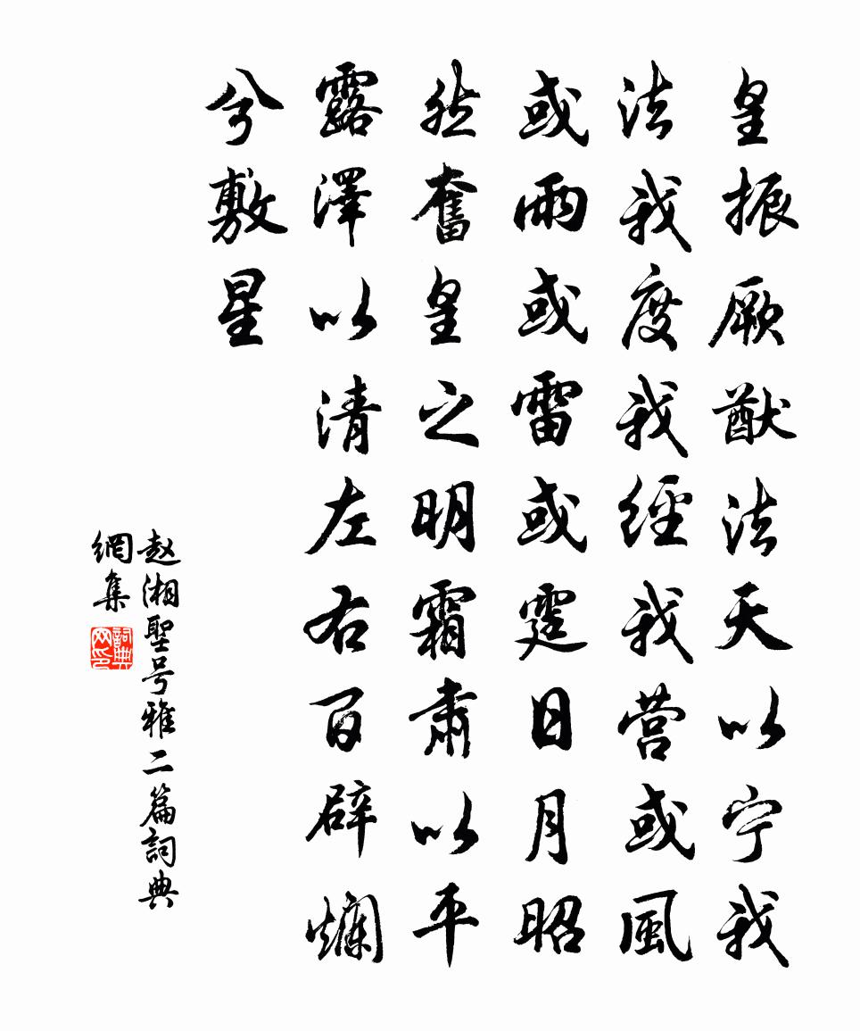 詩詞名句歷史字典書法欣賞書法字典國語詞典說文解字康熙字典古漢語字典標 題 作 者 詩 句 聖號雅二篇作者:趙湘 朝代:唐代聖號雅二篇原文皇振厥猷,法天以寧。我法我度,我經我營。或風或雨,或雷或霆。日月昭然,奮皇之明。霜肅以平,露澤以清。左右百辟,爛兮敷星。詩詞問答問:聖號雅二篇的作者是誰?答:趙湘問:聖號雅二篇寫於哪個朝代?答:唐代趙湘聖號雅二篇書法欣賞聖號雅二篇書法作品詩詞推薦初夏洪咨夔〔宋代〕鶴帳華纓絕,牛蹊老屐穿。薄晴生晚哢,深綠護余妍。萬卷不堪煮,百懷空自煎。朱櫻黃苦筍,小酌便陶然。贈范吏部張伯玉〔宋代〕海天東下越王州,碧城繚繞環山丘。春晴紫翠堆綺屋,日暮煙雨藏朱樓。禹祠花底金穴峻,賀老門前銀漢秋。何當幽居春晚陸游〔宋代〕老廢讎書病廢詩,晝閒惟與睡相宜。未尋內史流觴地,又近龐公上冢時。花發游蜂喧院落,筍長馴鹿入藩籬。石帆贈月溪羽士戴叔倫〔唐代〕月明溪水上,誰識步虛聲。夜靜金波冷,風微玉練平。自知塵夢遠,一洗道心清。更弄瑤笙罷,秋空鶴又鳴。經亂離後天恩流夜郎憶舊遊書懷贈江夏韋太守良宰李白〔唐代〕天上白玉京,十二樓五城。仙人撫我頂,結髮受長生。 誤逐世間樂,頗窮理亂情。九十六聖君,浮雲掛空名。 送平判官入秦(一作盧象詩)綦毋潛〔唐代〕謫遠自安命,三年已忘歸。同聲願執手,驛騎到門扉。雲是帝鄉去,軍書謁紫微。曾為金馬客,向日淚沾衣。玉蝴蝶高觀國〔宋代〕喚起一襟涼思,未成晚雨,先做秋陰。楚客悲殘,誰解此意登臨。古台荒、斷霞斜照,新夢黯、微月疏砧。總難禁罷還邊將雍陶〔唐代〕白須虜將話邊事,自失公權怨語多。漢主豈勞思李牧,趙王猶是用廉頗。新鷹飽肉唯閒獵,舊劍生衣懶更磨。百戰雪後梅邊方岳〔宋代〕老來筋力倦登山,契闊梅花幾日間。莫與梅花筋力倦,且推一雪阻躋攀。題隱圃贈蔣希魯范師道〔宋代〕勇退人難事,明公識慮長。波濤濟舟輯,霜雪見松篁。林下開前圃,花間撤亞槍。二疏良宴會,老杜好篇章。道向句常袞〔唐代〕風候已應同嶺北,雲山仍喜似終南。(《題漳浦驛》。《方輿勝覽》)送朱郎中壽昌通判河中府蘇頌〔宋代〕邶詩詠凱風,以成孝子志。鄭人復君母,傳稱能錫類。中郎常有懷,生不識所恃。登朝雖厚祿,當食每忘饋。念昔挽雷尚書喪歸二首陳杰〔宋代〕安裝聞難及廬山老,晚見喪歸南海翁。猶被卹章雖弗逮,竟成全節略相同。事惟有死仲連子,貌乃如生顏魯公。不飯客看鶴賞梅遇雨有作吳芾〔宋代〕鶴舞梅開總有情,小園方喜得雙清。無端風十妨遊覽,不使衰翁眼暫明。秋晚過洞庭張佖〔宋代〕征帆初掛酒初酣,暮景離情兩不堪。千里晚霞雲夢北,一洲霜橘洞庭南。溪風送雨這秋寺,磵石驚龍落潭。莫把羈寄友劉黻〔宋代〕瘴雲未免鍾儀摯,夜雨應憐范叔寒。尚有慈闈年九十,空揮客淚落江乾。念奴嬌(毀舍後作)姜夔〔宋代〕昔游未遠,記湘皋聞瑟,灃浦捐褋。因覓孤山林處士,來踏梅根殘雪。獠女供花,傖兒行酒,臥看青門轍。一丘吾石榴花丘葵〔宋代〕英英石榴花,不朱而自赤。凡今人之兮,誰不悅媚色。脂水漲渭流,妍姿竟傾國。送著作佐郎崔融等從梁王東征陳子昂〔唐代〕金天方肅殺。白露始專征。王師非樂戰。之子慎佳兵。海氣侵南部。邊風掃北平。莫賣盧龍塞。歸邀麟閣名。送於制乾二首釋寶曇〔宋代〕一笑無煩論古今,就中首肯即吾真。君今正與司南合,直指何曾更問人。名句推薦不見去年人,淚濕春衫袖。歐陽修《生查子·元夕》 江暗雨欲來,浪白風初起。何遜《相送》 金風玉露一相逢,便勝卻人間無數。秦觀《鵲橋仙·纖雲弄巧》 君安游兮西入秦,願為影兮隨君身。傅玄《車遙遙篇》 死生驚懼不入乎其胸,是故忤物而不懾。列子及其弟子《列子·黃帝》 天與火,同人;君子以類族辨物。佚名《易傳·象傳上·同人》 君子遺人以財,不若善言。佚名《孔子家語·六本》 藍橋何處覓雲英。只有多情流水、伴人行。蘇軾《南歌子·寓意》 置將不善,壹敗塗地司馬遷《史記·高祖本紀》 寵柳嬌花寒食近,種種惱人天氣。李清照《念奴嬌·春情》