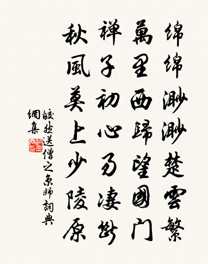 詩詞名句歷史字典書法欣賞書法字典國語詞典說文解字康熙字典古漢語字典標 題 作 者 詩 句 送僧之京師作者:皎然 朝代:唐代送僧之京師原文綿綿渺渺楚雲繁,萬里西歸望國門。禪子初心易淒斷,秋風莫上少陵原。詩詞問答問:送僧之京師的作者是誰?答:皎然問:送僧之京師寫於哪個朝代?答:唐代問:送僧之京師是什麼體裁?答:七絕皎然送僧之京師書法欣賞送僧之京師書法作品注釋全唐詩:卷815-35詩詞推薦送鳳翔范書記李頻〔唐代〕西京無暑氣,夏景似清秋。天府來相辟,高人去自由。江山通蜀國,日月近神州。若共將軍語,河蘭地未收。御閣端午帖子夏竦〔宋代〕五色彩絲初獻壽,九重嘉氣頌長生。庇民精意方虔鞏,垂拱仁風更穆清。李成季得閻子常古琴作晁補之〔宋代〕昔人流水高山手,此意寧從弦上有。閻侯捲舌臥閭里,意向是中留不朽。似聞綠綺置床頭,暑雨東城無麥秋。趙傳贈謝彥翔洪邁〔宋代〕我本世味薄,寸田足自營。年來荊棘盡,稍有梨棗萌。但恐骨相凡,未敢希長生。陳留達人後,未齔犀角盈。舊遊答謝家最小偏憐女(感元九悼亡詩,因為代答三首)白居易〔唐代〕嫁得梁鴻六七年,耽書愛酒日高眠。雨荒春圃唯生草,雪壓朝樹未有煙。身病憂來緣女少,家貧忘卻為夫賢。誰知水調歌頭 憶法眷伯瑜老姬翼〔元代〕相遇會心友,目擊契金蘭。登天游霧莫逆,雞黍不相干。常記岩岩亭下,俯瞰茫茫滄海,揮塵笑談間。霞卷鎮陽北送陳表道宰南豐樓鑰〔宋代〕與客出西郊,送子之南旴。子為名父子,才器真璠璵。乃翁老從臣,循吏追兩都。益公工擬人,謂比王仲舒。積善雜詠一百首醫和劉克莊〔宋代〕壽有可延理,醫無不死方。扁曾憂骨髓,和亦畏膏肓。水調歌頭 贈都科邵子和還嘉禾張雨〔元代〕別有梓人傳,精藝奪天工。便使玉人雕琢,妙手略相同。寶殿網珠窗戶,華蓋狻猊床座,金碧斗玲瓏。花萼間芝草山中寄招葉秀才林逋〔宋代〕夜鶴曉猿時復聞,寥寥長似耿離群。月中未要恨丹桂,嶺上且來看白雲。棋子不妨臨水著,詩題兼好共僧分。新憂歲旦立春張鎡〔宋代〕授受須知道一同,機緘默運仰神功。重輪赫日當天照,萬國陽和淑氣中。山中四首釋圓悟〔宋代〕暝色斂平川,雲歸日已夕。閒行信杖藜,倦坐憩苔石。花亦滿意紅,草自無心碧。吾亦樂吾年,人生不滿百。廬陵呼酒再用韻陳文蔚〔宋代〕令君領客作清游,蕭散仙人蓮葉舟。喚得酒來詩興發,浩歌和月吸黃流。句張載〔宋代〕叵要居仁宅,先須入禮門。水龍吟(送戴郎中漕荊襄)曹勛〔宋代〕曉雲閣雨。疏梅綴玉,塵尾聞談吐。精忠許國,才華扌離錦,塵勞釋去。六印雄圖,百川明辯,蘇張誰數。有奇謀吳起守信宋濂〔明代〕昔吳起出,遇故人,而止之食。故人曰:“諾,期返而食。”起曰:“待公而食。”故人至暮不來,起不食待之。絕句二首陳師道〔宋代〕密密丹房疊疊花,一枝臨路為人斜。丁寧語鳥傳春意,白下門東第幾家。停雲陶淵明〔魏晉〕(並序)停雲,思親友也。罇湛新醪,園列初榮,願言不從,嘆息彌襟。其一靄靄停雲,濛濛時雨。八表同昏,平失調名佚名〔宋代〕百紫千紅開遍了。次韻喜雨兼簡彝老陳棣〔宋代〕此身閱世一浮漚,無地安巢拙勝鳩。擊節聞君歌喜雨,裹糧知我迫填溝。涼宵自足莊生夢,豐歲仍寬子美憂。遙想名句推薦喧啾百鳥群,忽見孤鳳凰。韓愈《聽穎師彈琴》 教民禮順,莫善於悌。孔子及其弟子《孝經·廣要道》 行非恆者,天禁之。爽事,地禁之。佚名《黃帝四經·十大經·三禁》 殘雪壓枝猶有桔,凍雷驚筍欲抽芽。歐陽修《戲答元珍》 眾芳搖落獨暄妍,占盡風情向小園。林逋《山園小梅二首》 媼引濃妝女,兒扶爛醉翁。范成大《寒食郊行書事》 聲華實寡,危國亡土。佚名《黃帝四經·經法·亡論》 不枉東風吹客淚。相思難表,夢魂無據,惟有歸來是。歐陽修《青玉案·一年春事都來幾》 將入門,問孰存。將上堂,聲必揚。李毓秀《弟子規·謹》 老農家貧在山住,耕種山田三四畝。張籍《野老歌 / 山農詞》