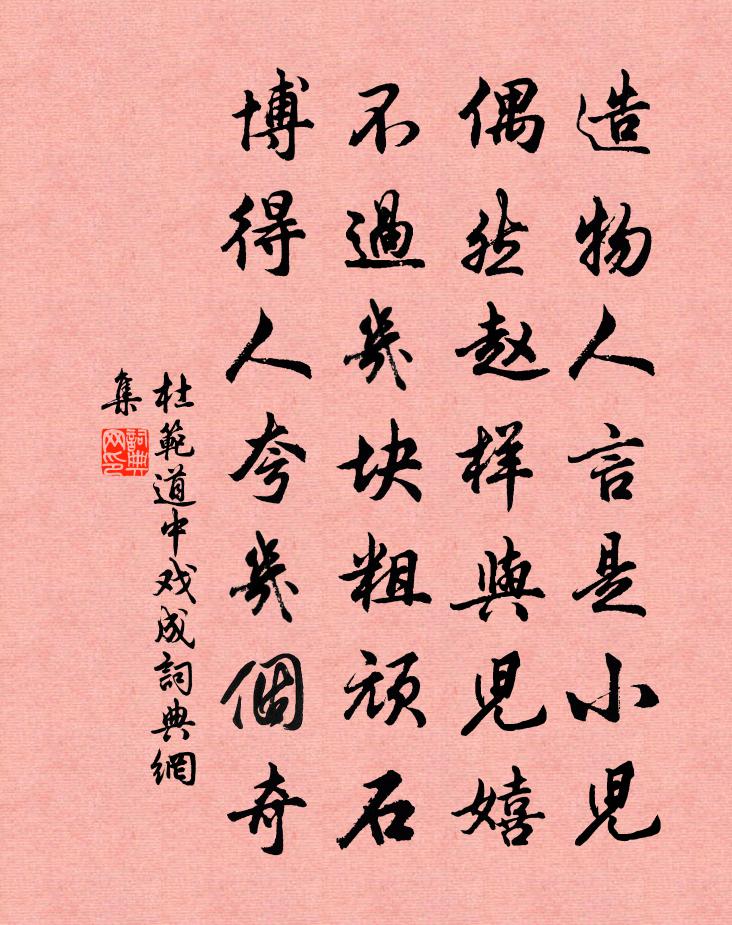 詩詞名句歷史字典書法欣賞書法字典國語詞典說文解字康熙字典古漢語字典標 題 作 者 詩 句 道中戲成作者:杜范 朝代:宋代道中戲成原文造物人言是小兒,偶然趙樣與兒嬉。不過幾塊粗頑石,博得人夸幾個奇。詩詞問答問:道中戲成的作者是誰?答:杜范問:道中戲成寫於哪個朝代?答:宋代杜范道中戲成書法欣賞道中戲成書法作品詩詞推薦題山院權審〔唐代〕萬葉風聲利,一山秋氣寒。曉霜浮碧瓦,落日度朱欄。次韻公實雷雨洪炎〔宋代〕驚雷勢欲拔三山,急雨聲如倒百川。但作奇寒侵客夢,若為一震靜胡煙!田園荊棘漫流水,河洛腥膻今幾年?擬叩戲作陳彥才〔宋代〕賦命安能比鉅公,偶然年月與時同。只因日上爭些子,笑向連江作醉翁。徐思遠出示月夜登樓詩句法甚高不類平生語幸王洋〔宋代〕幾處澄輝幾處秋,好閒時上水明樓。誰憐老子風前興,為遺中郎醉上舟。一帶橫空長漠漠,時看飛棟影悠悠。今宵寄江上人賈島〔唐代〕紫閣舊房在,新家中嶽東。煙波千里隔,訊息一朝通。寒日汀洲路,秋晴島嶼風。分明杜陵葉,別後兩經紅。回波詞中宗朝優〔唐代〕回波爾時栲栳,怕婦也是大好。外邊只有裴談,內里無過李老。謙翁釋紹曇〔宋代〕具通方眼放{嗤口換目}盲,爭肯先人一步行。窮四部洲求遜讓,看來不出老先生。元日詞其三御閣晏殊〔宋代〕南國雕胡奉紫庭,九重樓閣瑞雲生。丹毫玉策延洪算,八表歡娛四海清。書房雜書陸游〔宋代〕面槁發鬅鬠,衰殘百不能。夜房侵戶月,晨硯滿池冰。藥債多於酒,蔬餐薄過僧。年深拄杖折,自斫澗邊藤。送勛侄之官嵢峽五言五首劉克莊〔宋代〕太守今元結,論交四十年。汝行勿前卻,如在父兄邊。梅月為蚤虱所苦各賦二絕虱劉克莊〔宋代〕汝圖膏血飽,吾惜體膚傷。景略捫差快,宜師撲不妨。贈別周文顯三首趙蕃〔宋代〕苦節雖非中道,清風要激貪夫。寂寞掩關高臥,紛紛頓轡長途。題日者李成齋所藏李文清幅徐元傑〔宋代〕相公提筆福蒼生,印得當年命術精。鈞翰珍藏塞翁馬,六丁嚴護不容驚。落葉王建〔唐代〕陳綠向參差,初紅已重疊。中庭初掃地,繞樹三兩葉。採桑曲閻爾梅〔清代〕種桑人家十之九,連綠不斷陰千畝。年年相戒桑熟時,畏人盜桑晨暮守。前年災水去年旱,私債官租如火鍛。今春次韻景仁飲宋溫之南軒二首蘇轍〔宋代〕白髮迎新歲,播然國老更。感時能細說,對酒任徐行。畫軸高分品,詩詞妙入評。疏狂先醉倒,應許恃鄉情。飲闌木蘭花慢上元朱彝尊〔清代〕今年風月好,正雪霽、鳳城時。把魚鑰都開,鈿車溢巷,火樹交枝。參差鬧蛾歌后,聽笛家齊和《落梅》詞。翠幌友梅吳編校壽宮之側築庵曰全歸有詩十詠敬次楊公遠〔宋代〕游山瓢具竹邊安,石鼎松邊淪鳳團。更向梅邊觀鶴舞,好將模作畫圖看。虎溪林仲嘉〔宋代〕山闊青連海,溪長綠繞城。規模唐故郡,弦誦魯諸生。園林晏起,寄昭應韓明府、盧主簿韋應物〔唐代〕田家已耕作,井屋起晨煙。園林鳴好鳥,閒居猶獨眠。不覺朝已晏,起來望青天。四體一舒散,情性亦忻然。還復名句推薦書劍時將晚,丘園日已暮。孟浩然《田園作》 敗軍之將,不可以言勇。司馬遷《史記·淮陰侯列傳》 吏不治則亂,農事緩則貧。墨子《墨子·39章 非儒(下)》 流水本自斷人腸,堅冰舊來傷馬骨。盧思道《從軍行》 空獨倚東風,芳思誰寄。周密《繡鸞鳳花犯·賦水仙》 別來幾春未還家,玉窗五見櫻桃花。李白《久別離》 閒雲潭影日悠悠,物換星移幾度秋。王勃《滕王閣序》 閨中少婦不知愁,春日凝妝上翠樓。王昌齡《閨怨》 著葉滿枝翠羽蓋,開花無數黃金錢杜甫《秋雨嘆三首》 紫菊氣,飄庭戶,晚煙籠細雨。李煜《謝新恩·冉冉秋光留不住》