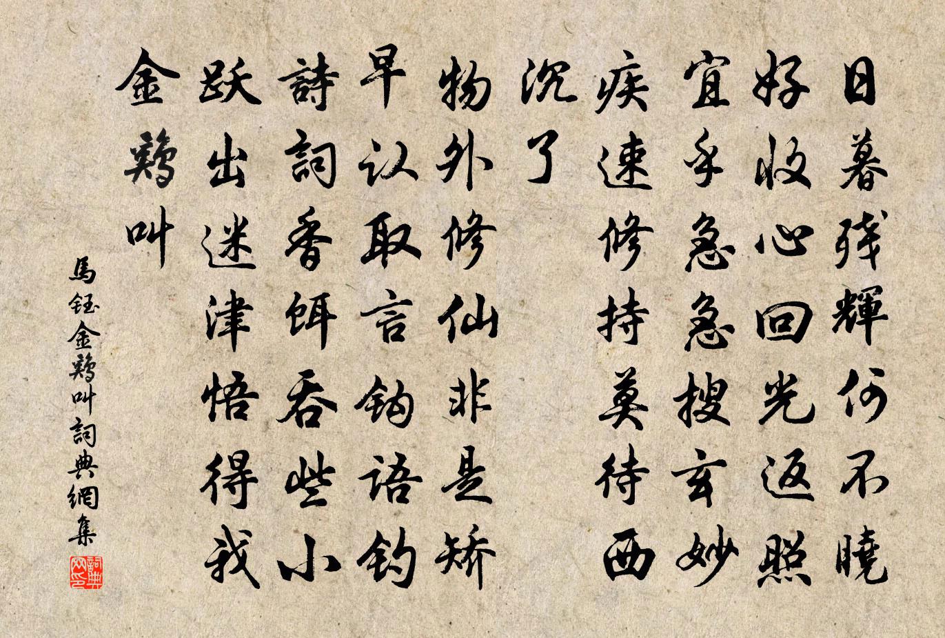 詩詞名句歷史字典書法欣賞書法字典國語詞典說文解字康熙字典古漢語字典標 題 作 者 詩 句 金雞叫作者:馬鈺 朝代:元代金雞叫原文日暮殘輝何不曉。好收心、迴光返照。宜乎急急搜玄妙。疾速修持,莫待西沉了。物外修仙非是矯。早認取、言鉤語釣。詩詞香餌吞些小。躍出迷津,悟得我金雞叫。詩詞問答問:金雞叫的作者是誰?答:馬鈺問:金雞叫寫於哪個朝代?答:元代問:金雞叫是什麼體裁?答:詞馬鈺金雞叫書法欣賞金雞叫書法作品詩詞推薦奉和七夕兩儀殿會宴應制趙彥昭〔唐代〕青女三秋節,黃姑七日期。星橋度玉珮,雲閣掩羅帷。河氣通仙掖,天文入睿詞。今宵望靈漢,應得見蛾眉。送契丹使還次韻答淨因老王安石〔宋代〕老欲求吾志,時方摭我華。強將愁出塞,空得病還家。日轉山河暖,風含草木葩。勝游思一往,不敢問三車。八璽蘇轍〔宋代〕秦人一璽十五城,百二十城當八璽。元日臨軒組綬新,君臣相顧無窮喜。九鼎崢嶸夏禹余,八璽錯落古所無。古人題耆英圖趙文〔宋代〕耆英會上十三人,當時世道如初春。洛陽牡丹非昔比,妖怪百出年年新。我見此圖淚如雨,諸老翩然過何許。何時王郎中妓席五詠箏顧況〔唐代〕秦聲楚調怨無窮,隴水胡笳咽復通。莫遣黃鶯花里囀,參差撩亂妒春風。·106 ·同王秘校和同年五使君韶餞送嚴文守江陰趙善括〔宋代〕江左詞章伯,朝端俊偉人。燕居文會友,得志澤加民。自是無心鏡,俱傳有腳春。成風運斤斧,何處不參神。次陳仲文八月十二八韻潘牥〔宋代〕痴雲吹盡月行天,新琢冰輪欠半邊。須信缺中元不缺,便教圓處可長圓。寒生沙渚雁初下,冷浸紗窗人未眠。萬事浣溪沙蘇軾〔宋代〕輕汗微微透碧紈。明朝端午浴芳蘭。流香漲膩滿晴川。彩線輕纏紅玉臂,小符斜掛綠雲鬟。佳人相見一千年。真除後謾記所見魏了翁〔宋代〕曉風鞭袖闖天關,濫綴東西兩省班。當日入趨東雜殿,番休卻逐侍臣還。續南有嘉魚曾豐〔宋代〕天予之骨,其鯁如鯪。道與之肉,其糜如鯹。非媺人口,可昌我齡。奈何薄味,從爾休聲。曲氏傾意,{歔業換魚老屋舒岳祥〔宋代〕雨涴壁泥行蜥蜴,風吟窗紙落蠨蛸。空齋惟有書千卷,夜夜青燈共寂寥。詠竹李覯〔宋代〕外邊雖節目,內里卻空虛。從來汗流浹,只為寫經書。鷓鴣天(次韻李參政壁朝陽閣落成)魏了翁〔宋代〕月落星稀露氣香。煙銷日出曉光涼。天東扶木三千丈,一片丹心似許長。淇以北,洛之陽。買花移竹且迷藏。九重牡丹花董嗣杲〔宋代〕大花香透已春過,莫妙春工點染多。蜀地錦機裁色樣,洛陽土脈蘊中和。牙牌有字分奇品,金屋無人續艷歌。明月柳梢青張任國〔宋代〕掛起招牌。一聲喝采,舊店新開。熟事孩兒,家懷老子,畢竟招財。當初合下安排。又不豪門買呆。自古道、正身失調名(贈妓)阮郎中〔宋代〕東風捻就,腰兒纖細。系的粉裙兒不起。近來只慣掌中看,忍教在、燭花影里。更闌應是,酒紅微褪。暗蹙損、眉呈陸嚴州五首趙蕃〔宋代〕簿領古白下,檄書走臨川。陳詩道所懷,奈此巍巍然。臨分得聞見,語以故有連。此意亦厚矣,乖離今十年。惟此溫泉是稱愈疾豈予獨受其福思與兆人共之…言其志李隆基〔唐代〕桂殿與山連,蘭湯涌自然。陰崖含秀色,溫谷吐潺湲。績為蠲邪著,功因養正宣。願言將億兆,同此共昌延。石堂歌元在庵主〔宋代〕吾斲石堂無變怪,土缶瓦鼓閒遊戲。一钁相隨萬事空,十二時中空捉擊。牢捉擊,不在三閒前後際。拍將兩手笑呵蠖軒孤坐寄曹南教授八弟晁補之〔宋代〕畏暑經旬不涉街,蠖軒孤坐壁生苔。出檐碧筍猶爭長,映戶丹榴故後開。雙蝶風前愁夜去,一蟬雨外送秋來。曹南名句推薦黃鸝驚夢破,青鳥喚春還。張弘范《臨江仙·憶舊》 犬吠水聲中,桃花帶露濃。李白《訪戴天山道士不遇》 武帝宮中人去盡,年年春色為誰來。岑參《登古鄴城》 嘆鳳嗟身否,傷麟怨道窮。李隆基《經鄒魯祭孔子而嘆之》 士有妒友,則賢交不親。荀子《荀子·大略》 呵筆難臨帖,敲床且煮茶。大須《暮雪》 又莫是東風逐君來,便吹散眉間一點春皺蘇軾《洞仙歌·詠柳》 時來風送滕王閣,運去雷轟薦福碑。佚名《增廣賢文·上集》 雞聲茅店月,人跡板橋霜。溫庭筠《商山早行》 淡中交耐久,靜里壽延長。王永彬《圍爐夜話·第一一六則》