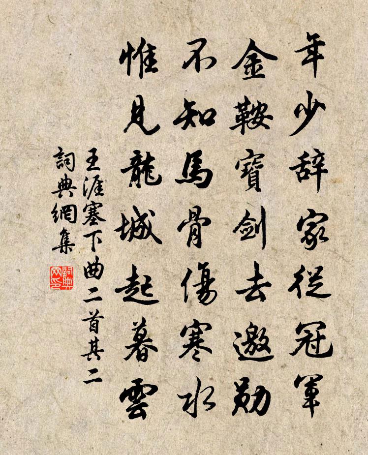 詩詞名句歷史字典書法欣賞書法字典國語詞典說文解字康熙字典古漢語字典標 題 作 者 詩 句 塞下曲二首·其二作者:王涯 朝代:唐代塞下曲二首·其二原文年少辭家從冠軍,金鞍寶劍去邀勛。不知馬骨傷寒水,惟見龍城起暮雲。詩詞問答問:塞下曲二首·其二的作者是誰?答:王涯問:塞下曲二首·其二寫於哪個朝代?答:唐代王涯塞下曲二首·其二書法欣賞塞下曲二首·其二書法作品注釋冠軍:古代將軍的名號。金妝寶劍:用黃金裝飾劍柄 或劍鞘的寶劍。龍城:泛指邊境地區。標籤:邊塞,讚美,寫人,愛國詩詞推薦巫山一段雲(五之五·雙調)柳永〔宋代〕蕭氏賢夫婦,茅家好弟兄。羽輪飆駕赴層城。高會盡仙卿。一曲雲謠為壽。倒盡金壺碧酒。醺酣爭撼白榆花。踏碎籌筆驛李商隱〔唐代〕猿鳥猶疑畏簡書,風雲常為護儲胥。徒令上將揮神筆,終見降王走傳車。管樂有才終不忝,關張無命欲何如。他年登原州城呈張蕡從事魏野〔宋代〕異鄉何處最牽愁?獨上邊城城上樓。日暮北來惟有雁,地寒西去更無州。數聲塞角高還咽,一派涇河凍不流。君作跋子瞻和陶詩黃庭堅〔宋代〕子瞻謫嶺南,時宰欲殺之。飽吃惠州飯,細和淵明詩。彭澤千載人,東坡百世士。出處雖不同,風味乃相似。永王東巡歌·其一李白〔唐代〕永王正月東出師,天子遙分龍虎旗。樓船一舉風波靜,江漢翻為雁鶩池。七發枚乘〔兩漢〕楚太子有疾,而吳客往問之曰:“伏聞太子玉體不安,亦少間乎?”太子曰:“憊!謹謝客。”客因稱曰:“今時贈張公洲革處士李白〔唐代〕列子居鄭圃,不將眾庶分。革侯遁南浦,常恐楚人聞。抱瓮灌秋蔬,心閒遊天雲。每將瓜田叟,耕種漢水濆。時登浮萍篇曹植〔魏晉〕浮萍寄清水,隨風東西流。結髮辭嚴親,來為君子仇。恪勤在朝夕,無端獲罪尤。在昔蒙恩惠,和樂如瑟琴。何意淮上遇洛陽李主簿韋應物〔唐代〕結茅臨古渡,臥見長淮流。窗里人將老,門前樹已秋。寒山獨過雁,暮雨遠來舟。日夕逢歸客,那能忘舊遊。秦州雜詩二十首·其八杜甫〔唐代〕聞道尋源使,從天此路回。牽牛去幾許,宛馬至今來。一望幽燕隔,何時郡國開。東征健兒盡,羌笛暮吹哀。走馬川行奉送出師西征 / 走馬川行奉送封大夫出師西征岑參〔唐代〕君不見走馬川行雪海邊,平沙莽莽黃入天。輪台九月風夜吼,一川碎石大如斗,隨風滿地石亂走。匈奴草黃馬正肥屈原列傳司馬遷〔兩漢〕屈原者,名平,楚之同姓也。為楚懷王左徒。博聞強志,明於治亂,嫻於辭令。入則與王圖議國事,以出號令;出薊中作高適〔唐代〕策馬自沙漠,長驅登塞垣。邊城何蕭條,白日黃雲昏。一到征戰處,每愁胡虜翻。豈無安邊書,諸將已承恩。惆悵水調歌頭(追和)張元乾〔宋代〕舉手釣鰲客,削跡種瓜侯。重來吳會三伏,行見五湖秋。耳畔風波搖盪,身外功名飄忽,何路射旄頭。孤負男兒志飲酒 其九陶淵明〔魏晉〕清晨聞叩門,倒裳往自開。問子為誰與?田父有好懷。壺漿遠見候,疑我與時乖。“褸襤茅檐下,未足為高棲。一崑崙使者李賀〔唐代〕崑崙使者無訊息,茂陵煙樹生愁色。金盤玉露自淋漓,元氣茫茫收不得。麒麟背上石文裂,虬龍鱗下紅枝折。何處永王東巡歌十一首李白〔唐代〕永王正月東出師,天子遙分龍虎旗。樓船一舉風波靜,江漢翻為雁鶩池。三川北虜亂如麻,四海南奔似永嘉。但用墨池記曾鞏〔宋代〕 臨川之城東,有地隱然而高,以臨於溪,曰新城。新城之上,有池窪然而方以長,曰王羲之之墨池者,荀伯子揚子江文天祥〔宋代〕幾日隨風北海游,回從揚子大江頭。臣心一片磁針石,不指南方不肯休。寄生草·間別查德卿〔元代〕姻緣簿剪做鞋樣,比翼鳥搏了翅翰,火燒殘連理枝成炭,針簽瞎比目魚兒眼,手揉碎並頭蓮花瓣,擲金釵攧斷鳳凰名句推薦海角天涯,寒食清明,淚點絮花沾袖。吳文英《花心動·柳》 世俗之君子,貧而謂之富則怒,無義而謂之有義則喜。墨子《墨子·46章 耕柱》 垓下美人泣楚歌,定陶美人泣楚舞,真龍亦鼠虎亦鼠。王象春《書項王廟壁》 人珍我棄、人棄我取沈復《浮生六記·浪遊記快》 霸圖今已矣,驅馬復歸來。陳子昂《燕昭王》 黃衫飛白馬,日日青樓下。陳克《菩薩蠻·赤闌橋盡香街直》 淺把涓涓酒,深憑送此生。杜甫《水檻遣心二首》 江涵秋影雁初飛,與客攜壺上翠微。杜牧《九日齊山登高》 江心雲帶蒲帆重,樓上風吹粉淚香。嚴仁《鷓鴣天·惜別》 丹陽城南秋海陰,丹陽城北楚雲深。王昌齡《芙蓉樓送辛漸二首》