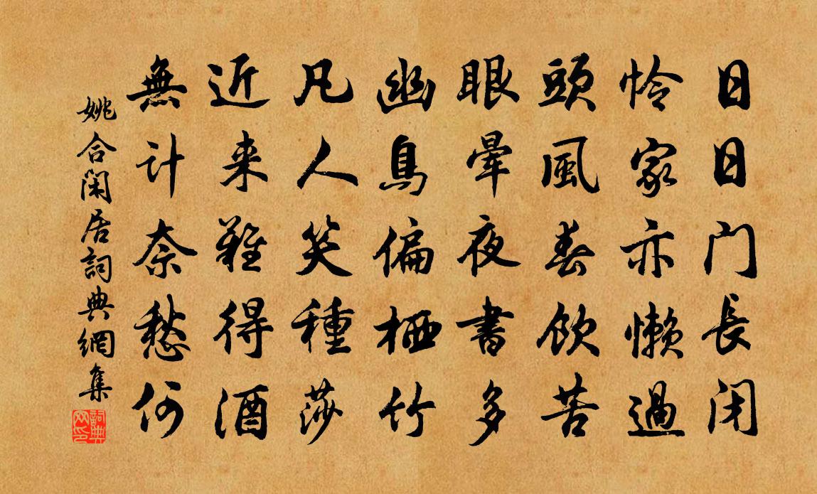 詩詞名句歷史字典書法欣賞書法字典國語詞典說文解字康熙字典古漢語字典標 題 作 者 詩 句 閒居作者:姚合 朝代:唐代閒居原文日日門長閉,憐家亦懶過。頭風春飲苦,眼暈夜書多。幽鳥偏棲竹,凡人笑種莎。近來難得酒,無計奈愁何。詩詞問答問:閒居的作者是誰?答:姚合問:閒居寫於哪個朝代?答:唐代姚合閒居書法欣賞閒居書法作品注釋全唐詩:卷502-48詩詞推薦過洞庭袁說友〔宋代〕兩湖綿亘連千里,萬古蒼梧說二妃。最羨巴童並蜀客,飽看日月去還歸。上執政四十韻雅琥〔元代〕聖主飛龍日,求賢似拾珍。典謨皆故老,登用必元臣。日月當黃道,風雲擁紫宸。華封歸帝力,壽域囿吾民。旭旭至節前一日六首方回〔宋代〕燈前一影客中身,雞未鳴時起已頻。每日盆梅千百擔,倚樓閒作看花人。二月二十日再鎖宿四絕劉克莊〔宋代〕上水船須寸寸挨,摩挲空腹愧非才。熱瞞舍下痴兒女,道是先生視草來。和徐季功舒蘄道中二十首王之道〔宋代〕日遲風細午陰微,柳外青驄去若飛。過得水村聞笑語,幾家扶得醉人歸。昭潭十愛梅摯〔宋代〕我愛昭州樂,供官不在多。薰風齊樂聖,淑氣且宣和。謁廟知神格,鋪筵喜客過。聲邊無一事,對酒漫高歌。讀書張九成〔宋代〕橫浦非吾土,久寓亦何卿。不學元相國,百斛貯胡椒。饑寒何以遣,唯以文字消。方其得意處,捽茹亦逍遙。頓忘送楊子奇赴辟潭淵宋祁〔宋代〕老避嘲師晝不眠,喜聞書辟冠初筵。車陪魏館鳴笳路,食對何侯下箸錢。使驛馬歸催露檄,學帷鱣墮晦餘編。知君景祐大享明堂二首佚名〔宋代〕偃革興文,封浴考瑞。威烈巍巍,允膺宗祀。西華徐夤〔唐代〕五千仞有餘神秀,一一排雲上氵寥。疊嶂出關分二陝,殘岡過水作中條。巨靈廟破生春草,毛女峰高入絳霄。拜祝廬山雜詠棲緊三峽橋陳文蔚〔宋代〕我來未試烹茶水,且讀石上涪翁詩。上臥百盡晴蝃蝀,下貯一匣青玻璃。淵深知是蛟龍宅,風怒似挾熊虎威。自古項伯徐鈞〔宋代〕霸上孤軍勢莫支,鴻門一劍事尤危。射陽不與留侯舊,楚漢興亡未可知。烏祈酒二首楊萬里〔宋代〕入到嚴州不識田,一江兩岸萬青山。烏祈酒味君休問,費盡江波賣盡錢。春欲暮雪作不已簡子新家鉉翁〔宋代〕和平心事春三月,淡泊生涯水一杯。老矣只余歸夢在,世間萬事付心灰。探春呂本中〔宋代〕謾遣兒童掃雪開,卻穿籬落看春回。溪山冷落泥三尺,故舊飄零酒一杯。止買芒鞋供踏雪,更攜藜杖與尋梅。玉川次韻李元叔田邦鎮唱酬之什沈與求〔宋代〕李侯少年真自喜,收名擬擅東南美。大科異等不作難,堂堂奏賦明光里。眼看斗粟飽侏儒,空腸殷雷歸著書。胸中大死釋普濟〔宋代〕上門上戶拚窮命,不覺全身墮險崖。盡十方空俱殞滅,玲瓏八面露死骸。登廬山五老峰李白〔唐代〕廬山東南五老峰,青天削出金芙蓉。九江秀色可攬結,吾將此地巢雲松。頃與公擇讀東坡雪後北台二詩嘆其韻險無窘步趙蕃〔宋代〕雪埋老屋無薪賣,晨起謀炊自毀車。覓飽預期千頃麥,破慳先試一春花。便營野屐尋茶戶,更約綈袍當酒家。處士暮秋言懷魏徵〔唐代〕首夏別京輔,杪秋滯三河。沉沉蓬萊閣,日夕鄉思多。霜剪涼階蕙,風捎幽渚荷。歲芳坐淪歇,感此式微歌。名句推薦不可以身相得見如來。鳩摩羅什譯《金剛經·如理實見》 恐是仙家好別離,故教迢遞作佳期。李商隱《辛未七夕》 料得他鄉遇佳節,亦應懷抱暗悽然。韓偓《寒食日重遊李氏園亭有懷》 三月正當三十日,占得,春光畢竟共春歸。莊棫《定風波·為有書來與我期》 醉後莫思家,借取師師宿。晏幾道《生查子·落梅庭榭香》 酒盞旋將荷葉當。蓮舟盪。時時盞里生紅浪。歐陽修《漁家傲·花底忽聞敲兩槳》 一寸相思一寸灰。蘇軾《南鄉子·集句》 惟將終夜常開眼,報答平生未展眉。元稹《遣悲懷三首·其三》 冷紅葉葉下塘秋。長與行雲共一舟。姜夔《憶王孫·番陽彭氏小樓作》 思君如隴水,長聞嗚咽聲。雍裕之《自君之出矣》