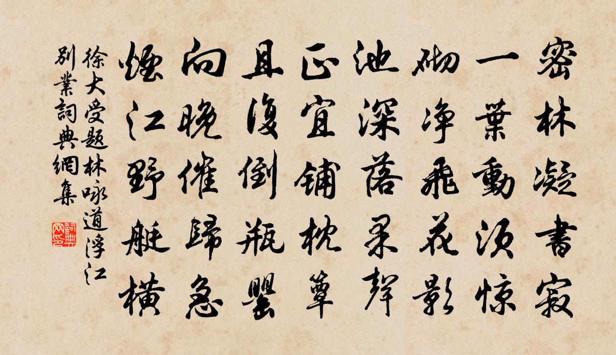 詩詞名句歷史字典書法欣賞書法字典國語詞典說文解字康熙字典古漢語字典標 題 作 者 詩 句 題林詠道浮江別業作者:徐大受 朝代:宋代題林詠道浮江別業原文密林凝書寂,一葉動須驚。砌淨飛花影,池深落果聲。正宜鋪枕簟,且復倒瓶罌。向晚催歸急,煙江野艇橫。詩詞問答問:題林詠道浮江別業的作者是誰?答:徐大受問:題林詠道浮江別業寫於哪個朝代?答:宋代徐大受題林詠道浮江別業書法欣賞題林詠道浮江別業書法作品詩詞推薦偈二十七首釋守淨〔宋代〕一葉落,便知秋,顢頇佛性。一塵起,大地收,儱侗真如。若是衲僧門下客,不用更躊躇。曾向華山圖上看,又添木蘭花慢(宴遂寧新進士)魏了翁〔宋代〕記薰風殿上,曾當暑、侍君王。看絳服臨軒,白袍當殿,流汗翻漿。今年詔書催發,趁槐庭、初夏午陰涼。瘦馬行胡仲方歸自武陵已過賤生尚煩追賀托柑致頌褒項安世〔宋代〕老後人間百不堪,形容今似過時柑。液枯自斷仙無分,面皺酒宜佛作龕。更說吳姬兒女事,且尋湘頌友生談。行裝次韻同年楊使君回自毘陵,同泛石湖,舟中見范成大〔宋代〕客舫中流下,人家夾岸看。洛花堆錦暖,吳藕鏤冰寒。莫厭清歡暫,須知後會難。小詩煩本事,任禿采毫端。奉和幸韋嗣立山莊侍宴應制李嶠〔唐代〕南洛琴師臣契,琴東岩王佐居。幽情遺紱冕,宸眷屬樵漁。制下峒山蹕,恩回灞水輿。松門駐旌琴,薜幄引簪裾。對月六首白玉蟾〔宋代〕深秋荷敗柳枯時,霜蟹香棖副所思。月要人窺嬌不上,風知我醉放多吹。歇後宰相金朋說〔宋代〕歇後詩人何志誠,自量心跡甚詳明。世多覬竇穿窬者,對爾寧無愧赧情。贈李丹上徐璣〔宋代〕曾學輕騰術,長懷萬里心。江湖雲似水,巴廣石如林。好飲身常樂,無言道更深。丹砂能愈疾,不用化黃金。次同冠峽(赴陽山作)韓愈〔唐代〕今日是何朝,天晴物色饒。落英千尺墮,遊絲百丈飄。泄 * 岩脈,懸流揭浪標。無心思嶺北,猿鳥莫相撩。初夏雜興陸游〔宋代〕終日頹然蠹簡中,門前煙水浩無窮。百年等是一枯冢,四海應無雨放翁。栗玉長枝挑苦筍,胭脂小把翦防風。地偏元符祀感生帝五首佚名〔宋代〕二人交泰,七政順行。四序資始,萬物含生。皇朝創業,盛德致平。為民所福,潔此精誠。西樓子/相見歡蔡伸〔宋代〕紅靴玉帶葳蕤。翠綃衣。並轡垂鞭妝影、照清溪。長亭路。停騎處。晚涼時。空有許多明月、伴雙棲。慈母磯張弋〔宋代〕莫嫌舟逆上,子細得看山。眾草名難識,孤花影自閒。避人鷹翅響,經雨石文斑。夜久江風冷,神仙定往還。送張直翁薛師石〔宋代〕宰公詩句是騷人,官舍況臨湘水濱。衡岳望中思策蹇,滄浪清甚欲垂綸。長於一縣花開後,獨訪三閭廟裡頻。元亮經梧州宋之問〔唐代〕南國無霜霰,連年見物華。青林暗換葉,紅蕊續開花。春去聞山鳥,秋來見海槎。流芳雖可悅,會自泣長沙。五松山鄭獬〔宋代〕天上仙人謫世間,醉中偏愛五松山。錦袍已跨鯨魚去,惟有山僧自往還。題真仙岩松庵道人〔宋代〕千岩萬壑倚晴空,此洞真奇迥不同。未數洞天三十六,想移當日太清宮。山中吟三首錢時〔宋代〕百不如人此老身,老身何必要如人。等閒花草隨宜種,多在山中住幾春。挽表叔趙君任安撫二首劉克莊〔宋代〕丞相規恢策,家庭已習聞。寧論乘一障,真可帥中軍。玉麈無能對,金錢有即分。心知伏波病,多半為忠勤。見物便見心張伯端〔宋代〕見物便見心,無物心不現。十方通塞中,真心無不遍。若生知識解,卻成顛倒見。睹境能無心,始見菩提面。名句推薦醉翁之意不在酒,在乎山水之間也。歐陽修《醉翁亭記》 疾風知勁草,板蕩識誠臣。李世民《賜蕭瑀》 客愁全為減,舍此復何之?杜甫《後游》 更把玉鞭雲外指,斷腸春色在江南。韋莊《古離別》 挽弓當挽強,用箭當用長。杜甫《前出塞九首》 不明察,不能燭私。韓非及後人《韓非子·孤憤》 深知身在情長在,悵望江頭江水聲。李商隱《暮秋獨游曲江》 故其樂逾繁者,其治逾寡。自此觀之,樂非所以治天下也。墨子《墨子·07章 三辯》 雙眼自將秋水洗,一生不受古人欺。袁枚《隨園詩話·補遺 卷三》 漁舟逐水愛山春,兩岸桃花夾古津。王維《桃源行》
