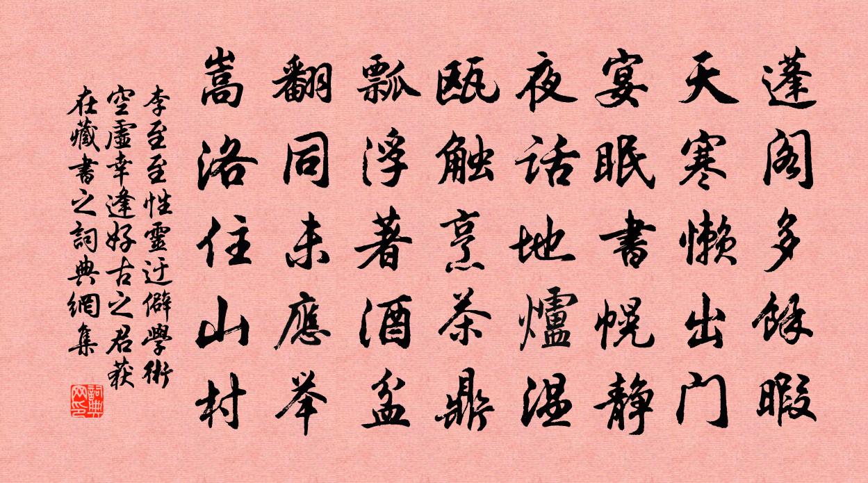 詩詞名句歷史字典書法欣賞書法字典國語詞典說文解字康熙字典古漢語字典標 題 作 者 詩 句 至性靈迂僻學術空虛幸逢好古之君獲在藏書之作者:李至 朝代:宋代原文蓬閣多餘暇,天寒懶出門。宴眠書幌靜,夜話地爐溫。甌觸烹茶鼎,瓢浮著酒盆。翻同未應舉,嵩洛住山村。詩詞問答問:《至性靈迂僻學術空虛幸逢好古之君獲在藏書之》的作者是誰?答:李至問:該詩寫於哪個朝代?答:宋代書法欣賞至性靈迂僻學術空虛幸逢好古之君獲在藏書之書法作品詩文賞析【原題】:至性靈迂僻學術空虛幸逢好古之君獲在藏書之府惟無功而祿重招髦彥之譏而多病所縈實喜優閒之任居常事簡得以狂吟因成惡詩十章以蓬閣多餘暇冠其篇而為之目亦樂天何處難忘酒之類也塵黷英鑒幸賜一覽下情不任兢灼之至詩詞推薦行路難贈蕭坦翁朱繼芳〔宋代〕行路難,居不易,旋買生柴煮一字。三千風不直一杯水,何用狂吟動天地。郡不見陸天隨。忍窮讀書白眼屠沽兒。雨涼董嗣杲〔宋代〕客中貧莫支,萬事付不理。今秋易覺寒,雨意猶未止。青青梧桐樹,蠹葉浮井水。秋來未為久,俗塵已披靡。夜分玉階怨鄭鏦〔唐代〕昔日同飛燕,今朝似伯勞。情深爭擲果,寵罷怨殘桃。別殿春心斷,長門夜樹高。雖能不自悔,誰見舊衣褒。首尾吟邵雍〔宋代〕堯夫非是愛吟詩,詩是堯夫窮理時。語愛何嘗過父子,講和曾未若夫妻。恩多意思翻成恨,歡極情懷卻似悲。何事寒食游南湖三首蘇轍〔宋代〕繞郭春水滿,被堤新柳黃。官池無禁約,野艇得飛揚。浪泛歌聲遠,花浮酒氣香。晚風歸棹急,細雨濕紅妝。頌古十五首釋慧遠〔宋代〕你愛我笊籬,我愛你木杓。主山才放高,案山又岌嶪。居士大同師,將錯便就錯。歸去來兮天地寬,一對鐵槌何處洞霄宮陳堯佐〔宋代〕二天封部稼如雲,流水清寒出洞門。更愛林間盤石上,松花飄落羽人樽。郊廟朝會歌辭紹熙元年恭上壽星聖皇太后至尊佚名〔宋代〕帝受內禪, * 紹熙。欽崇慈親,孝心肅祗。迺建成號,迺茂丕德。發冊文庭,聲歌侑之。友賢堂蔡洸〔宋代〕築堂傍西廡,非悅輪奐美。公餘竟何之,行行輒至止。紛紜屏玩好,周遭羅經史。晤對今偉人,尚論古君子。擇善頌古六首釋崇岳〔宋代〕狗子佛性無,門上釘桃符。千鴉俱不入,百怪盡消除。宋玉宅吳融〔唐代〕草白煙寒半野陂,臨江舊宅指遺基。已懷湘浦招魂事,更憶高唐說夢時。穿徑早曾聞客住,登牆豈復見人窺。今朝樓觀(秦始皇立老子廟於觀南,晉惠始修此觀)蘇軾〔宋代〕門前古碣臥斜陽,閱世如流事可傷。長有游幽人悲晉惠,強修遺廟學秦皇。丹砂久窖井水赤,白誰燒廚灶香。聞白髮趙汝鐩〔宋代〕朱顏留不住,白髮自應生。摘了依然有,徙勞打鑷聲。春盡有感楊萬里〔宋代〕等春不到怨春遲,又是紅稀綠滿枝。雨後晚花猶好在,檻前殘醉欲醒時。百年人事皆如許,千載詩聲亦浪垂。金印春日龍輔〔宋代〕侵階草逾碧,明窗日漸遲。攜針聽語鳥,牽斷繡床絲。李夫人歌劉徹〔兩漢〕是邪非邪。立而望之。偏何姍姍其來遲。晚夏登張儀樓呈院中諸公段文昌〔唐代〕重樓窗戶開,四望斂煙埃。遠岫林端出,清波城下回。乍疑蟬韻促,稍覺雪風來。並起鄉關思,銷憂在酒杯。句武允蹈〔宋代〕露萱鉗宿蝶,風木撼鳴鳩。屋頭風過雁,燈背月移窗。霜林五色錦,煙渡一縈絲。午簟展風供睡課,夜窗扃雨辦詩送琉書記還長樂釋崇岳〔宋代〕相見相從道自親,妙高峰頂謾因循。業風忽起波濤惡,一錫飄然到七閩。鷺鷥司馬光〔宋代〕清閒自合無憂累,白髮何因更颯然。遙望孤飛下秋水,雪花一片落晴天。名句推薦看風流慷慨,談笑過殘年辛棄疾《八聲甘州·故將軍飲罷夜歸來》 金玉其外,敗絮其中劉基《賣柑者言》 意得則舒懷以命筆,理伏則投筆以卷懷劉勰《文心雕龍·養氣》 更傾寒食淚,欲漲冶城潮。王安石《壬辰寒食》 欲將輕騎逐,大雪滿弓刀。盧綸《和張僕射塞下曲·其三》 客里相逢,籬角黃昏,無言自倚修竹。姜夔《暗香疏影》 善不積不足以成名,惡不積不足以滅身。佚名《易傳·繫辭傳下·第五章》 春來茗葉還爭白,臘盡梅梢盡放紅。韓元吉《送陸務觀福建提倉》 隨意春芳歇,王孫自可留。王維《山居秋暝》 橫戈從百戰,直為銜恩甚。李白《塞下曲六首》