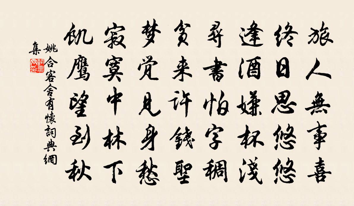 詩詞名句歷史字典書法欣賞書法字典國語詞典說文解字康熙字典古漢語字典標 題 作 者 詩 句 客舍有懷作者:姚合 朝代:唐代客舍有懷原文旅人無事喜,終日思悠悠。逢酒嫌杯淺,尋書怕字稠。貧來許錢聖,夢覺見身愁。寂寞中林下,飢鷹望到秋。詩詞問答問:客舍有懷的作者是誰?答:姚合問:客舍有懷寫於哪個朝代?答:唐代問:客舍有懷是什麼體裁?答:五律姚合客舍有懷書法欣賞客舍有懷書法作品注釋全唐詩:卷498-19詩詞推薦再和晁說之〔宋代〕頃歲官嘗傍紫虛,嵩雲緱月笑談余。惟知猿鶴乞骸疏,不錄熊羆諫獵書。游寺但知能自與,焚舟不復問何如。岩廊與任鯤同按沙苑李復〔宋代〕寒空暗澹風滿衣,索回林薄相追隨。野花班班隱亂草,暮葉翩翩辭高枝。渭水無煙但聞哭,延州築城猶出師。四顧金剛隨機無盡頌依法出生分第八釋印肅〔宋代〕寶施三千界,住相終成壞。離相達無餘,此是空知解。五郊樂章。黃帝宮音佚名〔唐代〕黃中正位,含章居貞。既長六律,兼和五聲。畢陳萬舞,乃薦斯牲。神其下降,永祚休平。陳祁秀才園亭曾鞏〔宋代〕眼無塵土境殊清,一繞芳蹊病體輕。煙樹疑從古畫風,水軒真在碧天行。君能極巧安山勢,我欲忘歸聽竹聲。只恐禪僧福公寄惠牧牛圖答以問牛歌張舜民〔宋代〕訶訶訶,棲岩老法師,寄我牧牛頌。我是人間百歲人,今朝卻作嬰兒弄。堪笑其間有一牛,滿身變白尾猶黑。想君桂林宴提刑樂語口號李曾伯〔宋代〕鷺州鴛渚久相知,弭節開藩並此時。越俎況當交使事,舉觴何惜話心明。欣逢桂子三秋候,細和梅花萬里詩。指日初夏趙葵〔宋代〕梅子留酸濺齒牙,芭蕉分綠映窗紗。日高睡起無情思,閒香兒童捉柳花。偈頌十八首釋如淨〔宋代〕漫天大水雲翻墨,捲地狂風浪袞山。掣斷絲綸歸喝彩,鯨鰲只在此山間。操舟又入洪波里,愁殺漁翁兩鬢斑。偈頌八十七首釋慧開〔宋代〕今朝十朋念五,黃龍有一轉語。分明更不囊藏,直截當陽為舉。自嘲落牙曹琰〔宋代〕昨朝飯里有粗砂,隱落翁翁一個牙。為報妻兒莫惆悵,見存足以養渾家。江亭寓目盧拱〔唐代〕江郭帶林巒,津亭倚檻看。水風蒲葉戰,沙雨鷺鷥寒。晚木初凋柳,秋叢欲敗蘭。哀猿自相叫,鄉淚好無端。承劉學錄示三山佳詠兼欲下旬仙鯉湖宿約以詩陳宓〔宋代〕秋聲又向耳邊鳴,轉眼平頭六十人。最是讀書難久坐,不甘空負百年身。和胡宗澤見寄吳芾〔宋代〕湖邊策杖步新晴,陡覺胸襟萬慮平。老去不須防意馬,靜中已是息心兵。閒來綠樹陰中坐,懶去紅塵鬧里行。賴與辰州聞大駕還宮戎昱〔唐代〕聞道鑾輿歸魏闕,望雲西拜喜成悲。寧知隴水煙銷日,再有園林秋薦時。渭水戰添亡虜血,秦人生睹舊朝儀。自慚生朝自述黃庚〔宋代〕都道人生七十稀,老逢初度嘆衰遲。飛觴醉月貧無酒,走筆迎春富有詩。憔悴自鄰蒲柳質,劬勞空起蓼莪思。門無山房陸游〔宋代〕何處合題詩,山房病起時。晨光鳥先覺,春信柳偏知。陋學勤何益?虛名悔可追。布衾新絮暖,惟與睡相宜。奉和聖制寒食作應制張說〔唐代〕寒食春過半,花穠鳥復嬌。從來禁火日,會接清明朝。斗敵雞殊勝,爭球馬絕調。晴空數雲點,香樹百風搖。改木台山婆話頌釋守仁〔宋代〕開個燈心皂角鋪,日求升合度朝昏。只因風雨連綿久,本利一空愁倚門。題國清寺趙湘〔唐代〕物外千年寺,人間四絕名。兩廊諸岳色,九里亂松聲。海氣飄僧院,秋鍾徹懸城。夜來疏磬斷,月影遍樓清。名句推薦龜游蓮葉上,鳥宿蘆花里。李白《姑孰十詠》 半死梧桐老病身,重泉一念一傷神。白居易《為薛台悼亡》 其旨遠,其辭文,其言曲而中,其事肆而隱。佚名《易傳·繫辭傳下·第六章》 最是倉皇辭廟日,教坊猶奏別離歌,垂淚對宮娥。李煜《破陣子·四十年來家國》 亂山殘雪夜,孤燭異鄉人。崔塗《除夜 / 巴山道中除夜書懷 / 除夜有懷》 桃花盡日隨流水,洞在清溪何處邊。張旭《桃花溪》 明日相思莫上樓,樓上多風雨。游次公《卜運算元·風雨送人來》 偶然值林叟,談笑無還期。王維《終南別業 / 初至山中 / 入山寄城中故人》 月華今夜黑,全見梨花白。楊基《菩薩蠻·水晶簾外娟娟月》 黃梅時節家家雨,青草池塘處處蛙。趙師秀《約客 / 有約》
