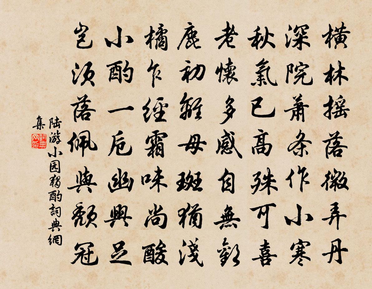 詩詞名句歷史字典書法欣賞書法字典國語詞典說文解字康熙字典古漢語字典標 題 作 者 詩 句 小園獨酌作者:陸游 朝代:宋代小園獨酌原文橫林搖落微弄丹,深院蕭條作小寒。秋氣已高殊可喜,老懷多感自無歡。鹿初離母斑猶淺,橘乍經霜味尚酸。小酌一卮幽興足,豈須落佩與頹冠?詩詞問答問:小園獨酌的作者是誰?答:陸游問:小園獨酌寫於哪個朝代?答:宋代問:陸游的名句有哪些?答:陸游名句大全陸游小園獨酌書法欣賞小園獨酌書法作品詩詞推薦秋晚雜書三十首方回〔宋代〕世稱陶謝詩,陶豈謝可比。池草固未雕,階藥已頗綺。如唐號元白,白豈元可擬。中有不同處,要與分朴詭。鄭圃郊行潘牥〔宋代〕擬欲尋詩取次行,東風放出十分晴。花時酒旆家家有,蠶月繅車處處鳴。乍可腰鐮從父老,何能手板事公卿。他年賈子明出東原採擷野蔬並詩見寄宋祁〔宋代〕東郊豐雜芼,遺我一襜盈。菊援分陽甲,滕岩下早英。溢杯同韭淪,羅案代葵烹。頓助高舂飯,兼和不糝羹。魯肱送智京長老智京普融上足也胡寅〔宋代〕人生如浮雲,片片隨所起。值遇初偶然,解散亦俄爾。識君湘水頭,凝袂衡岳里。十年去何住,新化五百里。乘興挽李少卿張耒〔宋代〕幾年林下遠埃塵,儒雅風流誰與鄰。筆尾病來猶壯健,詩情老去更清新。幽齋昔日琴書換,新冢東風草木春。懷想齊安早秋趙嘏〔唐代〕流年堪惜又堪驚,砧杵風來滿郡城。高鳥過時秋色動,征帆落處暮雲平。思家正嘆江南景,聽角仍含塞北情。此日醉吟白居易〔唐代〕醉來忘渴復忘飢,冠帶形骸杳若遺。耳底齋鍾初過後,心頭卯酒未消時。臨風朗詠從人聽,看雪閒行任馬遲。應被梅花引王哲〔元代〕少無福。早孤獨。憔翟一身無告囑。日常思。日常思。此事分明,皇天便得知。見遠促。見遠促。侍來偏親增汝祿送路少府使京兼覲侍御兄皎然〔唐代〕國賦推能吏,今朝發貢湖。佇瞻雙闕鳳,思見柏台烏。樹向秦關遠,江分楚驛孤。榮君有兄弟,相繼騁長途。游龍門分題十五首上方閣歐陽修〔宋代〕聞鍾渡寒水,共步尋雲嶂。還隨孤鳥下,卻望層林下。清梵遠猶聞,日暮空山響。鶴楊億〔宋代〕帳望青田碧草齊,帝鄉歸路阻丹梯。露濃漢苑宵猶警。雪滿梁園晝乍迷。瑞世鸞皇徒自許,繞枝烏鵲未成棲。終年演雅方岳〔宋代〕蒼鷹守株待兔,白鷺臨淵羨魚。鳲鳩婦嘆於室,蝸牛亦愛吾廬。子楚小甑中實以物餉予{稻禾換口}之如芋而味王洋〔宋代〕君不見野人謀食搜山谷,不似輸錢買金粟。醾薇細瑣俱見情,豈有靈根不收錄。少陵飢走偏九州,命寄長鑱生事足寓意十首次敬助韻 其七王冕〔元代〕蠻觸雜奔競,蠅蚋紛爭喧。鸞鳳巢枳棘,鴟鴞集琅軒。風雷久不作,野露生微寒。壯士萬里懷,肯謝漂母餐。古來玉爐三澗雪 繼重陽韻 藏頭 拆起永字馬鈺〔元代〕別鄉關寧海,持真實為*。懷三教作良朋。內日光為證。悟清清淨淨,知湛湛澄澄。中養火虎龍吞。訣傳來游泳。貓兒峰林錫翁〔宋代〕貓兒峰小眼精光,來護仙家石廩糧。回顧威風何凜凜,山中安得有拖腸。好事近·馬首望青山納蘭性德〔清代〕馬首望青山,零落繁華如此。再向斷煙衰草,認蘚碑題字。休尋折戟話當年,只灑悲秋淚。斜日十三陵下,過新豐七日逆洛夜宿延秋莊上邵雍〔宋代〕八月延秋禾熟天,農家富貴在豐年。一簞雞黍一瓢酒,誰羨王公食萬錢。偈頌一百零二首釋紹曇〔宋代〕冬至日舒長,這個長多少。虛空為尺不能量,蟭螟眼中盛恰恰相反好。盛恰好,衒惑神光,迷逢達磨。鷓鴣天 元貞元年九月初五日盧摯〔元代〕青女飛來汗漫遊。素娥相賞玉為舟。三千年也蟠桃熟,萬歲山高錦樹秋。開壽域,望神州。日華雲影思悠悠。願將名句推薦黃葉覆溪橋,荒村唯古木。柳宗元《秋曉行南谷經荒村》 別夢依依到謝家,小廊回合曲闌斜。張泌《寄人》 一年之計,莫如樹谷;十年之計,莫如樹木;終身之計,莫如樹人。管仲《管子·權修》 功名萬里外,心事一杯中。高適《送李侍御赴安西》 張翰江東去,正值秋風時。李白《送張舍人之江東》 昔時賢文,誨汝諄諄。佚名《增廣賢文·上集》 射人先射馬,擒賊先擒王。杜甫《前出塞九首·其六》 葉潤林塘密,衣乾枕席清。杜甫《水檻遣心二首》 采菱人語隔秋煙,波靜如橫練。王惲《平湖樂·采菱人語隔秋煙》 兒童漫相憶,行路豈知難。元好問《倪莊中秋》