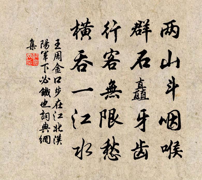詩詞名句歷史字典書法欣賞書法字典國語詞典說文解字康熙字典古漢語字典標 題 作 者 詩 句 金口步(在江北漢陽軍,下必鐵也)作者:王周 朝代:唐代原文兩山斗咽喉,群石矗牙齒。行客無限愁,橫吞一江水。詩詞問答問:《金口步(在江北漢陽軍,下必鐵也)》的作者是誰?答:王周問:該詩寫於哪個朝代?答:唐代書法欣賞金口步(在江北漢陽軍,下必鐵也)書法作品注釋全唐詩:卷765-9詩詞推薦雲安九日,鄭十八攜酒陪諸公宴杜甫〔唐代〕寒花開已盡,菊蕊獨盈枝。舊摘人頻異,輕香酒暫隨。地偏初衣夾,山擁更登危。萬國皆戎馬,酣歌淚欲垂。長相思洪适〔宋代〕柳青青。酒清清。雨腳涔涔憶渭城。一尊和淚傾。山青青。水清清。水闊山重不計程。愁堆長短亭。紹興祀大火十二首佚名〔宋代〕[黃鐘為角]有出相藏,伏見靡常。相我國家,鑒觀四方。視罔不正,終然允藏龍臥虎。神其來格,明德聲香。謝惠連徐鈞〔宋代〕千里相思一段奇,精交神契及心期。池塘春草天然句,不夢此人無此詩。托人賣馬二首陳造〔宋代〕伴我山城慣嶮巇,長因馬健感吾衰。三年粗了痴兒事,並日猶嗟灶婦炊。會見千金市龍種,可能一笑換蛾眉。還家將赴京題陵陽王氏水居杜牧〔唐代〕簾卷平蕪接遠天,暫寬行役到樽前。是非境裡有閒日,榮辱塵中無了年。山簇暮雲千野雨,江分秋水九條煙。馬蹄醉芙蓉陳簡軒〔宋代〕璚姬秋宴集蓬壺,酒暈微微上雪酥。笑倚西風渾不定,因臨流水欲相扶。綠雲香減霜初冷,紅玉痕消日又晡。妝鏡秋思陸游〔宋代〕閒愁正可資詩酒,小疾安能減食眠。一畝旋租畦菜地,千錢新買釣魚船。禁直王安石〔宋代〕翠木交陰覆兩檐,夜天如水碧湉湉。帝城風月看常好,人世悲哀老自添。偶題陳宓〔宋代〕向長不願富,折像患不貧。奇禍伏所慕,藏身有餘珍。向來東陵侯,豈似種瓜人。茫茫宇宙間,不得自由身。送朱嚴伯徐照〔宋代〕好別無愁思,風霜一歲殘。去因貧事迫,歸有暮年安。遠水維舟晚,青山繞舍寒。又誰憐靜者,得句不同看。賀鄭丞相厲寺正〔宋代〕和羹梅傍小春榮,堯陛猶餘一莢蓂。萬里雲收天鏡淨,三台星畔老人星。少年行三首·其三李白〔唐代〕君不見淮南少年遊俠客,白日球獵夜擁擲。呼盧百萬終不惜,報仇千里如咫尺。少年遊俠好經過,渾身裝束皆綺羅騎牛歌陳舜俞〔宋代〕我騎牛,君莫笑,人間萬事從吾好。千金市骨駿馬來,乘肥大躍須年少。薄為韉,草為轡,瀑布山前松徑里。看山紅梅陳景沂〔宋代〕色異味同失主張,厭寒附暖逐群芳。當知不改冰霜操,戲學陶家艷冶妝。和張秀才陳造〔宋代〕山川向晚點塵無,忽訝篩瓊屑玉鋪。巧與梅花爭便旋,試將姑射比肌膚。破寒春酒何曾釅,薦箸窮鳩不料臞。陵藉寄趙大資蘇泂〔宋代〕劉向拳拳老更忠,外家恩澤盡侯封。分明社稷蒼生計,只在平居畎畝中。阻風,泊鍾家村。離英州已三日,才行二十里楊萬里〔宋代〕南遊端為看山來,過眼勿勿首屢回。不是阻風船不進,何緣看盡萬崔嵬。送隱士游京淮釋斯植〔宋代〕送君湖柳下,未別已關情。古塞去程遠,寒江入夢清。野雲低水樹,山寸閉春城。到處逢知已,虛傳隱姓名。過荊軻冢四絕句晁說之〔宋代〕刺客傳中軻絕倫,後來尪怯寂無人。秦人更甚燕人恨,不葬燕台留葬秦。名句推薦提籠忘采葉,昨夜夢漁陽。張仲素《春閨思》 同聲相應,同氣相求。佚名《易傳·乾文言》 清香隨風發,落日好鳥歸。李白《詠鄰女東窗海石榴》 惠遠祠前晉溪水,翠葉銀花清見底。元好問《過晉陽故城書事》 驟雨過,珍珠亂撒,打遍新荷。元好問《驟雨打新荷》 風雨如晦,雞鳴不已。佚名《風雨》 相恨不如潮有信,相思始覺海非深。白居易《浪淘沙·借問江潮與海水》 所志在功名,離別何足嘆。陸龜蒙《別離》 俱往矣,數風流人物,還看今朝。 * 《沁園春·雪》 綠遍山原白滿川,子規聲里雨如煙。翁卷《鄉村四月》