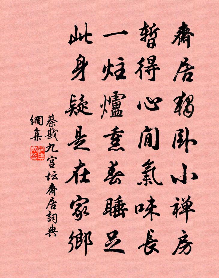 詩詞名句歷史字典書法欣賞書法字典國語詞典說文解字康熙字典古漢語字典標 題 作 者 詩 句 九宮壇齋居作者:蔡戡 朝代:宋代九宮壇齋居原文齋居獨臥小禪房,暫得心閒氣味長。一炷爐熏春睡足,此身疑是在家鄉。詩詞問答問:九宮壇齋居的作者是誰?答:蔡戡問:九宮壇齋居寫於哪個朝代?答:宋代問:九宮壇齋居是什麼體裁?答:七絕蔡戡九宮壇齋居書法欣賞九宮壇齋居書法作品詩詞推薦治圃韓維〔宋代〕久雨地氣泄,百草日以滋。勃然翳我圃,積茀不可治。遂信蕭艾質,唐突蘭蕙姿。鴻鵠不肯下,跳蛙恃而嘻。長林水調歌頭李孝光〔元代〕伯仲見伊呂,前日補天歸。平生蓋世勳業,何用藉群兒。出領繡衣龍節,入擁繡裳赤舄,名字在金閨。磊落正如此鷓鴣天·送廓之秋試辛棄疾〔宋代〕白薴新袍入嫩涼。春蠶食葉響迴廊。禹門已準桃花浪,月殿先收桂子香。鵬北海,鳳朝陽。又攜書劍路茫茫。明年賦壬一侄孫破硯艾性夫〔宋代〕山翁手持青石骨,疑是元寶瘞中物。支床搗練應不然,中裂何由半存沒。冰池既決不可隄,鏡面已破那能規。達人水調歌頭佚名〔宋代〕寶曆契昌運,岳瀆啟珍符。汾陽忠義勛閱,此際掛蓬弧。正屬陽生子月,始見蓂敷六莢,寶劍出昆吾。芒射鬥牛分立春祀太乙晏殊〔宋代〕紫毛雙節引青童,一片空歌韻曉風。太昊茲辰授春令,鶯旗應在矞雲中。偈頌一百一十七首釋紹曇〔宋代〕祖父田園,積年荒廢。農不務耕,漁專討利。徹底掀翻自有人,去盡殘蘆並敗葦。雁過長空,影沉寒水,字字聲聲爭棋方岳〔宋代〕江南底處無楊柳,海內何人解詩酒。春蓑雨濕蕙煙寒,閒卻鷗沙釣竿竹。塞雲漠漠方笞兵,油幢安用白面生。東山長夏竹中二首陳普〔宋代〕暑威赫赫甑寰區,繞屋琅玕足自娛。四面塵埃渾不受,一年炎熱竟成無。絕稀人跡天同處,閱盡詩書日未晡。為惜雜詠陸游〔宋代〕仕囷風波歸可樂,生如疣贅死何悲?極如此手終無巧,那得隨人盡作痴!挽周畏知母俞夫人二首趙蕃〔宋代〕卜兆雖自古,邇來聞見殊。一言福後嗣,百計走愚巫。用意非流俗,惟賢畢此塗。徐看好兄弟,玉立騁天衢。聖人之孝十首堯林同〔宋代〕道原自天出,堯以是相傳。曰孝悌而已,人人具此天。偈二首釋文禮〔宋代〕黃鐘才起時,九數從頭數。相將幽谷鶯啼,次第雕梁燕語。田父祭勾芒,叢祠敲社鼓。農父狎牛郎,村姑教蠶婦。齊山僧舍孫邁〔宋代〕竹密通幽逕,橋橫逐澗斜。陰崖聳圭壁,古蔓引龍蛇。寺僻虛僧磬,亭荒足免罝。紫微今不見,著意采黃花。留別周參政詩二首趙蕃〔宋代〕元佑登瀛盛古今,只今衰冷愧諸任。聖朝既有徐州相,得路仍知異日心。齷齪更無微價市,鷦鷯自愛一枝深。故同五美吟·西施曹雪芹〔清代〕一代傾城逐浪花,吳宮空自憶兒家。效顰莫笑東村女,頭白溪邊尚浣紗。和張文彥所寄二絕王洋〔宋代〕一枝一枝復一枝,造物捷敏功不遲。驥子熊兒誰得似,它年看誦少陵詩。橫吹曲辭梅花落盧照鄰〔唐代〕梅嶺花初發,天山雪未開。雪處疑花滿,花邊似雪回。因風入舞袖,雜粉向妝檯。匈奴幾萬里,春至不知來。偶蘇求至話別(後六句與送蘇紹之歸嶺南詩同)張祜〔唐代〕幾年滄海別,萬裏白頭吟。夜月江流闊,春雲嶺路深。珠繁楊氏果,翠耀孔家禽。無復天南夢,相思空樹林。句楊備〔宋代〕雲竇穿銀井,冰甃貯玉漿。名句推薦新妝宜面下朱樓,深鎖春光一院愁。劉禹錫《和樂天春詞 / 春詞》 夫以奢侈之君,御好淫僻之民,欲國無亂,不可得也。墨子《墨子·06章 辭過》 世情薄,人情惡,雨送黃昏花易落。唐婉《釵頭鳳·世情薄》 遺廟丹青落,空山草木長。杜甫《武侯廟》 故人何在,煙水茫茫。柳永《玉蝴蝶·望處雨收雲斷》 青山欲共高人語。聯翩萬馬來無數。辛棄疾《菩薩蠻·金陵賞心亭為葉丞相賦》 草長鶯飛二月天,拂堤楊柳醉春煙。高鼎《村居》 曾與美人橋上別,恨無訊息到今朝。劉禹錫《楊柳枝 / 柳枝詞》 勤苦守恆業,始有數月糧。黃燮清《秋日田家雜詠》 越梅半拆輕寒里,冰清淡薄籠藍水。和凝《菩薩蠻·越梅半拆輕寒里》