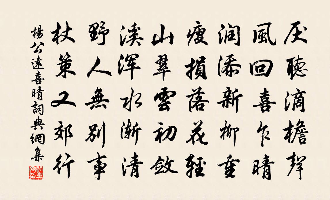 詩詞名句歷史字典書法欣賞書法字典國語詞典說文解字康熙字典古漢語字典標 題 作 者 詩 句 喜晴作者:楊公遠 朝代:宋代喜晴原文厭聽滴檐聲,風回喜乍晴。潤添新柳重,瘦損落花輕。山翠雲初斂,溪渾水漸清。野人無別事,杖策又郊行。詩詞問答問:喜晴的作者是誰?答:楊公遠問:喜晴寫於哪個朝代?答:宋代楊公遠喜晴書法欣賞喜晴書法作品詩詞推薦百媚娘(雙調)張先〔宋代〕珠闕五雲仙子。未省有誰能似。百媚算應天乞與,淨飾艷妝俱美。若取次芳華皆可意。何處比桃李。蜀被錦紋鋪水含雲寺書事六絕句楊時〔宋代〕獸駭禽鳴翳蔚中,難將此意問鴻蒙。縈迴小徑蒼苔滑,杖屨從今恐不通。燈夕二首呈劉帥劉克莊〔宋代〕陌上遊人趁筦弦,豈知君相尚籌邊。細聽野老交談處,猶記兵端未動前。草市收如許早,端門瞻蹕定何年。書生晚再韻奉酬楊公遠〔宋代〕自愧浮生又六旬,苦無情況度殘春。謾吟俚句塵清聽,多謝賡酬字字新。府公徽猷餉酒蝦方岳〔宋代〕長須翁臥瓮頭春,醉不勝扶絕可人。琥珀色濃紅透肉。珊瑚鉤嫩冷生津。欲醉野句不當價,粘出侯家總是珍。此法水調歌頭(題舫齋)李昴英〔宋代〕郭外足幽勝,潮入漲溪流。舫齋小小一葉,老子日遨遊。管領白苹紅蓼,披戴綠蓑青箬,直釣任沈浮。玉樓胞鱸膾江心長句葛紹體〔宋代〕問津城西市,呼渡江南岸。棹穩當潮生,帆輕趁風便。龍翔古招提,鳥革今輪奐。回合列翠屏,周遭鋪素練。邀行次韻汪翔甫和西城呂全州見過四首方回〔宋代〕想見花間路,籃舁草草裝。叩門馴石喜,入室蠹魚香。躡石苔粘屐,眠松露滴床。焉知人世事,積甲又宜陽。彭及之邀吳仲源楊公濟與某夜會望湖樓獨某後強至〔宋代〕月底雲樓一水湄,天光湖色兩琉璃。樽前更坐清風客,筆下爭翻白雪詞。物外骨毛應自爽,世間笑語不容追。千年和丁景仁三叉河留題贈李仲山王之道〔宋代〕飄零雙鬢已星星,萬里江湖寄此身。山擁青螺初洗雨,水浮蒼璧似圍春。別來舉廢同千古,此去榮枯會一新。葭薍居閒俞桂〔宋代〕富貴人所原,貧賤不堪憂。自有蘭蕙清,非比蕭艾羞。功名如露草,飄瓦若虛舟。千載儻相遇,皋夔及伊周。苟使洞仙歌 賦榛實屏山所錄 中州樂府王澮〔元代〕圓剛定質,混物非凡類。仁處其中靜忘意。任蝶蜂狂繞,燕雀喧爭,心君正,惟取清白自治。黃衣從淡泊,此個家恭和御製賜太師致仕文彥博五言六韻詩一首蘇頌〔宋代〕曉日清明霽,華林物色新。詔頒慈惠宴,恩厚老成人。袞冕三川客,杯觴四府臣。獻酬同飽德,愷樂盡含醇。帝惜春日雜興胡仲弓〔宋代〕幽溪幾日不曾來,半是紅香半綠苔。樂事每從忙裡過,好花偏向雨中開。慣貧可使居無竹,高隱共忻山有萊。投老山窗即景釋行海〔宋代〕陰陰苔坎亂鳴蛙,光射林霏落月斜。池面綠舖蕉葉影,露階紅遍鳳兒花。飯牛歌為鬍子徽作何夢桂〔宋代〕朝飯牛,飯牛原上草。夜飯牛,飯牛霜下藁。草香藁軟牛飽肥,黃犢跳梁犍臥噍。煙蓑雨笠犢鼻褌,髫齔飯牛今已燕余寄月窗兄三首陳著〔宋代〕昨夜還鄉已夕陽,夕陽今日已他鄉。回頭咄咄相思語,準擬東風好送將。道士王元之以詩為贈多見哀勉因以古詩為答王令〔宋代〕利劍不刺鼠,大釣不聯鮞。天昏白日沉,劍決浮雲披。地盪海水搖,釣引九鯨縻。固其用不常,安得易用為。當其宮詞一百首岳珂〔宋代〕宮簾匝地晝陰移,紅拂金壺殿腳隨。玉鳳墜釵心暗卜,聖情有喜近臣知。柯君振相別三十餘年為言親喪不能舉請賦此詩葉適〔宋代〕上淺難藏夢裡身,春花秋草幾悲辛。無人為買南山麓,月戶風欞作好隣。名句推薦數州訊息斷,愁坐正書空。杜甫《對雪》 壯心未與年俱老,死去猶能作鬼雄。陸游《書憤五首·其二》 財上分明大丈夫。佚名《增廣賢文·上集》 古人不見今時月,今月曾經照古人。佚名《增廣賢文·上集》 小雨纖纖風細細,萬家楊柳青煙里。朱服《漁家傲·小雨纖纖風細細》 寧為雞口,無為牛後。劉向《戰國策·韓一·蘇秦為楚合從說韓王》 幾時能命駕,對酒落花前。賈島《清明日園林寄友人》 保民而王,莫之能御也。孟子《孟子·梁惠王章句上·第七節》 千呼萬喚始出來,猶抱琵琶半遮面。白居易《琵琶行 / 琵琶引》 一番荷芰生池沼,檻前風送馨香。尹鶚《臨江仙·一番荷芰生池沼》