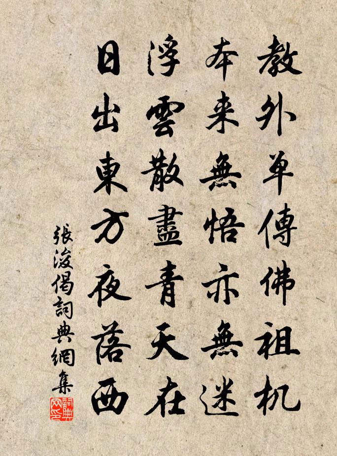 詩詞名句歷史字典書法欣賞書法字典國語詞典說文解字康熙字典古漢語字典標 題 作 者 詩 句 偈作者:張浚 朝代:宋代偈原文教外單傳佛祖機,本來無悟亦無迷。浮雲散盡青天在,日出東方夜落西。詩詞問答問:偈的作者是誰?答:張浚問:偈寫於哪個朝代?答:宋代張浚偈書法欣賞偈書法作品詩詞推薦和路樞四首胡寅〔宋代〕圖書雖是舊生涯,翰墨那能剡國華。戲彩便甘甜五馬,退朝猶想覆千花。先民事業高三代,將聖春秋自一家。他日送人游玉泉寺齊己〔唐代〕西峰大雪開,萬疊向空堆。客貴猶尋去,僧高肯不來。潭澄猿覷月,竇冷鹿眠苔。公子將才子,聯題興未回。五月二十一日風雨大作陸游〔宋代〕風雨縱橫夜徹明,須臾更覺勢如傾。出門已絕近村路,對面不聞高語聲。銜舳江關多蜀估,宿師淮浦飽吳粳。老民宮詞一百首岳珂〔宋代〕雒壇爟火夜升煙,鹵簿如雲繡色鮮。萬姓歡呼感泣,此生重遇太平年。送松風僧淵中二公遊方薛嵎〔宋代〕無累雲相似,悠悠天地間。新秋生遠思,此去未應遠。撼錫驚棲鶴,聽松思故山。吟詩與說法,同是一機關。遊仙二十四首吳筠〔唐代〕啟冊觀往載,搖懷考今情。終古已寂寂,舉世何營營。悟彼眾仙妙,超然含至精。凝神契沖玄,化服凌太清。心同有懷獨孤景略陸游〔宋代〕富貴世間元不乏,此君才大獨難成。喑嗚意氣千人廢,嫻雅風流一座傾。韜略豈勞平大敵,文章亦足主齊盟。荒山濟源寒食孟郊〔唐代〕風巢裊裊春鴉鴉,無子老人仰面嗟。柳弓葦箭覷不見,高紅遠綠勞相遮。女嬋童子黃短短,耳中聞人惜春晚。逃蜂示李叔時二首王安石〔宋代〕千山訪我幾摧輈,清坐來看十日留。勢利白頭何足道,古人傾蓋有綢繆。秋夜梁七兵曹同宿二首錢起〔唐代〕一笑不可得,同心相見稀。摘菱頻貰酒,待月未扃扉。星影低驚鵲,蟲聲傍旅衣。卑棲歲已晚,共羨雁南飛。好欲訪隱者陸游〔宋代〕湖曲有隱者,時時容叩門。人如釣渭叟,地似避秦村。笑語囂麈遠,衣冠古制存。山寒歸路晚,相與盡瓢樽。淳熙二年發太上皇帝太上皇后冊寶十一首佚名〔宋代〕丕在文王,之德之純。亦有太姒,式揚徽音。維冊維寶,迺玉迺金。伊誰從之,一人事親。贈雷鄉張明府曹松〔唐代〕任官征戰後,度日寄閒身。封卷還高客,飛書問野人。廢田教種穀,生路遣尋薪。若起柴桑興,無先漉酒巾。暮春同劉伯壽史誠之飲宋叔在園司馬光〔宋代〕絮狂飛作團,梅小不多酸。共惜余春好,更窮今日歡。清流入花底,翠嶺出林端。嫩筍玉縈著,新櫻珠照肋。邀迎王中庸赴河南鞏縣尉楊億〔宋代〕春風祖席引香醪,白馬驪駒草色袍。官舍前鹽兩京道,居民半雜五陵豪。卑飛碌碌猶棲棘,餘地飄飄暫鼓刀。捧檄春日書事五首韓元吉〔宋代〕曉猿夜鶴寂無生,春至山禽百種鳴。步繞新泉聊洗耳,由來心與地俱清。和叔崇橘花韻二首王柏〔宋代〕清和景氣已非春,午陰濃處延詩人。一杯佳茗沃嘉話,粲然三禮羞蘩苹。洞庭手植清香發,金粟銀須照膚雪。薰風石城鄭谷〔唐代〕石城昔為莫愁鄉,莫愁魂散石城荒。江人依舊棹舴艋,江岸還飛雙鴛鴦。帆去帆來風浩渺,花開花落春悲涼。煙濃毀鄧艾廟洪咨夔〔宋代〕蜀庸無與守,魏吃浪成名。血已洿砧機,魂猶饕酒牲。柏溪融雪瀉,玉案倚雲橫。瀦薙莫留跡,山川方氣平。漁父詞(其四)佚名〔宋代〕滿湖飛雪攪長空。急起呼兒上短篷。蓑笠具,晝圖同。釺笛聲長曲未終。名句推薦獨睡起來情悄悄,寄愁何處好。納蘭性德《謁金門·風絲裊》 聖人不責人無過,唯多方誘之改過,庶人心可回也。王永彬《圍爐夜話·第二四則》 關城榆葉早疏黃,日暮雲沙古戰場。王昌齡《從軍行七首》 心似已灰之木,身如不系之舟。蘇軾《自題金山畫像》 林花謝了春紅,太匆匆。無奈朝來寒雨晚來風。李煜《相見歡·林花謝了春紅》 休問梁園舊賓客,茂陵秋雨病相如。李商隱《寄令狐郎中》 採蓮南塘秋,蓮花過人頭。佚名《西洲曲》 肅肅花絮晚,菲菲紅素輕。杜甫《春遠 / 春運》 咬定青山不放鬆,立根原在破岩中。鄭燮《竹石》 青天有月來幾時?我今停杯一問之。李白《把酒問月·故人賈淳令予問之》